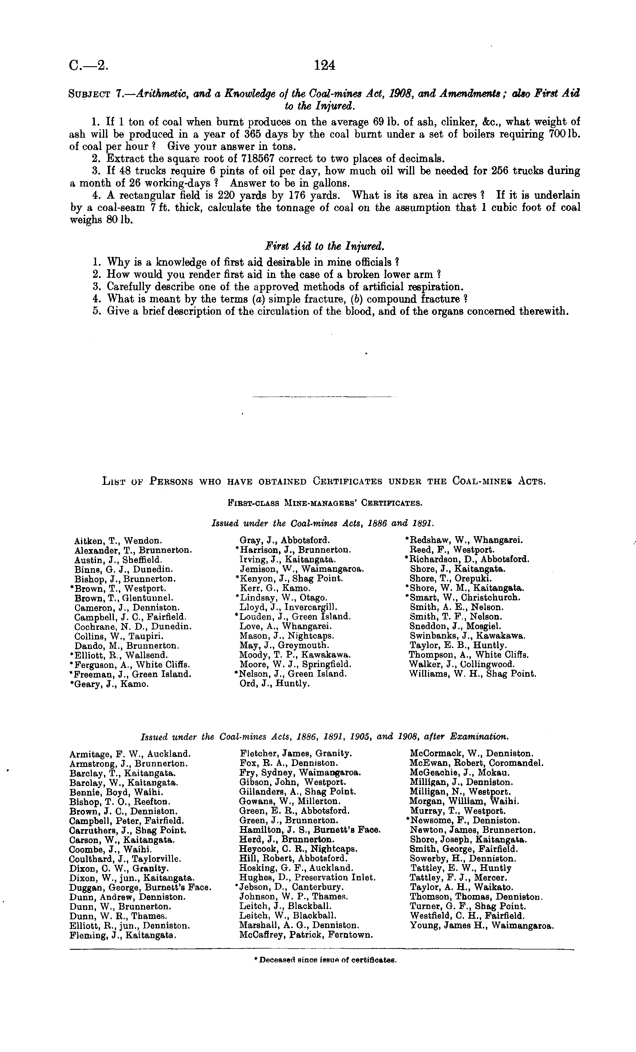 Subject 7. — Arithmetic, and a Knowledge of the Coal-mines Act, 1908, and Amendments; also First Aid to the Injured. 1. If 1 ton of coal when burnt produces on the average, 69 lb. of ash, clinker, &c, what weight of ash will be produced in a year of 365 days by the coal burnt under a set of boilers requiring 7001b. of coal per hour ? Give your answer in tons. 2. Extract the square root of 718567 correct to two places of decimals. 3. If 48 trucks require 6 pints of oil per day, how much oil will be needed for 256 trucks during a month of 26 working-days ? Answer to be in gallons. 4. A rectangular field is 220 yards by 176 yards. What is its area in acres ? If it is underlain by a coal-seam 7 ft. thick, calculate the tonnage of coal on the assumption that 1 cubic foot of coal weighs 80 lb. First Aid to the Injured. 1. Why is a knowledge of first aid desirable in mine officials ? 2. How would you render first aid in the case of a broken lower arm ? 3. Carefully describe one of the approved methods of artificial respiration. 4. What is meant by the terms (a) simple fracture, (6) compound fracture ? 5. Give a brief description of the circulation of the blood, and of the organs concerned therewith.