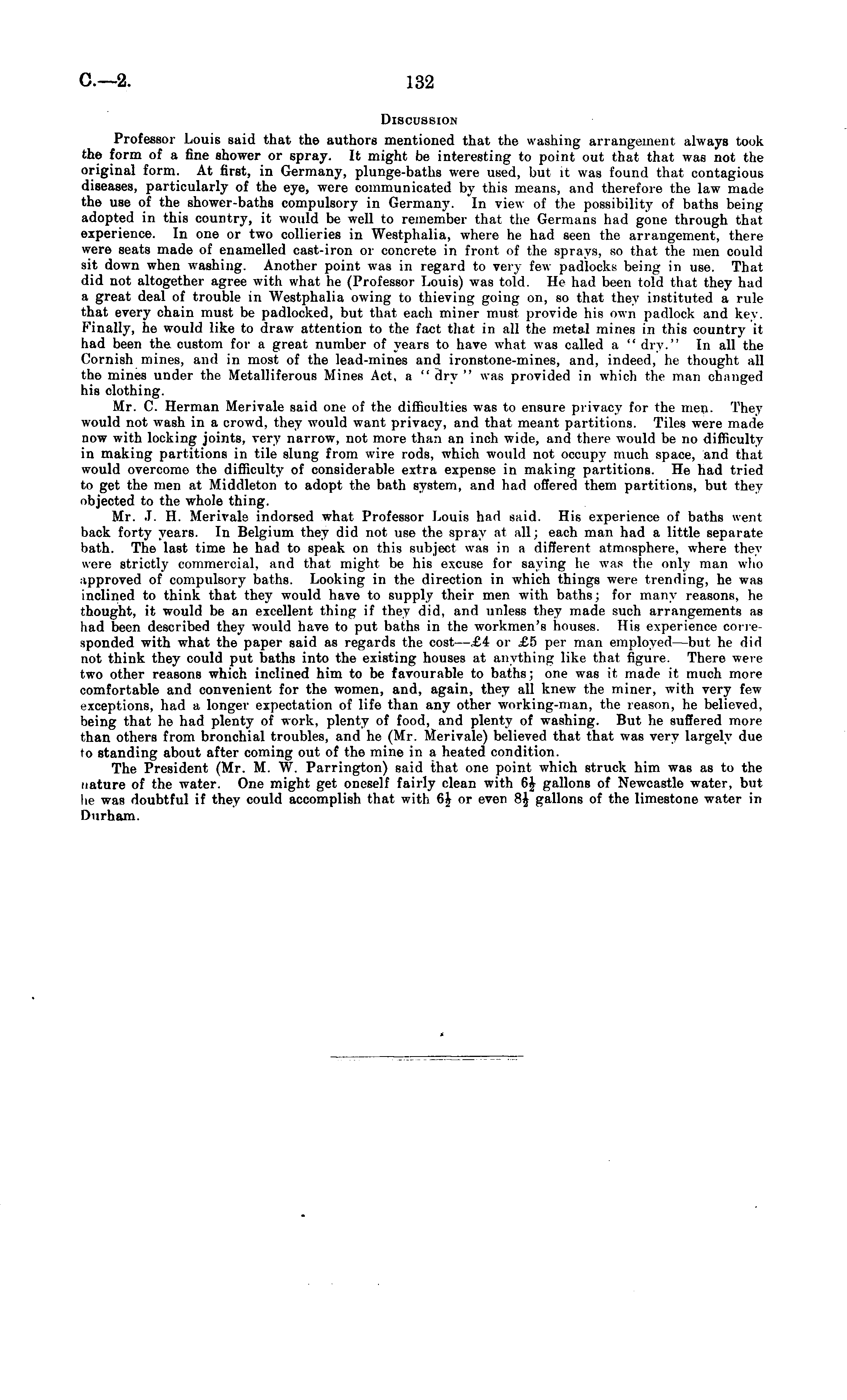 Discussion Professor Louis said that the authors mentioned that the washing arrangement always took the form of a fine shower or spray. It might be interesting to point out that that was not the original form. At first, in Germany, plunge-baths were used, but it was found that contagious diseases, particularly of the eye, were communicated by this means, and therefore the law made the use of the shower-baths compulsory in Germany. In view of the possibility of baths beinjr adopted in this country, it would be well to remember that the Germans had gone through that experience. In one or two collieries in Westphalia, where he had seen the arrangement, there were seats made of enamelled cast-iron or concrete in front of the sprays, so that the men could sit down when washing. Another point was in regard to very few padlocks being in use. That did not altogether agree with what he (Professor Louis) was told. He had been told that they had a great deal of trouble in Westphalia owing to thieving going on, so that they instituted a rule that every chain must be padlocked, but that each miner must provide his own padlock and key. Finally, he would like to draw attention to the fact that in all the metal mines in this country it had been the custom for a great number of years to have what was called a " dry." In all the Cornish mines, and in most of the lead-mines and ironstone-mines, and, indeed, he thought all the mines under the Metalliferous Mines Act, a " dry " was provided in which the man changed his clothing. Mr. C. Herman Merivale said one of the difficulties was to ensure privacy for the men. They would not wash in a crowd, they would want privacy, and that meant partitions. Tiles were made now with locking joints, very narrow, not more than an inch wide, and there would be no difficulty in making partitions in tile slung from wire rods, which would not occupy much space, and that would overcome the difficulty of considerable extra expense in making partitions. He had tried to get the men at Middleton to adopt the bath system, and had offered them partitions, but they objected to the whole thing. Mr. J. H. Merivals indorsed what Professor Louis had said. His experience of baths went back forty years. In Belgium they did not use the spray at all; each man had a little separate bath. The last time he had to speak on this subject was in a different atmosphere, where they were strictly commercial, and that might be his excuse for saying he was the only man who approved of compulsory baths. Looking in the direction in which things were trending, he was inclined to think that they would have to supply their men with baths; for many reasons, he thought, it would be an excellent thing if they did, and unless they made such arrangements as had been described they would have to put baths in the workmen's houses. His experience corresponded with what the paper said as regards the cost — £i or £5 per man employed—but he did not think they could put baths into the existing houses at anything like that figure. There were two other reasons which inclined him to be favourable to baths; one was it made it much more comfortable and convenient for the women, and, again, they all knew the miner, with very few exceptions, had a longer expectation of life than any other working-man, the reason, he believed, being that he had plenty of work, plenty of food, and plenty of washing. But he suffered more than others from bronchial troubles, and he (Mr. Merivale) believed that that was very largely due to standing about after coming out of the mine in a heated condition. The President (Mr. M. W. Parrington) said that one point which struck him was as to the nature of the water. One might get oneself fairly clean with 6J gallons of Newcastle water, but he was doubtful if they could accomplish that with 6J or even 8J gallons of the limestone water in Durham.