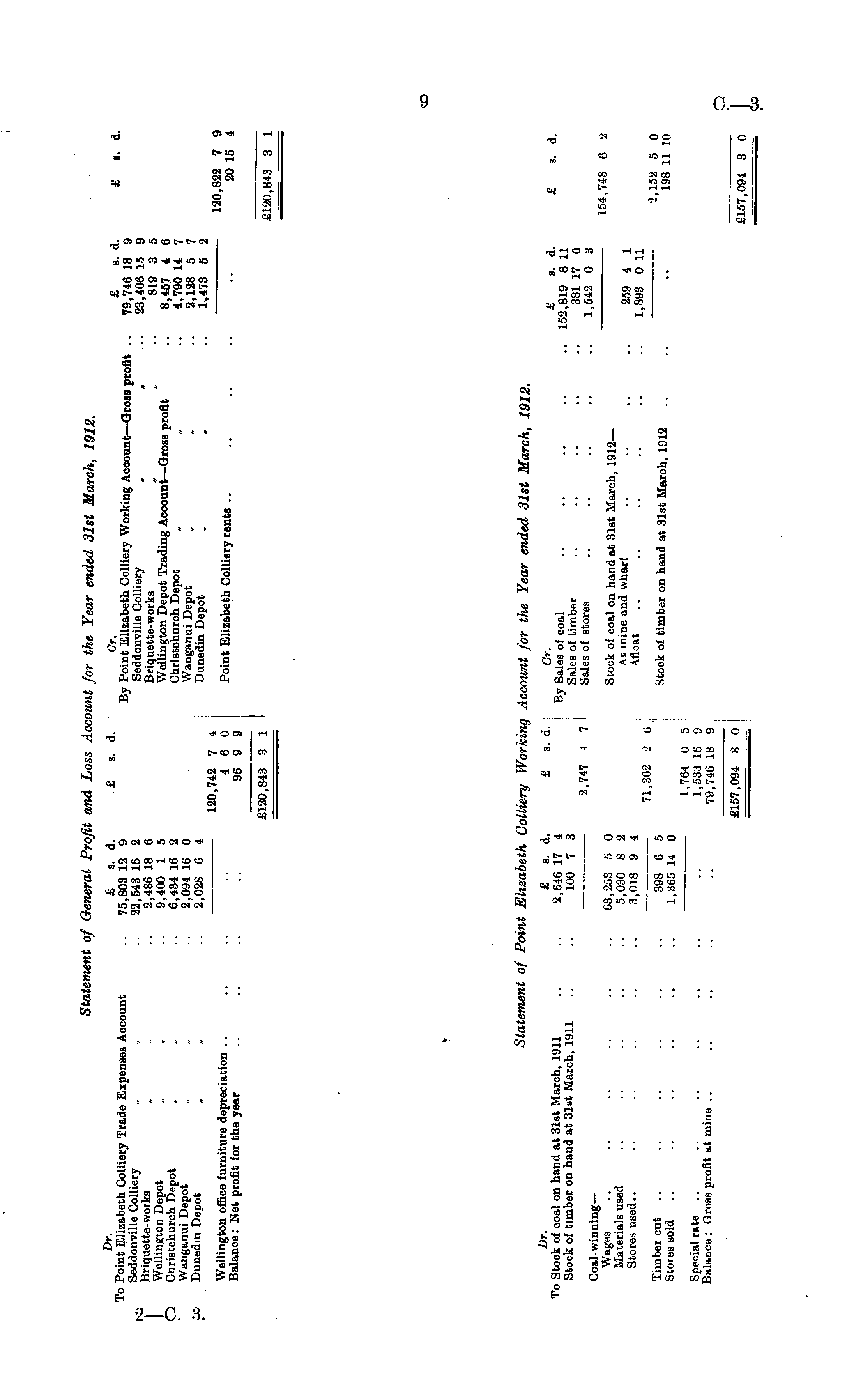 Statement of General Profit and Loss Account for the Year ended 31st March, 1912. ■ Dr - £s.d.£ s. d. Or. £sd £ s d To Point Elizabeth Colliery Trade Expenses Aocount .. 75,803 12 9 By Point Elizabeth Colliery Working Account— Gross profit 79 746 18 9 Seddonville Colliery . .. 22,543 16 2 Seddonville Colliery . 23*406 15 9 Briquette-works „„ .. 2,436 18 6 Briquette-works „ " ' Bl g 3 5 Wellington Depot . .. 9,400 1 5 Wellington Depot Trading Account-Gross profit " .'.' 8,457 4 6 Cnnstchurch Depot . .. 6,434 16 2 Christchurch Depot . 4 790 14 7 Wangauui Depot „ „ .. 2,094 16 0 Wanganui Depot " " 2128 5 7 Dunedin Depot .. . .. 2,028 6 4 Dunedin Depot . " " i'4 73 s 2 120,742 7 4 120 000 7 q Wellington office furniture depreciation .. .. .. .. 46 0 Point Elizabeth Colliery rents .. .. ' on 1k 1 Balance: Net profit for the year ...... .. 96 9 9 .... .. m 15 4 £120,343 3 1 £120,843 3 1 Statement of Point Elizabeth Colliery Working Account for the Year ended 31st March, 1912. Dr - £ s. d. £ s. d. Cr. g „ a c a To Stock of coal on hand at 31st March, 1911 .. .. 2,646 17 4 By Sales of coal 1 >s<> fii q a 11 Stock of timber on hand at 31st March, 1911 .. 100 7 3 Sales of timber .. .. " " 381 17 0 „ , . 2,747 4 7 Sales of stores .. .. .. \\ 1 542 0 4 Coal-winning— '• _____ .r, Wtt S es ,•• 63,253 5 0 Btock of coal on hand at 31st March, 1912- 154,743 6 2 Materials used .. .. .. .. .. 5,030 8 2 At mine and wharf .. 219 4 1 Storeaused 3,018 9 4 Afloat , S oo oil ",302 26 " •• I,Wd " U » lfi „ - „ Timber cut 398 6 5 Stock of timber on hand at 31st March, 1912 . 198 11 in Stores sold .. .. .. .. .. .. 1,365 14 0 ** i»B 11 iO 1,764 0 5 Special rate .. .. .. .. .. .. .. 1,53 a ig 9 Balance : Gross profit at mine .. .. .. .. .. 79 745 ig 9 £157,094~7~0~ 3 0