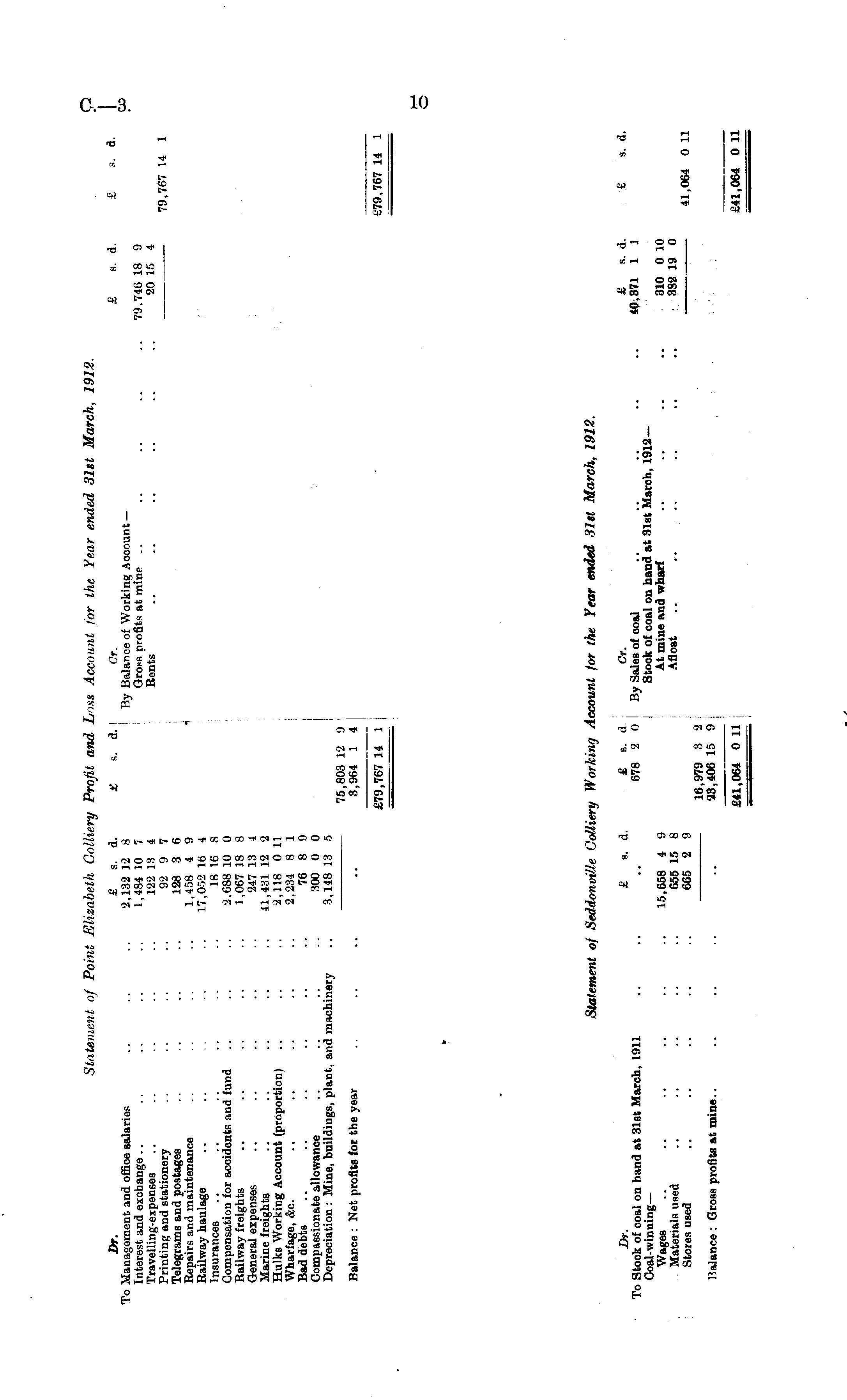 Statement of Point Elizabeth Colliery Profit and Loss Account tor the Year ended 31st March, 1912. Dr. £ s. d. £ s. d. Gr. £ s. d. £ s. d. fo Management and office salaries .. .. .. 2,132 12 8 By Balance of Working AccountInterest and exchange.. .. .. .. 1,484 10 7 Gross profits at mine .. .. .. .. .. 79,746 18 9 Travelling-expenses .. .. .. .. .. 122 13 4 Bents' .. .. .. .. .. .. 20 15 4 Printing and stationery .. .. .. 92 9 7 79,767 14 1 Telegrams and postages .. .. .. .. 128 3 6 Repairs and maintenance .. .. .. 1,458 4 9 Railway haulage .. .. .. .. 17,052 16 4 Insurances .. .. .. .. .. .. 18 16 8 Compensation for accidents and fund .. .. 10 0 Railway freights .. .. .. .. .. 1,067 18 8 General expenses .. .. .. .. .. 247 13 1 Marine freights .. .. .. .. .. 41,431 12 2 Hulks Working Account (proportion) .. .. .. 2,118 Oil Wharfage, &c. .. .. .. .. .. 2,234 8 1 Bad debts .. .. .. .. .. .. 76 8 9 Compassionate allowance .. .. .. .. 300 0 0 Depreciation: Mine, buildings, plant, and machinery .. 3,148 13 5 75,803 12 9 Balance : Net profits for the year .. .. .. .. 3,964 1 4 £79,767 14 1 £79,767 14 1 Statement of Seddonville Colliery Working Account for the Year ended Hist March, 1912. Dr. £ s. d. £ s. d. ■ Gr. £ s. d. £ s. d. To Stock of coal on hand at 31st March, 1911 .. .. .. 678 2 0 ! By Sales of coal .. .. .. .. .. 40,371 1 1 Coal-winning— Btock of coal on band at 31st March, 1912 — Wages .. .. .. .. .. 15,658 4 9 At mine and wharf .. .. .. .. 310 0 10 Materials used .. .. .. .. .. 655 15 8 Afloat .. .. .. .. .. .. 332 19 0 Stores used .. .. .. .. 665 2 9 41,064 0 11 — 16,979 8 2 Balance: Gross profits at mine.. .. .. .. .. 23,406 15 9 £41,064 0 11 ; £41,064 0 11