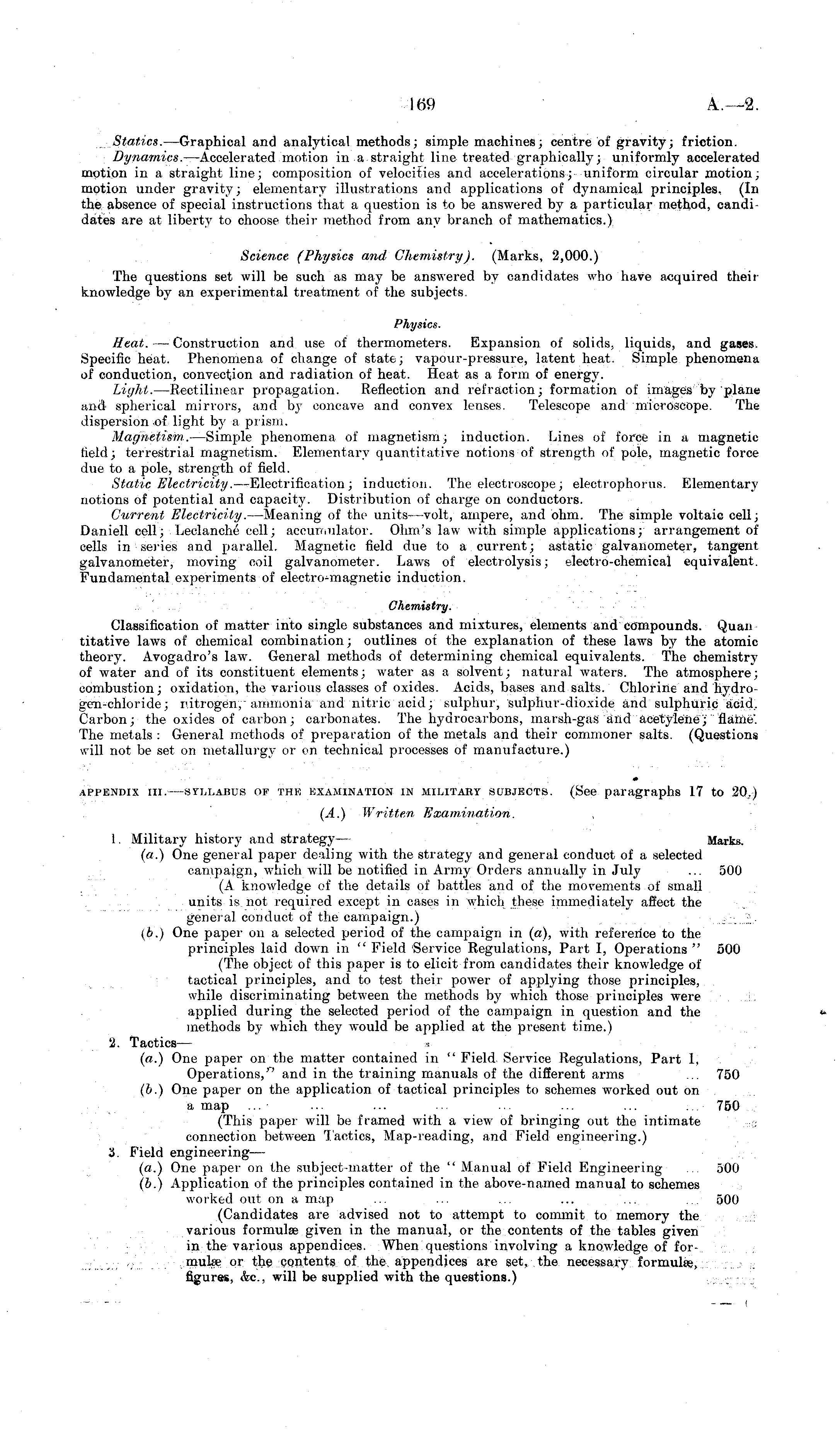 Statics. —Graphical and analytical methods; simple machines; centre of gravity; friction. Dynamics.— Accelerated motion in a straight line treated graphically; uniformly accelerated motion in a straight line; composition of velocities and accelerations; uniform circular motion; motion under gravity; elementary illustrations and applications of dynamical principles, (In the absence of special instructions that a question is to be answered by a particular method, candi dates are at liberty to choose their method from any branch of mathematics.) Science (Physics and Chemistry). (Marks, 2,000.) The questions set will be such as may be answered by candidates who have acquired their knowledge by an experimental treatment of the subjects. Physics. Heat. —Construction and use of thermometers. Expansion of solids, liquids, and gases. Specific heat. Phenomena of change of state; vapour-pressure, latent heat. Simple phenomena of conduction, convection and radiation of heat. Heat as a form of energy. Light. —Rectilinear propagation. Reflection and refraction; formation of images by plane and- spherical mirrors, and by concave and convex lenses. Telescope and microscope. The dispersion .of light by a prism. Magnetism. —Simple phenomena of magnetism; induction. Lines of force in a magnetic field; terrestrial magnetism. Elementary quantitative notions of strength of pole, magnetic force due to a pole, strength of field. Static Electricity. —Electrification; induction. The electroscope; electrophorus. Elementary notions of potential and capacity. Distribution of charge on conductors. Current Electricity. —Meaning of the units —volt, ampere, and ohm. The simple voltaic cell; Daniell cell; Leclanche cell; accumulator. Ohm's law with simple applications; arrangement of cells in series and parallel. Magnetic field due to a current; astatic galvanometer, tangent galvanometer, moving coil galvanometer. Laws of electrolysis; electro-chemical equivalent. Fundamental experiments of electro-magnetic induction. ' Chemistry. Classification of matter into single substances and mixtures, elements and compounds. Quan titative laws of chemical combination; outlines of the explanation of these laws by the atomic theory. Avogadro's law. General methods of determining chemical equivalents. The chemistry of water and of its constituent elements; water as a solvent; natural waters. The atmosphere; combustion; oxidation, the various classes of oxides. Acids, bases and salts. Chlorine and hydro-gen-chloride; nitrogen," ammonia and nitric acid; sulphur, sulphur-dioxide and sulphuric acid;. Carbon; the oxides of carbon; carbonates. The hydrocarbons, marsh-gas and acetylene; flame". The metals : General methods of preparation of the metals and their commoner salts. (Questions will not be set on metallurgy or on technical processes of manufacture.) appendix in. —stllabus of the EXAMINATION in military SUBJECTS. (See paragraphs 17 to 20.) (-4.) Written Examination. 1. Military history and strategy — Marks. (a.) One general paper dealing with the strategy and general conduct of a selected campaign, which will be notified in Army Orders annually in July ... 500 (A knowledge of the details of battles and of the movements of small units is not required except in cases in which these immediately affect the general conduct of the campaign.) .;•:.■....'}..■ (b.) One paper on a selected period of the campaign in (a), with reference to the principles laid down in " Field 'Service Regulations, Part I, Operations " 500 (The object of this paper is to elicit from candidates their knowledge of tactical principles, and to test their power of applying those principles, while discriminating between the methods by which those principles were . ...i. applied during the selected period of the campaign in question and the methods by which they would be applied at the present time.) 2. Tactics — . (a.) One paper on the matter contained in " Field. Service Regulations, Part I, Operations," and in the training manuals of the different arms ... 750 (b.) One paper on the application of tactical principles to schemes worked out on a map ... • ... ... ... ... ... ... ... 750 (This paper will be framed with a view of bringing out the intimate ~s connection between Tactics, Map-reading, and Field engineering.) i>. Field engineering— (a.) One paper on the subject-matter of the " Manual of Field Engineering ... 500 (b.) Application of the principles contained in the above-named manual to schemes worked out on a map ... ... ... ... ... ... 500 (Candidates are advised not to attempt to commit to memory the various formulas given in the manual, or the contents of the tables given in the various appendices. When questions involving a knowledge of for-. ,/ mulse or the contents of the, appendices are set, the necessary formulas, figures, &c., will be supplied with the questions.)