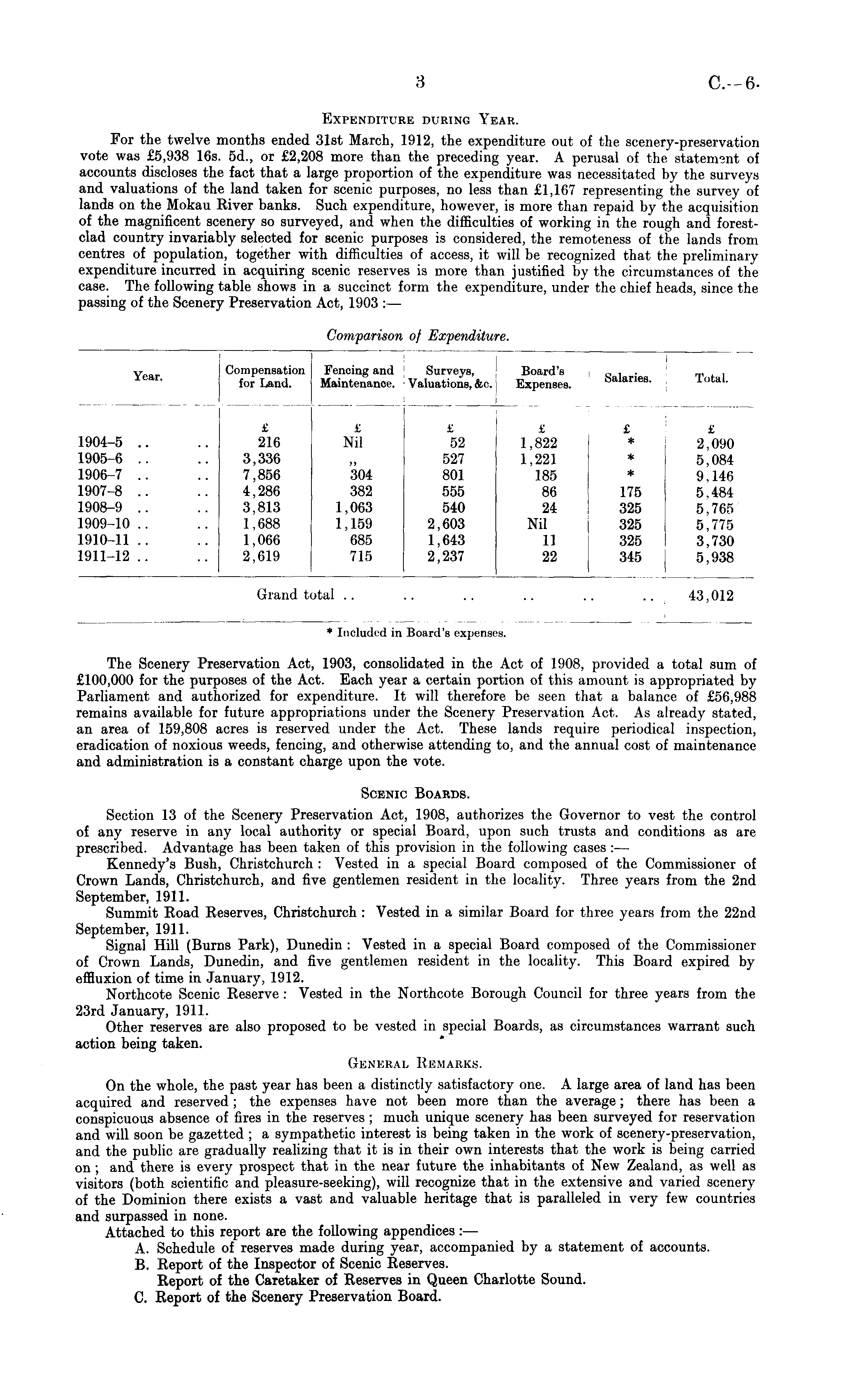 The Scenery Preservation Act, 1903, consolidated in the Act of 1908, provided a total sum of £100,000 for the purposes of the Act. Each year a certain portion of this amount is appropriated by Parliament and authorized for expenditure. It will therefore be seen that a balance of £56,988 remains available for future appropriations under the Scenery Preservation Act. As already stated, an area of 159,808 acres is reserved under the Act. These lands require periodical inspection, eradication of noxious weeds, fencing, and otherwise attending to, and the annual cost of maintenance and administration is a constant charge upon the vote. Scenic Boards. Section 13 of the Scenery Preservation Act, 1908, authorizes the Governor to vest the control of any reserve in any local authority or special Board, upon such trusts and conditions as are prescribed. Advantage has been taken of this provision in the following cases : — Kennedy's Bush, Christchurch : Vested in a special Board composed of the Commissioner of Crown Lands, Christchurch, and five gentlemen resident in the locality. Three years from the 2nd September, 1911. Summit Road Reserves, Christchurch : Vested in a similar Board for three years from the 22nd September, 1911. Signal Hill (Burns Park), Dunedin : Vested in a special Board composed of the Commissioner of Crown Lands, Dunedin, and five gentlemen resident in the locality. This Board expired by effluxion of time in January, 1912. Northcote Scenic Reserve : Vested in the Northcote Borough Council for three years from the 23rd January, 1911. Other reserves are also proposed to be vested in special Boards, as circumstances warrant such action being taken. General Remarks. On the whole, the past year has been a distinctly satisfactory one. A large area of land has been acquired and reserved; the expenses have not been more than the average; there has been a conspicuous absence of fires in the reserves ; much unique scenery has been surveyed for reservation and will soon be gazetted ; a sympathetic interest is being taken in the work of scenery-preservation, and the public are gradually realizing that it is in their own interests that the work is being carried on ; and there is every prospect that in the near future the inhabitants of New Zealand, as well as visitors (both scientific and pleasure-seeking), will recognize that in the extensive and varied scenery of the Dominion there exists a vast and valuable heritage that is paralleled in very few countries and surpassed in none. Attached to this report are the following appendices : — A. Schedule of reserves made during year, accompanied by a statement of accounts. B. Report of the Inspector of Scenic Reserves. Report of the Caretaker of Reserves in Queen Charlotte Sound. C. Report of the Scenery Preservation Board.