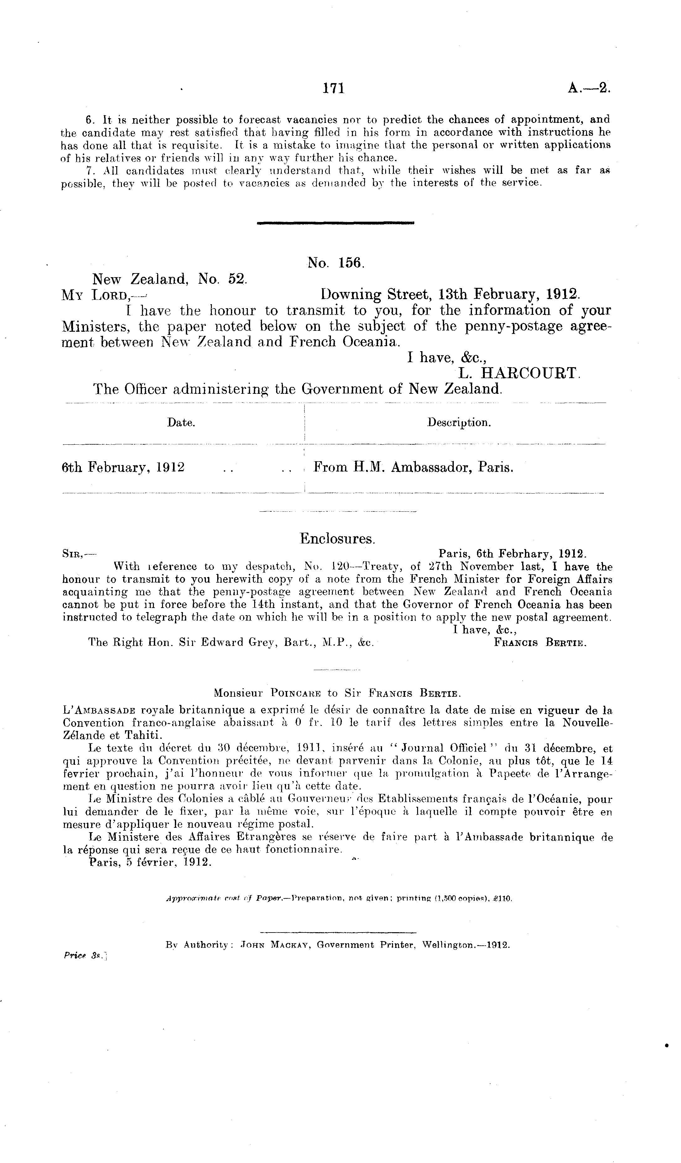 No. 156. New Zealand, No. 52. My Lord, — Downing Street, 13th February, 1912. I have the honour to transmit to you, for the information of your Ministers, the paper noted below on the subject of the penny-postage agreement between New Zealand and French Oceania. I have, &c, L. HARCOURT The Officer administering the Government of New Zealand. Date. Description, 6th February, 1912 .. .. From H.M. Ambassador, Paris. Enclosures. Sir,— Paris, 6th Febrhary, 1912. With reference to my despatch, No. 120—Treaty, of 27th November last, I have the honour to transmit to you herewith copy of a note from the French Minister for Foreign Affairs acquainting me that the penny-postage agreement between New Zealand and French Oceania cannot be put in force before the 14th instant, and that the Governor of French Oceania has been instructed to telegraph the date on which he will be in a position to apply the new postal agreement. I have, &c, The Right Hon. Sir Edward Grey, Bart., M.P., &c. Francis Bertie. Monsieur Poincare to Sir Francis Bertie. L'Ambassade royale britannique a exprime le d£sir de connaitre la date de mise en vigueur de la Convention franco-anglaise abaissant a 0 fr. 10 le tarif dcs lettres simples entre la NouvelleZelande et Tahiti. Le texte dv decret dv 30 decembre, 1911. in sere an "Journal Offlciel " dv 31 decembre, et gui approuve la Convention precitee, ne devant parvenir dans la Colonie, au plus tot, que le 14 fevrier prochain, j'ai l'honneur de vous informer que la promulgation a Papeete de I'Arrangement en question ne pourra avoir lieu qua cette date. Le Ministre dcs Colonies a cable au Gouverneui , dcs Etablissements francais de l'Oceanie, pour lvi demander de le fixer, par la meme voie, sur l'epoque a laquelle il compte pouvoir etre en mesure d'appliquer le nouveau regime postal. Le Ministere dcs Affaires Etrangeres se reserve de faire part a I'Ambassade britannique de la gui sera recue de cc haut fonctionnaire. Paris, 5 fevrier, 1912.