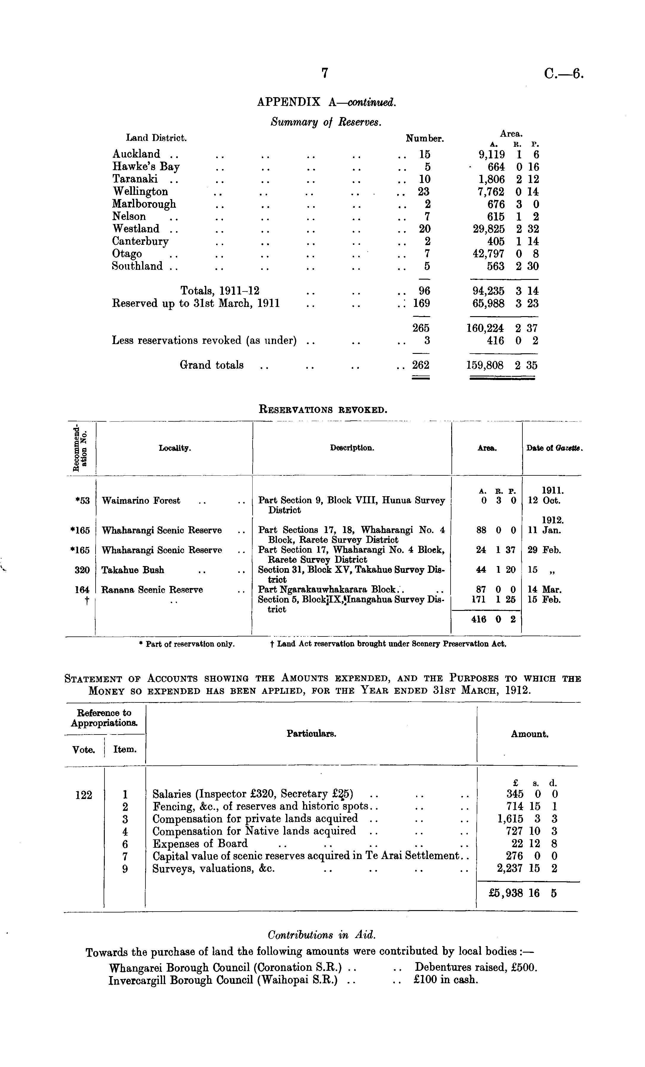 Contributions in Aid. Towards the purchase of land the following amounts were contributed by local bodies :— Whangarei Borough Council (Coronation S.R.) .. .. Debentures raised, £500. Invercaigill Borough Council (Waihopai S.R.) .. .. £100 in cash.