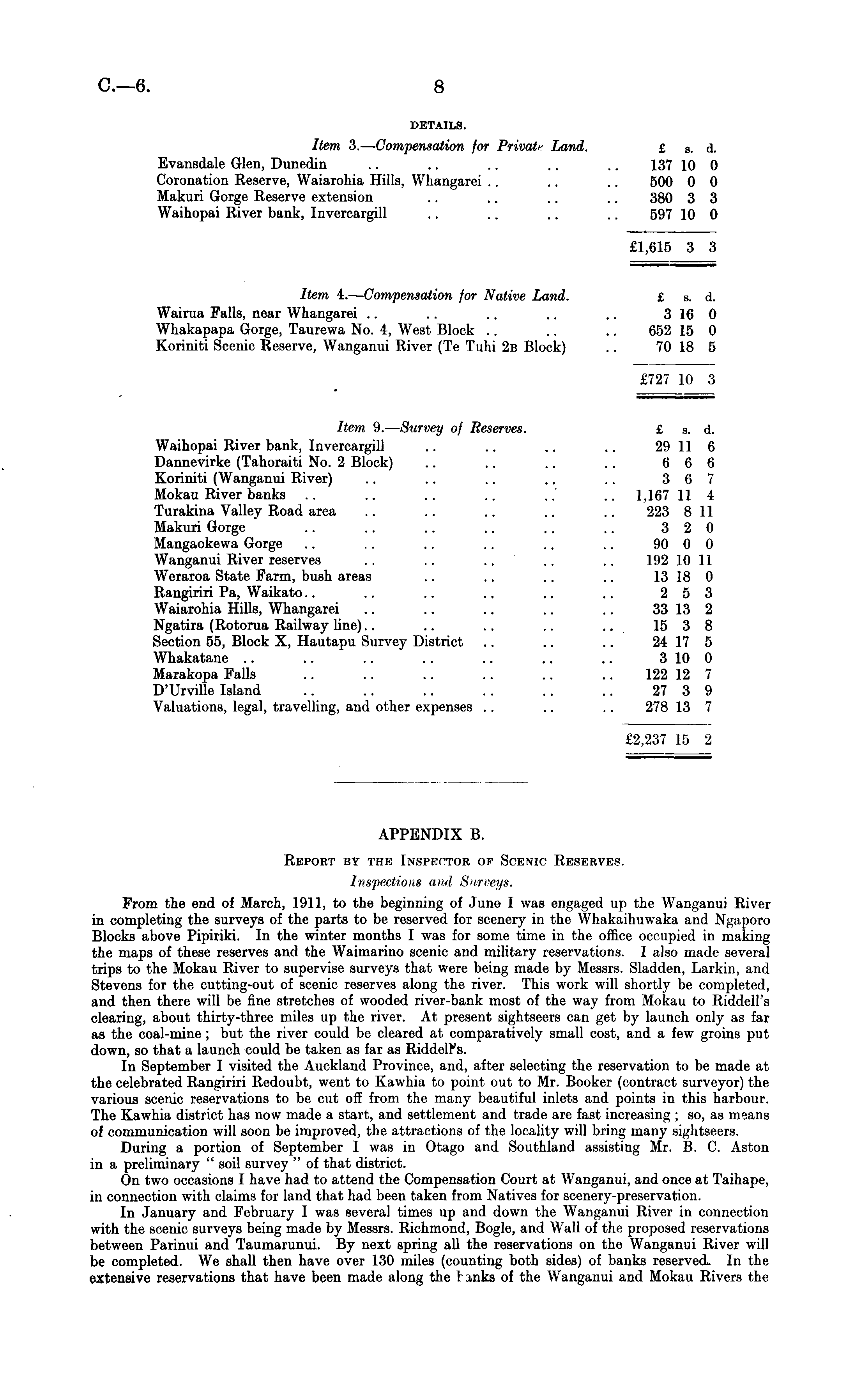 APPENDIX B. Report by the Inspector of Scenic Reserves. Inspections and Surveys. From the end of March, 1911, to the beginning of June I was engaged up the Wanganui River in completing the surveys of the parts to be reserved for scenery in the Whakaihuwaka and Ngaporo Blocks above Pipiriki. In the winter months I was for some time in the office occupied in making the maps of these reserves and the Waimarino scenic and military reservations. I also made several trips to the Mokau River to supervise surveys that were being made by Messrs. Sladden, Larkin, and Stevens for the cutting-out of scenic reserves along the river. This work will shortly be completed, and then there will be fine stretches of wooded river-bank most of the way from Mokau to Riddell's clearing, about thirty-three miles up the river. At present sightseers can get by launch only as far as the coal-mine ; but the river could be cleared at comparatively small cost, and a few groins put down, so that a launch could be taken as far as RiddelFs. In September I visited the Auckland Province, and, after selecting the reservation to be made at the celebrated Rangiriri Redoubt, went to Kawhia to point out to Mr. Booker (contract surveyor) the various scenic reservations to be cut off from the many beautiful inlets and points in this harbour. The Kawhia district has now made a start, and settlement and trade are fast increasing ; so, as means of communication will soon be improved, the attractions of the locality will bring many sightseers. During a portion of September I was in Otago and Southland assisting Mr. B. C. Aston in a preliminary " soil survey " of that district. On two occasions I have had to attend the Compensation Court at Wanganui, and once at Taihape, in connection with claims for land that had been taken from Natives for scenery-preservation. In January and February I was several times up and down the Wanganui River in connection with the scenic surveys being made by Messrs. Richmond, Bogle, and Wall of the proposed reservations between Parinui and Taumarunui. By next spring all the reservations on the Wanganui River will be completed. We shall then have over 130 miles (counting both sides) of banks reserved. In the extensive reservations that have been made along the hinks of the Wanganui and Mokau Rivers the