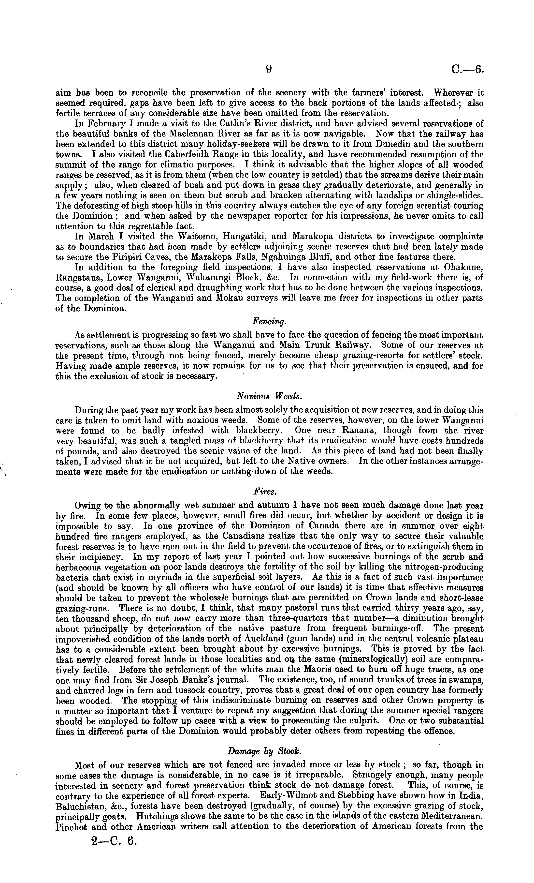aim has been to reconcile the preservation of the scenery with the farmers' interest. Wherever it seemed required, gaps have been left to give access to the back portions of the lands affected ; also fertile terraces of any considerable size have been omitted from the reservation. In February I made a visit to the Catlin's River district, and have advised several reservations of the beautiful banks of the Maclennan River as far as it is now navigable. Now that the railway has been extended to this district many holiday-seekers will be drawn to it from Dunedin and the southern towns. I also visited the Caberfeidh Range in this locality, and have recommended resumption of the summit of the range for climatic purposes. I think it advisable that the higher slopes of all wooded ranges be reserved, as it is from them (when the low country is settled) that the streams derive their main supply; also, when cleared of bush and put down in grass they gradually deteriorate, and generally in a few years nothing is seen on them but scrub and bracken alternating with landslips or shingle-slides. The deforesting of high steep hills in this country always catches the eye of any foreign scientist touring the Dominion ; and when asked by the newspaper reporter for his impressions, he never omits to call attention to this regrettable fact. In March I visited the Waitomo, Hangatiki, and Marakopa districts to investigate complaints as to boundaries that had been made by settlers adjoining scenic reserves that had been lately made to secure the Piripiri Caves, the Marakopa Falls, Ngahuinga Bluff, and other fine features there. In addition to the foregoing field inspections, I have also inspected reservations at Ohakune, Rangataua, Lower Wanganui, Waharangi Block, &c. In connection with my field-work there is, of course, a good deal of clerical and draughting work that has to be done between the various inspections. The completion of the Wanganui and Mokau surveys will leave me freer for inspections in other parts of the Dominion. Fencing. As settlement is progressing so fast we shall have to face the question of fencing the most important reservations, such as those along the Wanganui and Main Trunk Railway. Some of our reserves at the present time, through not being fenced, merely become cheap grazing-resorts for settlers' stock. Having made ample reserves, it now remains for us to see that their preservation is ensured, and for this the exclusion of stock is necessary. Noxious Weeds. During the past year my work has been almost solely the acquisition ot new reserves, and in doing this care is taken to omit land with noxious weeds. Some of the reserves, however, on the lower Wanganui were found to be badly infested with blackberry. One near Ranana, though from the river very beautiful, was such a tangled mass of blackberry that its eradication would have costs hundreds of pounds, and also destroyed the scenic value of the land. As this piece of land had not been finally taken, I advised that it be not acquired, but left to the Native owners. In the other instances arrangements were made for the eradication or cutting-down of the weeds. Fires. Owing to the abnormally wet summer and autumn I have not seen much damage done last year by fire. In some few places, however, small fires did occur, but whether by accident or design it is impossible to say. In one province of the Dominion of Canada there are in summer over eight hundred fire rangers employed, as the Canadians realize that the only way to secure their valuable forest reserves is to have men out in the field to prevent the occurrence of fires, or to extinguish them in their incipiency. In my report of last year I pointed out how successive burnings of the scrub and herbaceous vegetation on poor lands destroys the fertility of the soil by killing the nitrogen-producing bacteria that exist in myriads in the superficial soil layers. As this is a fact of such vast importance (and should be known by all officers who have control of our lands) it is time that effective measures should be taken to prevent the wholesale burnings that are permitted on Crown lands and short-lease grazing-runs. There is no doubt, I think, that many pastoral runs that carried thirty years ago, say, ten thousand sheep, do not now carry more than three-quarters that number—a diminution brought about principally by deterioration of the native pasture from frequent burnings-off. The present impoverished condition of the lands north of Auckland (gum lands) and in the central volcanic plateau has to a considerable extent been brought about by excessive burnings. This is proved by the fact that newly cleared forest lands in those localities and on the same (mineralogically) soil are comparatively fertile. Before the settlement of the white man the Maoris used to burn off huge tracts, as one one may find from Sir Joseph Banks's journal. The existence, too, of sound trunks of trees in swamps, and charred logs in fern and tussock country, proves that a great deal of our open country has formerly been wooded. The stopping of this indiscriminate burning on reserves and other Crown property is a matter so important that I venture to repeat my suggestion that during the summer special rangers should be employed to follow up cases with a view to prosecuting the culprit. One or two substantial fines in different parts of the Dominion would probably deter others from repeating the offence. Damage by Stock. Most of our reserves which are not fenced are invaded more or less by stock ; so far, though in some cases the damage is considerable, in no case is it irreparable. Strangely enough, many people interested in scenery and forest preservation think stock do not damage forest. This, of course, is contrary to the experience of all forest experts. Early-Wilmot and Stebbing have shown how in India, Baluchistan, &c, forests have been destroyed (gradually, of course) by the excessive grazing of stock, p