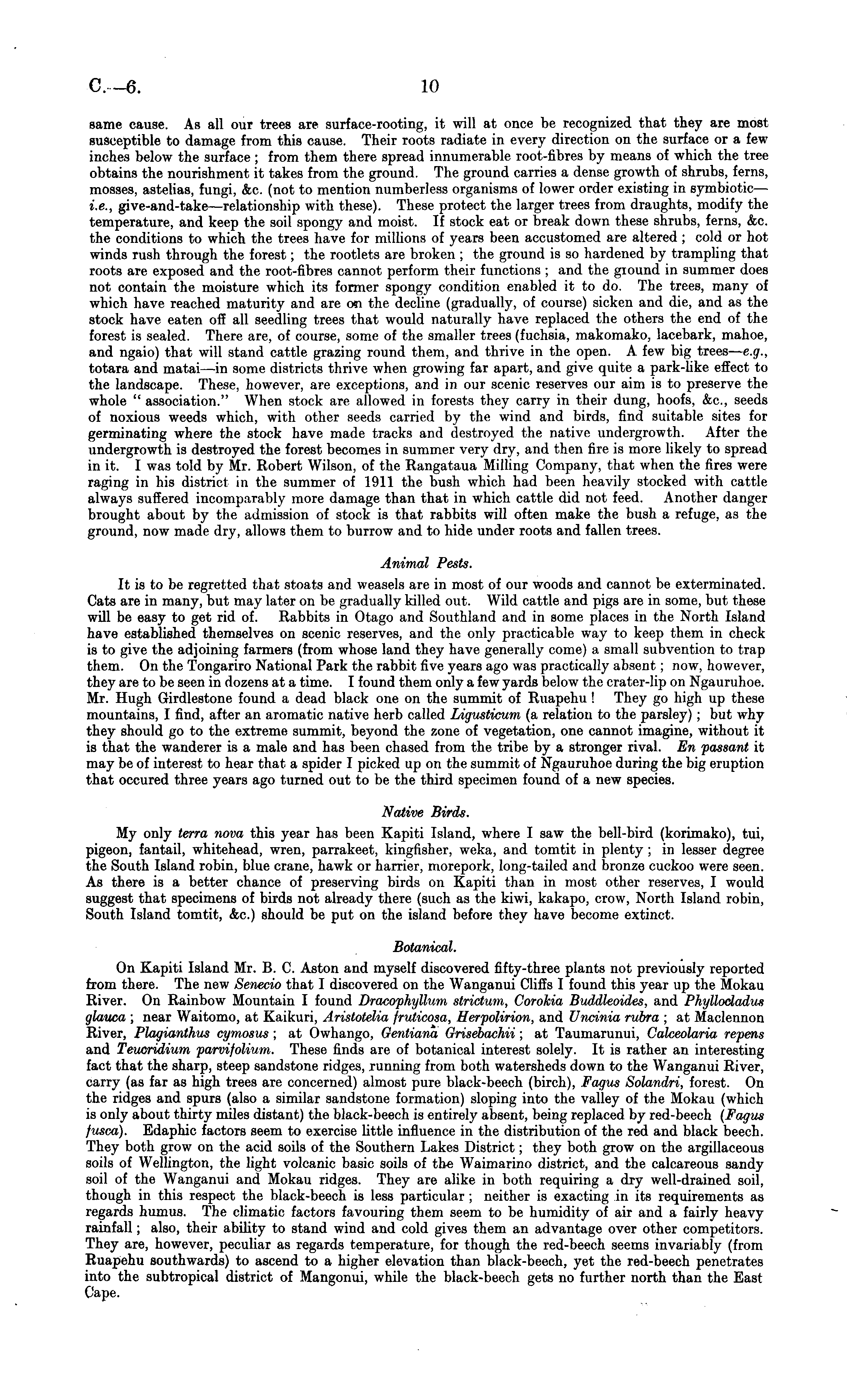 same cause. As all our trees are surface-rooting, it will at once be recognized that they are most susceptible to damage from this cause. Their roots radiate in every direction on the surface or a fewinches below the surface ; from them there spread innumerable root-fibres by means of which the tree obtains the nourishment it takes from the ground. The ground carries a dense growth of shrubs, ferns, mosses, astelias, fungi, &c. (not to mention numberless organisms of lower order existing in symbiotic — i.e., give-and-take—relationship with these). These protect the larger trees from draughts, modify the temperature, and keep the soil spongy and moist. If stock eat or break down these shrubs, ferns, &c. the conditions to which the trees have for millions of years been accustomed are altered ; cold or hot winds rush through the forest; the rootlets are broken ; the ground is so hardened by trampling that roots are exposed and the root-fibres cannot perform their functions ; and the ground in summer does not contain the moisture which its former spongy condition enabled it to do. The trees, many of which have reached maturity and are on the decline (gradually, of course) sicken and die, and as the stock have eaten off all seedling trees that would naturally have replaced the others the end of the forest is sealed. There are, of course, some of the smaller trees (fuchsia, makomako, lacebark, mahoe, and ngaio) that will stand cattle grazing round them, and thrive in the open. A few big trees — e.g., totara and matai —in some districts thrive when growing far apart, and give quite a park-like effect to the landscape. These, however, are exceptions, and in our scenic reserves our aim is to preserve the whole " association." When stock are allowed in forests they carry in their dung, hoofs, &c, seeds of noxious weeds which, with other seeds carried by the wind and birds, find suitable sites for germinating where the stock have made tracks and destroyed the native undergrowth. After the undergrowth is destroyed the forest becomes in summer very dry, and then fire is more likely to spread in it. I was told by Mr. Eobert Wilson, of the Eangataua Milling Company, that when the fires were raging in his district in the summer of 1911 the bush which had been heavily stocked with cattle always suffered incomparably more damage than that in which cattle did not feed. Another danger brought about by the admission of stock is that rabbits will often make the bush a refuge, as the ground, now made dry, allows them to burrow and to hide under roots and fallen trees. Animal Pests. It is to be regretted that stoats and weasels are in most of our woods and cannot be exterminated. Cats are in many, but may later on be gradually killed out. Wild cattle and pigs are in some, but these will be easy to get rid of. Rabbits in Otago and Southland and in some places in the North Island have established themselves on scenic reserves, and the only practicable way to keep them in check is to give the adjoining farmers (from whose land they have generally come) a small subvention to trap them. On the Tongariro National Park the rabbit five years ago was practically absent; now, however, they are to be seen in dozens at a time. I found them only a few yards below the crater-lip on Ngauruhoe. Mr. Hugh Girdlestone found a dead black one on the summit of Ruapehu ! They go high up these mountains, I find, after an aromatic native herb called Liqusticum (a relation to the parsley) ; but why they should go to the extreme summit, beyond the zone of vegetation, one cannot imagine, without it is that the wanderer is a male and has been chased from the tribe by a stronger rival. En passant it may be of interest to hear that a spider I picked up on the summit of Ngauruhoe during the big eruption that occured three years ago turned out to be the third specimen found of a new species. Native Birds. My only terra nova this year has been Kapiti Island, where I saw the bell-bird (korimako), tui, pigeon, fantail, whitehead, wren, parrakeet, kingfisher, weka, and tomtit in plenty ; in lesser degree the South Island robin, blue crane, hawk or harrier, morepork, long-tailed and bronze cuckoo were seen. As there is a better chance of preserving birds on Kapiti than in most other reserves, I would suggest that specimens of birds not already there (such as the kiwi, kakapo, crow, North Island robin, South Island tomtit, &c.) should be put on the island before they have become extinct. Botanical. On Kapiti Island Mr. B. C. Aston and myself discovered fifty-three plants not previously reported from there. The new Senecio that I discovered on the Wanganui Cliffs I found this year up the Mokau River. On Rainbow Mountain I found Dracophyllum striatum, Corokia Buddleoides, and Phyllodadus glanca ; near Waitomo, at Kaikuri, Aristotelia fruticosa, Herpolirion, and Vncinia rubra ; at Maclennon River, Plagianthus cymosus ; at Owhango, Gentiana Grisebachii ; at Taumarunui, Calceolaria repens and Teucridium parvifolium. These finds are of botanical interest solely. It is rather an interesting fact that the sharp, steep sandstone ridges, running from both watersheds down to the Wanganui River, carry (as far as high trees are concerned) almost pure black-beech (birch), Fagus Solandri, forest. On the ridges and spurs (also a similar sandstone formation) sloping into the valley of the Mokau (which is only about thirty miles distant) the black-beech is entirely absent, being replaced by red-beech (Fagus fusca). Edaphic factors seem to exercise little influence in the distribution of the red and black beech. They both grow on the acid soils of the Southern Lakes District; they both grow on the argillaceous soils of Wellington, the light volcanic basic soils of the Waimarino district, and the calcareous sandy soil of the Wanganui and Mokau ridges. They are alike in both requiring a dry well-drained soil, though in this respect the black-beech is less partic