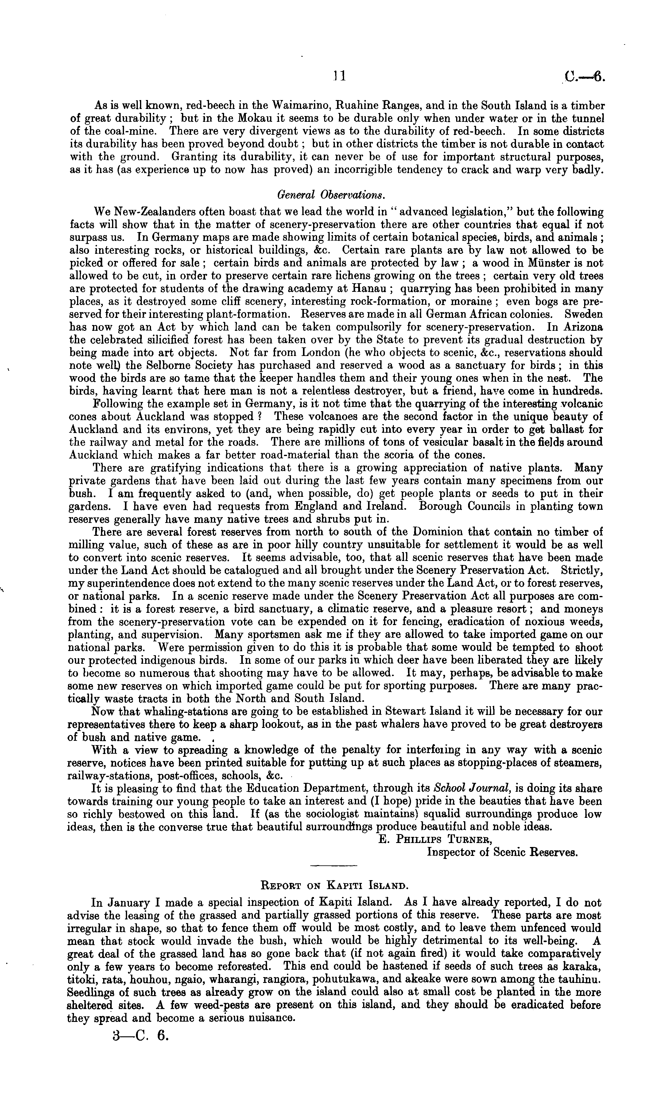 As is well known, red-beech in the Waimarino, Ruahine Ranges, and in the South Island is a timber of great durability ; but in the Mokau it seems to be durable only when under water or in the tunnel of the coal-mine. There are very divergent views as to the durability of red-beech. In some districts its durability has been proved beyond doubt; but in other districts the timber is not durable in contact with the ground. Granting its durability, it can never be of use for important structural purposes, as it has (as experience up to now has proved) an incorrigible tendency to crack and warp very badly. General Observations. We New-Zealanders often boast that we lead the world in " advanced legislation," but the following facts will show that in the matter of scenery-preservation there are other countries that equal if not surpass us. In Germany maps are made showing limits of certain botanical species, birds, and animals ; also interesting rocks, or historical buildings, &c. Certain rare plants are by law not allowed to be picked or offered for sale ; certain birds and animals are protected by law ; a wood in Munster is not allowed to be cut, in order to preserve certain rare lichens growing on the trees ; certain very old trees are protected for students of the drawing academy at Hanau ; quarrying has been prohibited in many places, as it destroyed some cliff scenery, interesting rock-formation, or moraine ; even bogs are preserved for their interesting plant-formation. Reserves are made in all German African colonies. Sweden has now got an Act by which land can be taken compulsorily for scenery-preservation. In Arizona the celebrated silicified forest has been taken over by the State to prevent its gradual destruction by being made into art objects. Not far from London (he who objects to scenic, &c, reservations should note well) the Selborne Society has purchased and reserved a wood as a sanctuary for birds ; in this wood the birds are so tame that the keeper handles them and their young ones when in the nest. The birds, having learnt that here man is not a relentless destroyer, but a friend, have come in hundreds. Following the example set in Germany, is it not time that the quarrying of the interesting volcanic cones about Auckland was stopped ? These volcanoes are the second factor in the unique beauty of Auckland and its environs, yet they are being rapidly cut into every year in order to get ballast for the railway and metal for the roads. There are millions of tons of vesicular basalt in the fields around Auckland which makes a far better road-material than the scoria of the cones. There are gratifying indications that there is a growing appreciation of native plants. Many private gardens that have been laid out during the last few years contain many specimens from our bush. lam frequently asked to (and, when possible, do) get people plants or seeds to put in their gardens. I have even had requests from England and Ireland. Borough Councils in planting town reserves generally have many native trees and shrubs put in. There are several forest reserves from north to south of the Dominion that contain no timber of milling value, such of these as are in poor hilly country unsuitable for settlement it would be as well to convert into scenic reserves. It seems advisable, too, that all scenic reserves that have been made under the Land Act should be catalogued and all brought under the Scenery Preservation Act. Strictly, my superintendence does not extend to the many scenic reserves under the Land Act, or to forest reserves, or national parks. In a scenic reserve made under the Scenery Preservation Act all purposes are combined : it is a forest reserve, a bird sanctuary, a climatic reserve, and a pleasure resort; and moneys from the scenery-preservation vote can be expended on it for fencing, eradication of noxious weeds, planting, and supervision. Many sportsmen ask me if they are allowed to take imported game on our national parks. Were permission given to do this it is probable that some would be tempted to shoot our protected indigenous birds. In some of our parks in which deer have been liberated they are likely to become so numerous that shooting may have to be allowed. It may, perhaps, be advisable to make some new reserves on which imported game could be put for sporting purposes. There are many practically waste tracts in both the North and South Island. Now that whaling-stations are going to be established in Stewart Island it will be necessary for our representatives there to keep a sharp lookout, as in the past whalers have proved to be great destroyers of bush and native game. With a view to spreading a knowledge of the penalty for interfciing in any way with a scenic reserve, notices have been printed suitable for putting up at such places as stopping-places of steamers, railway-stations, post-offices, schools, &c. It is pleasing to find that the Education Department, through its School Journal, is doing its share towards training our young people to take an interest and (I hope) pride in the beauties that have been so richly beetowed on this land. If (as the sociologist maintains) squalid surroundings produce low ideas, then is the converse true that beautiful surroundings produce beautiful and noble ideas. E. Phillips Turner, Inspector of Scenic Reserves. Report on Kapiti Island. In January I made a special inspection of Kapiti Island. As I have already reported, Ido not advise the leasing of the grassed and partially grassed portions of this reserve. These parts are most irregular in shape, so that to fence them off would be most costly, and to leave them unfenced would mean that stock would invade the bush, which would be highly detrimental to its well-being. A great deal of the grassed land has so gone back that (if not again fired) it would take comparatively only a few years to become reforested. This end could be hastened if seeds of such trees as karaka, titoki, ra
