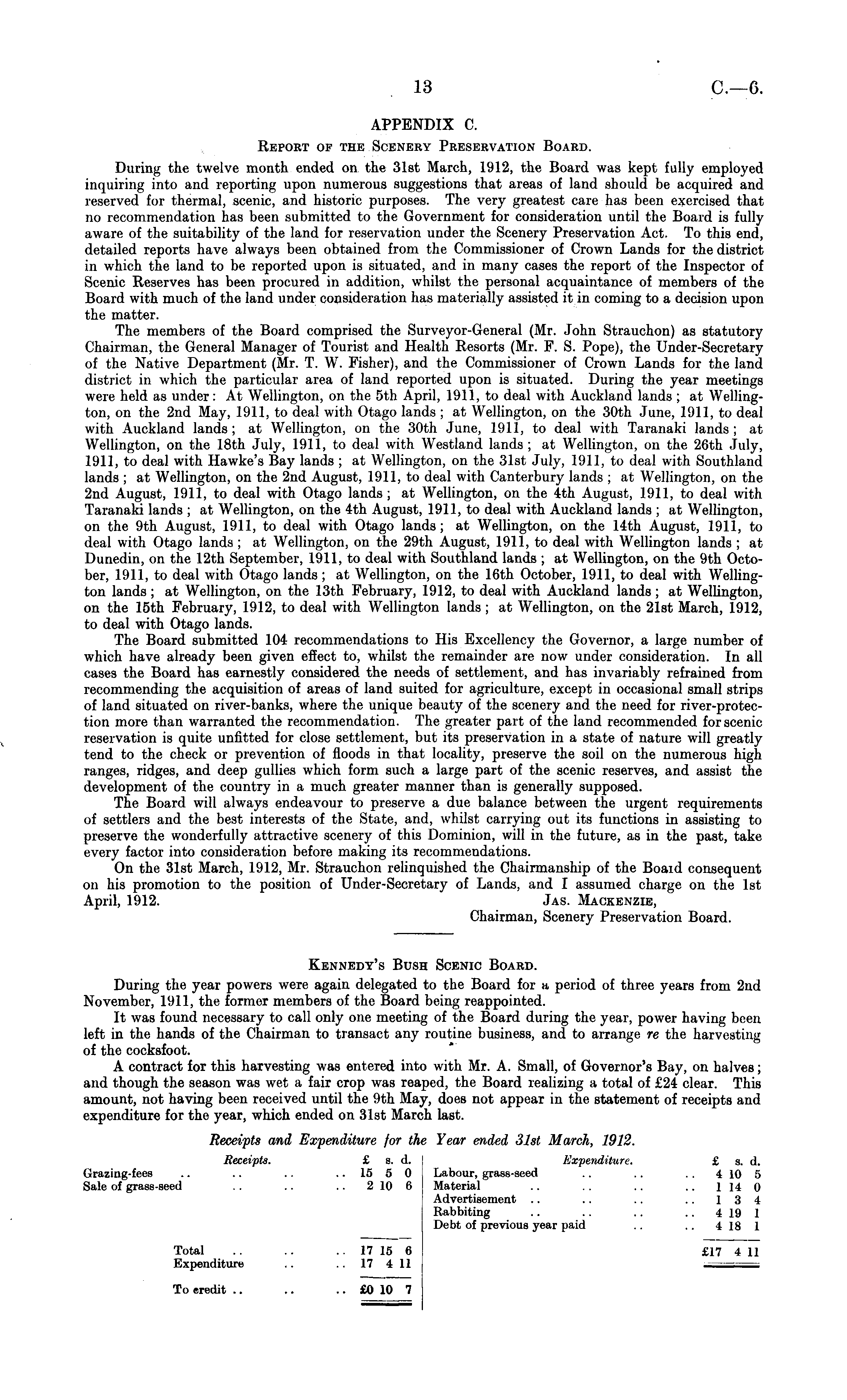 APPENDIX C. Report of the Scenery Preservation Board. During the twelve month ended on the 31st March, 1912, the Board was kept fully employed inquiring into and reporting upon numerous suggestions that areas of land should be acquired and reserved for thermal, scenic, and historic purposes. The very greatest care has been exercised that no recommendation has been submitted to the Government for consideration until the Board is fully aware of the suitability of the land for reservation under the Scenery Preservation Act. To this end, detailed reports have always been obtained from the Commissioner of Crown Lands for the district in which the land to be reported upon is situated, and in many cases the report of the Inspector of Scenic Reserves has been procured in addition, whilst the personal acquaintance of members of the Board with much of the land under consideration has materially assisted it in coming to a decision upon the matter. The members of the Board comprised the Surveyor-General (Mr. John Strauchon) as statutory Chairman, the General Manager of Tourist and Health Resorts (Mr. F. S. Pope), the Under-Secretary of the Native Department (Mr. T. W. Fisher), and the Commissioner of Crown Lands for the land district in which the particular area of land reported upon is situated. During the year meetings were held as under: At Wellington, on the sth April, 1911, to deal with Auckland lands ; at Wellington, on the 2nd May, 1911, to deal with Otago lands ; at Wellington, on the 30th June, 1911, to deal with Auckland lands ; at Wellington, on the 30th June, 1911, to deal with Taranaki lands ; at Wellington, on the 18th July, 1911, to deal with Westland lands; at Wellington, on the 26th July, 1911, to deal with Hawke's Bay lands ; at Wellington, on the 31st July, 1911, to deal with Southland lands ; at Wellington, on the 2nd August, 1911, to deal with Canterbury lands ; at Wellington, on the 2nd August, 1911, to deal with Otago lands; at Wellington, on the 4th August, 1911, to deal with Taranaki lands ; at Wellington, on the 4th August, 1911, to deal with Auckland lands ; at Wellington, on the 9th August, 1911, to deal with Otago lands ; at Wellington, on the 14th August, 1911, to deal with Otago lands ; at Wellington, on the 29th August, 1911, to deal with Wellington lands ; at Dunedin, on the 12th September, 1911, to deal with Southland lands ; at Wellington, on the 9th October, 1911, to deal with Otago lands ; at Wellington, on the 16th October, 1911, to deal with Wellington lands ; at Wellington, on the 13th February, 1912, to deal with Auckland lands ; at Wellington, on the 15th February, 1912, to deal with Wellington lands; at Wellington, on the 21st March, 1912, to deal with Otago lands. The Board submitted 104 recommendations to His Excellency the Governor, a large number of which have already been given effect to, whilst the remainder are now under consideration. In all cases the Board has earnestly considered the needs of settlement, and has invariably refrained from recommending the acquisition of areas of land suited for agriculture, except in occasional small strips of land situated on river-banks, where the unique beauty of the scenery and the need for river-protec-tion more than warranted the recommendation. The greater part of the land recommended for scenic reservation is quite unfitted for close settlement, but its preservation in a state of nature will greatly tend to the check or prevention of floods in that locality, preserve the soil on the numerous high ranges, ridges, and deep gullies which form such a large part of the scenic reserves, and assist the development of the country in a much greater manner than is generally supposed. The Board will always endeavour to preserve a due balance between the urgent requirements of settlers and the best interests of the State, and, whilst carrying out its functions in assisting to preserve the wonderfully attractive scenery of this Dominion, will in the future, as in the past, take every factor into consideration before making its recommendations. On the 31st March, 1912, Mr. Strauchon relinquished the Chairmanship of the Boaid consequent on his promotion to the position of Under-Secretary of Lands, and I assumed charge on the Ist April, 1912. Jas. Mackenzie, Chairman, Scenery Preservation Board. Kennedy's Bush Scenic Board. During the year powers were again delegated to the Board for a period of three years from 2nd November, 1911, the former members of the Board being reappointed. It was found necessary to call only one meeting of the Board during the year, power having been left in the hands of the Chairman to transact any routine business, and to arrange re the harvesting of the cocksfoot. A contract for this harvesting was entered into with Mr. A. Small, of Governor's Bay, on halves; and though the season was wet a fair crop was reaped, the Board realizing a total of £24 clear. This amount, not having been received until the 9th May, does not appear in the statement of receipts and expenditure for the year, which ended on 31st March last. Receipts and Expenditure for the Year ended 31st March, 1912. Receipts. £ s. d. Expenditure. £ s. d. Grazing-fees .. .. .. 15 5 0 Labour, grass-seed .. .. .. 410 5 Sale of grass-seed .. .. .. 210 6 Material .. .. .. 114 0 Advertisement .. .. .. ..134 Rabbiting .. .. .. 4 19 1 Debt of previous year paid .. .. 418 1 Total ...... 17 15 6 £17 411 Expenditure .. .. 17 411 - To credit .. .. .. £0 10 7