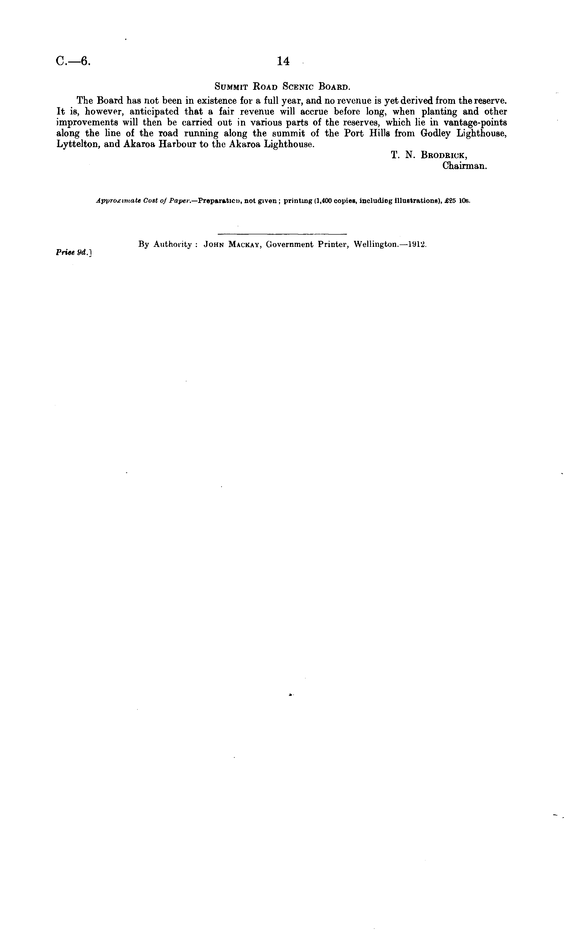 Summit Koad Scenic Board. The Board has not been in existence for a full year, and no revenue is yet derived from the reserve. It is, however, anticipated that a fair revenue will accrue before long, when planting and other improvements will then be carried out in various parts of the reserves, which lie in vantage-points along the line of the road running along the summit of the Port Hills from Godley Lighthouse, Lyttelton, and Akaroa Harbour to the Akaroa Lighthouse. T. N. Brodrick, Chairman. Approximate Cost of Paper. —Preparation, not given ; printing (1,400 copies, includiog illustrations), £25 10s. By Authority : .John Mackay, Government Printer, Wellington.—l9l2. Price yd.]
