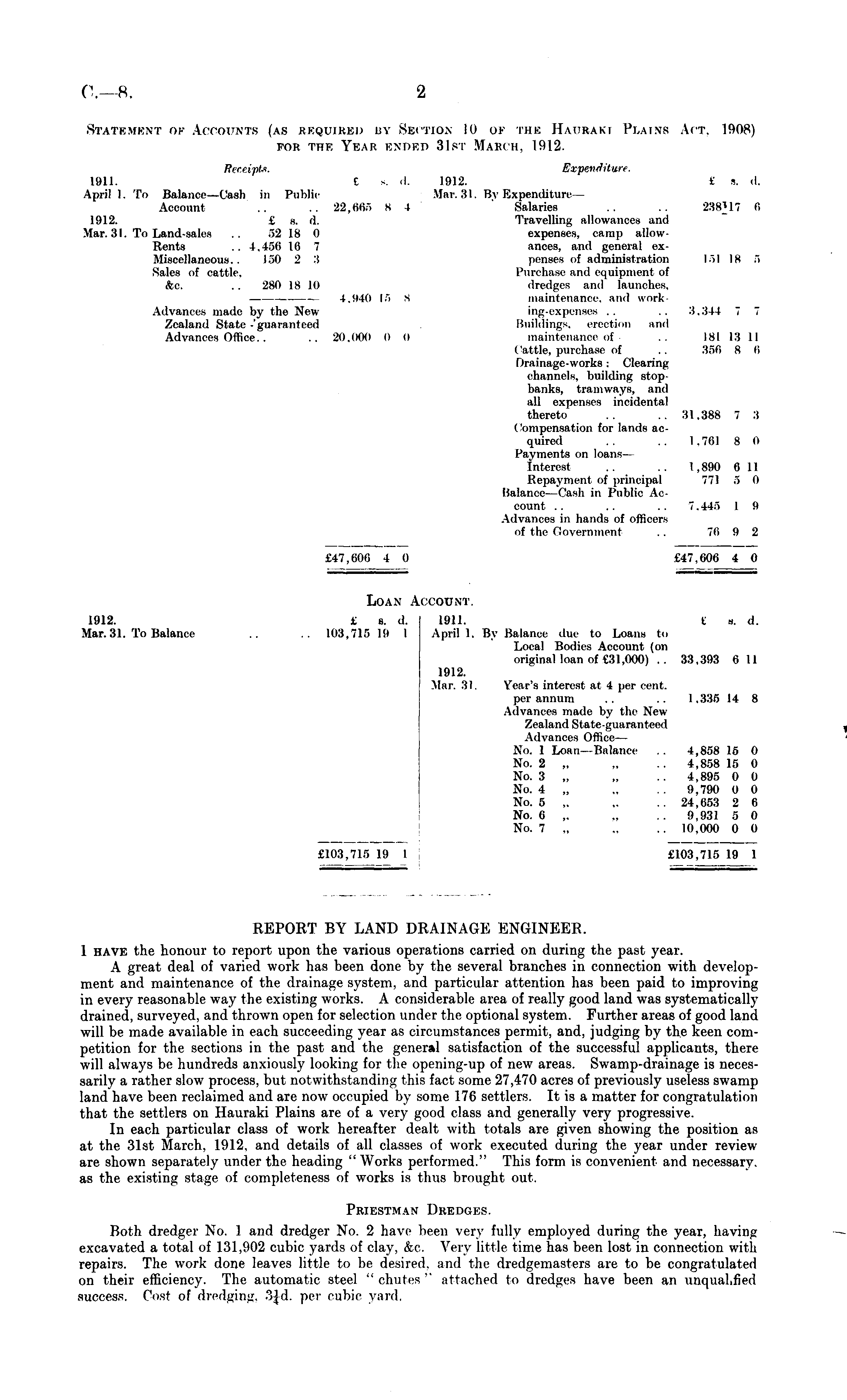 Statement of Accounts (as required by Section 10 ot the Haubaki Plains Act. 1908) for the Year ended 31st March, 1912. Receipt*. Expenditure. 1011. E s. ,1. 1912. £ s. (I. April 1. To Balance—Cash in Public Mar. 31. By Expenditure— Account .. .. 22,666 8 4 ! Salaries .. .. 238} 17 fi 1912. £ s. (1. Travelling allowances and Mar. 31. To Land-sales .. 52 18 0 expenses, camp allow - Rents . . 4.450 Iβ 7 ances, and general exMiscellaneous.. 150 2 :S penses of administration 151 18 ."> Sales of cattle. Purchase and equipment of &c. .. 280 18 10 dredges and launches. 4.U40 16 8 maintenance, and work Advances made by the New ing-expensee .. .. :i.:i44 7 7 Zealand State -'guaranteed Buildings, erection and Advances Office.. .. 20.000 0 0 maintenance of .. 181 13 11 Cattle, purchase of .. 356 8 (i Drainage-works: Clearing channels, building stopbanks, tramways, and all expenses incidental thereto .. .. 31.388 7 3 Compensation for lands acquired . . .. 1.761 8 0 Payments on loans— Interest .. .. 1,890 6 11 Repayment of principal 771 6 0 Balance—Cash in Public Account .. .. .. 7.445 1 9 Advances in hands of officers of the Government .. 76 9 2 £47,606 4 0 £47,606 4 0 Loan Account. 1912. £ b. d. 1911. I s. d. Mar. 31. To Balance .. .. 103,716 19 I April 1. By Balance due to Loan* to Local Bodies Account (on original loan of £31,000) .. 33.393 6 11 1912. Mar. 31. Year's interest at 4 per cent. per annum .. .. 1.335 14 8 Advances made by the New Zealand State-guaranteed Advances Office— No. 1 Loan—Balance .. 4,858 15 0 No. 2 „ „ .. 4,858 15 0 No. 3 „ „ .. 4,895 0 0 No. 4 „ „ .. 9,790 0 0 No. 5 ~ .. .. 24,653 2 6 No. 6 ~ .. .. 9,931 5 0 No. 7 „ ~ .. 10,000 0 0 £103,715 19 1 I £103,715 19 1
