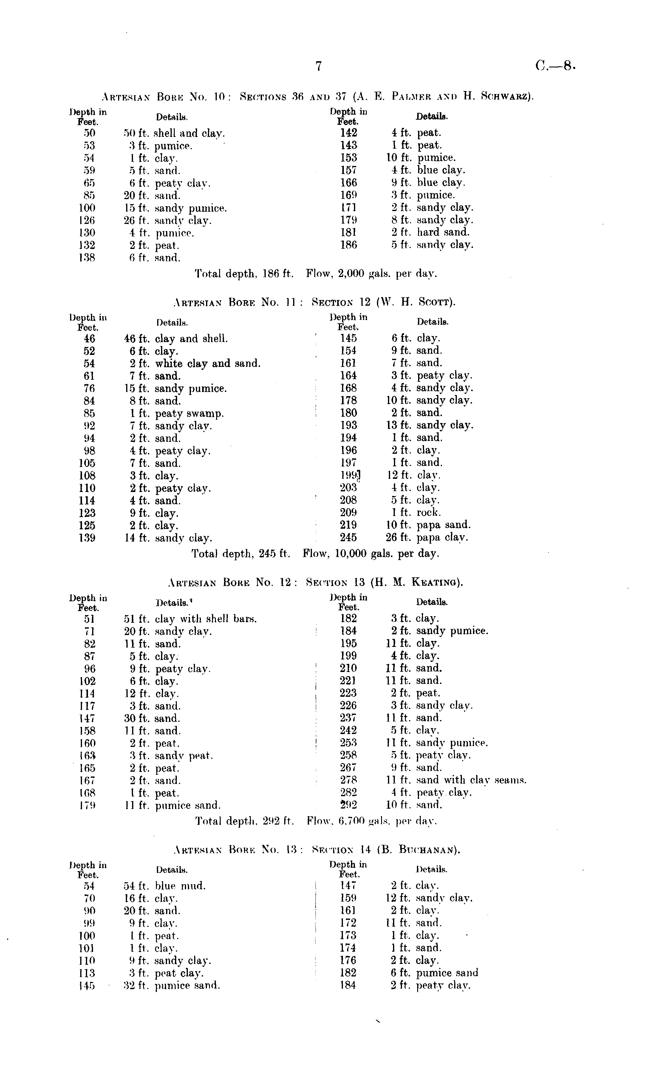 A.RTEBIAN BOBE No. 10 I SECTIONS 36 AND 37 (A. E. PALMER AND H. ScHWARZ) 50 50 ft. shell and clay. 142 4 ft. peat, 53 3 ft. pumice. 143 1 ft. peat. 54 L ft. clay. 153 10 ft, pumice. 59 5 ft. sand. 157 I ft. blue clay. 65 6 ft. peaty clay. 166 9 ft. blue clay. 85 -Jo ft. sand. 169 :5 ft. pumice.' LOO 15 ft. sandy pumice. 171 2 ft. sandy clay. 126 26 ft. sandy clay. 17. 8 ft. sandy clay. L3O I It. pumice. 181 2ft. hard sand. 132 2 ft. peat. 186 5 ft. sandy clay. 138 6 ft. sand. Total depth. 186 ft. Flow. 2,00(1 gals, per day. Aktksiw Bore No. II : Section 12 (W. H. Soott). 46 46 ft. clay and shell. 145 6 ft. clay. 52 6 ft. clay. 154 9 ft. sand. 51 2 ft. white clay and sand. 161 7 ft. .sand. c>l 7 ft. sand. 164 3 ft. peaty clay. 76 loft, sandy pumice. 168 I It. sandy clay. 84 8 ft. sand. 178 10 ft. sandy day. 85 1 ft. peaty swamp. 180 2 ft. sand. i>2 7 ft. sandy clay. 193 L 3 ft. sandy clay. 1)1 2 ft. sand. 194 lft, sand. 98 4 ft. peaty clay. 196 2 ft. day. 105 7ft. sand. 197 lft. sand. 108 3 ft. clay. I'•'.>] 12ft. clay. 110 2 ft. peaty clay. 203' tft. clay. 114 4 ft. sand. 208 5 ft. clay. J 23 9 ft. clay. 209 1 ft. rock. 125 2 ft. clay. 219 10 ft. papa sand. 139 14 ft. sandy clay. 245 26 ft. papa clay. Total depth, 245 ft. Plow. 10.000 gals, per day. Artesian Bore No. 12 : Section 13 (11. M. Keating). 51 51 ft. clay with shell bars. 182 3ft. clay. 71 20 ft. sandy clay. 184 2 ft. sandy pumice. 82 lift, sand" 195 lift. clay. 87 5 ft. clay. 199 4 ft. clay. 96 9 ft, peaty clay. 210 11 ft. sand. 102 6ft. day. 221 lift. sand. 111 12 ft. day. 223 2 ft. peat, 117 3 ft. sand. 226 3ft. sandy clay. 117 30ft. sand. 237 II ft. sand. 158 11 ft. sand. 242 5 ft. clay. 160 2ft. poiit. 253 11 ft. sandy pumice. 163 3 ft. sandy peat. 258 5 ft. peaty clay. ' 165 2ft. peat.' 267 lift. sand. 167 2ft. sand. 278 11 ft. sand with day scams. 168 I ft, peat. 282 I ft. peaty clay. 179 II ft. pumice sand. 892 10ft. sand. Total depth, 292 ft. Flow. 6,700 gals, per day. Artesian Bore No. 13 : Section 14 (B. Buchanan). °fjf Details. 1)^ i " 54 54ft. blue mud. II" 2ft. clay. 7<t 16 ft. clay. 159 12 ft. sandy clay. 90 20 ft. saiid. 161 2 ft. clay. 99 9 ft. clay. 172 II ft. sand. 100 I ft. peat. 173 1 ft, clay. Io 1 1 ft. day. 17-1 1 ft. sand. 110 9ft. sandy dux. 176 2ft. clay. 113 3ft. peal claw 182 6 ft. pumice sand 145 -">2 ft. pumice sand. 184 2 ft. peaty clay.