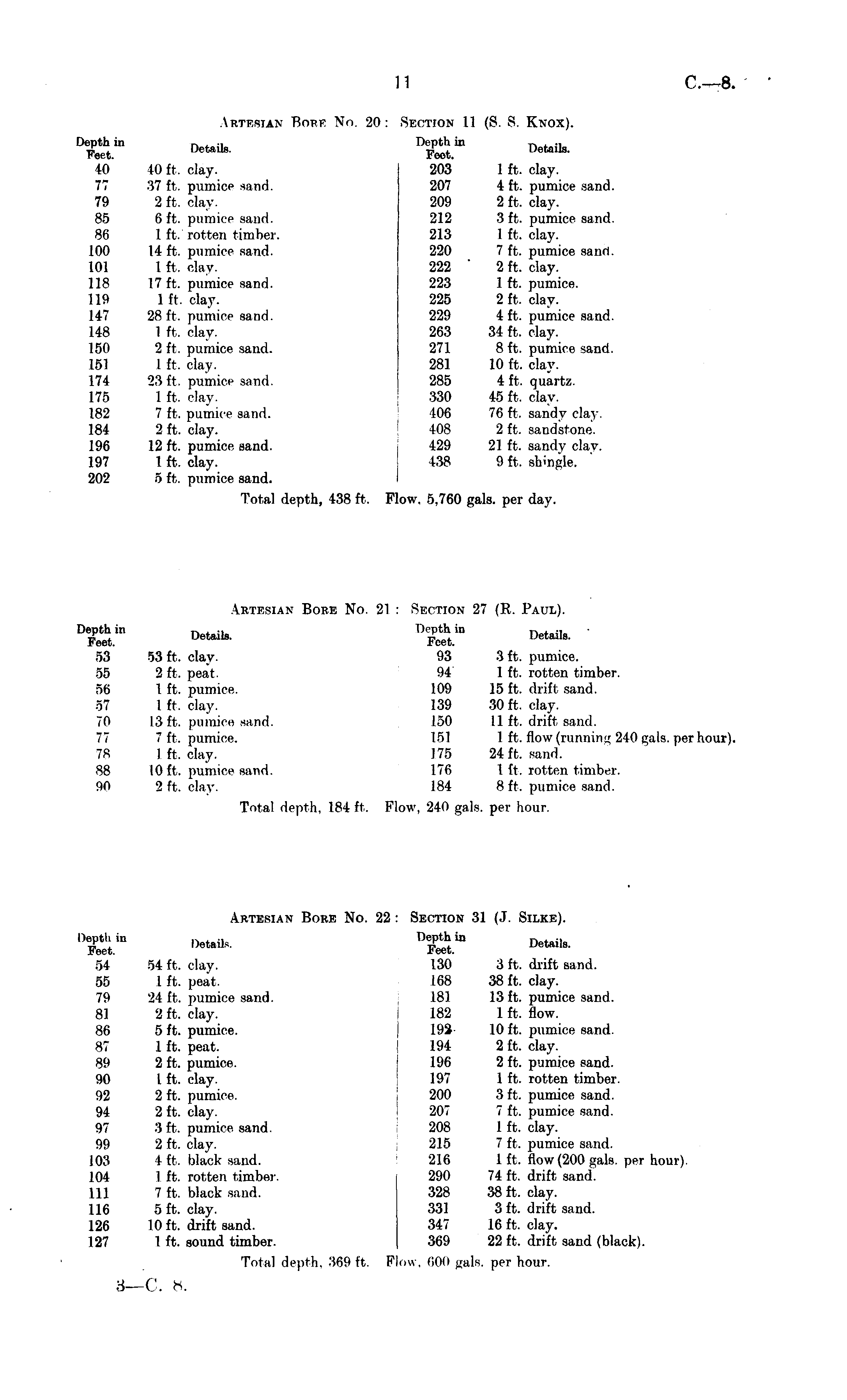 Artesian Bofe No. 20: Section 11 (8. S. Kkox). Depth in n P f»i| a Depth in retails Feet. Details. Foet Details. 40 40 ft. clay. 203 1 ft. clay. 77 37ft. pumice sand. 207 4ft. pumice sand. 79 2 ft. clay. 209 2 ft. clay. 85 6 ft. pumice sand. 212 3 ft. pumice sand. 86 1 ft. rotten timber. 213 1 ft, clay. 100 14 ft. pumice sand. 220 7 ft. pumice sand. 101 lft. clay. 222 " 2 ft. clay. 118 17 ft. pumice sand. 223 1 ft. pumice. 119 1 ft. clay. 225 2 ft, clay. 147 28 ft. pumice sand. 229 4 ft. pumice sand. 148 1 ft. clay. 263 34 ft. clay. 150 2 ft. pumice sand. 271 8 ft. pumice sand. 151 I ft. clay. 281 10 ft. clay. 174 23 ft. pumice sand. 285 4 ft, quartz. 175 1 ft. clay. 330 45 ft. clay. 182 7 ft. pumice sand. 406 76 ft. sandy clay. 184 2 ft. clay. 408 2 ft. sandstone. 196 12 ft. pumice sand. 429 21 ft. sandy clay. 197 1 ft, clay. 438 9 ft. shingle. 202 5 ft. pumice sand. Total depth, 438 ft, Flow. 5,760 gals, per day. Artesian Bore No. 21 : Section 27 (R. Paul). Depth in Details Depth in Details ' Feet. Details. Feet Details. 53 53 ft, clay. 93 3 ft. pumice. 55 2 ft. peat. 94 1 ft. rotten timber. 56 1 ft. pumice. 109 15 ft. drift sand. 57 I ft. clay. 139 30 ft. clay. 70 13 ft. pumice sand. 150 11 ft. drift sand. 77 7 ft. pumice. 151 1 ft. flow (running 240 gals, per hour). 78 I ft. clay. 175 24 ft. sand. 88 10 ft. pumice sand. 176 1 ft. rotten timber. 00 2 ft. clay. 184 8 ft. pumice sand. Total depth, 184 ft, Flow, 240 gals, per hour. Artesian Bore No. 22 : Section 31 (J. Silke). Depth in Detail. Depth in Details Feet. Detail.-. Feet Details. 54 54 ft. clay. 130 3 ft. drift sand. 55 I ft. peat, 168 38 ft. clay. 79 24 ft. pumice sand. 181 13 ft. pumice sand. 81 2 ft, clay. 182 1 ft. flow. 86 5 ft. pumice. 192 10 ft. pumice sand. 87 1 ft. peat. 194 2 ft. clay. 89 2 ft. pumice. 196 2 ft. pumice sand. 90 I ft. clay. 197 1 ft. rotten timber. 92 2 ft. pumice. 200 3 ft. pumice sand. 94 2 ft. clay. 207 7 ft. pumice sand. 97 3 ft, pumice sand. 208 1 ft. clay. 99 2 ft. clay. 215 7 ft. pumice sand. 103 4 ft, black sand. 216 1 ft. flow (200 gals, per hour) 104 1 ft. rotten timber. 290 74 ft. drift sand. 11l 7 ft. black sand. 328 38 ft. clay. 116 5 ft. clay. 331 3 ft. drift sand. 126 10 ft. drift sand. 347 16 ft. clay. 127 1 ft. sound timber. 369 22 ft. drift sand (black). Total depth, 369 ft. Flow, 600 gale, per hour.