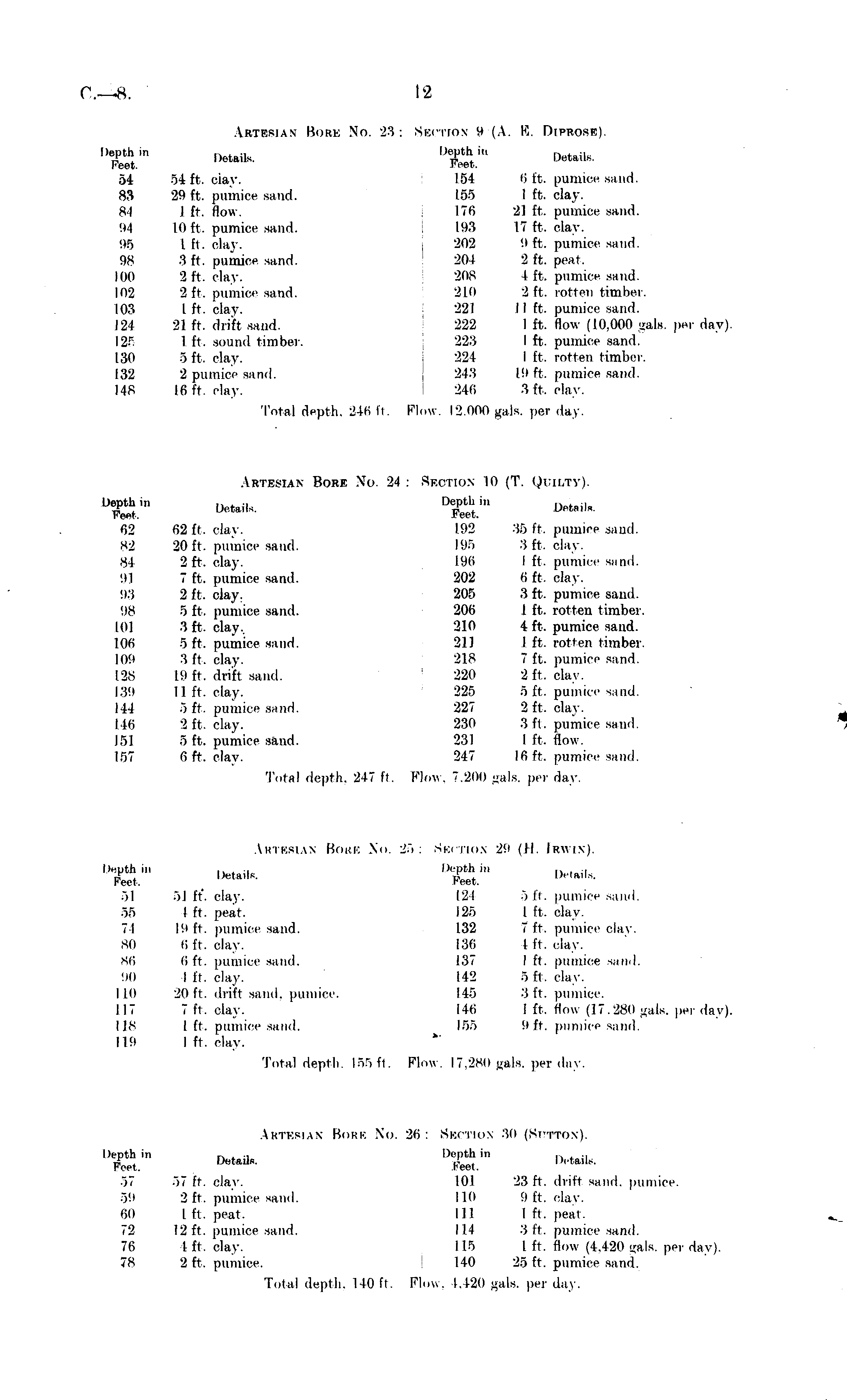 Artbsian Bore No, 23: Section 9 (A. E. Diprosk). l,e ' ,th '" Details. "fV" Details. f-Vet. Feet. 54 54 ft. oiay. L 54 6 Et. pumice - I. 83 29 ft. pumice sand. 155 I ft. clay. 84 J ft. flow. 176 21 it. pumice sand. Ml LO Et. pumice sand. 193 IT Et. clay. 95 I Et. clay. 202 9 ft. pumice sand. 98 3 ft. pumice sand. 204 2 ft. peat. [00 2 ft. clay. 208 L ft. pumice sand. 102 2 ft. pumice sand. 210 2 ft. rotten timber. 103 I ft. clay. 221 11 ft. pumice sand. 124 21 ft. drift sand. 222 I ft. flow (10,000 gals, per day) 12" I ft. sound timber. 22M I ft. pumice sand. [30 5 ft. clay. 224 1 ft. rotten timber. 132 2 pumice sand. 243 19 ft. pumice sand. lis 16 ft. clay. 246 3ft. play. Total depth, 246 ft. Flow. 12.000 gals, per da Artesian Borf. Xo. 21 : Section 10 (T. Quilty). 'XV" ]hf: ' iU - D 3tt. in l) - n,ls "'- r>2 62 ft. clay. 192 35 ft. pumice sand. 82 20 ft. pumice eand. !!••'> 3 ft. claj. SI 2 ft. clay. 196 I ft. pumice sand. 9] 7 It. pumice sand. 202 6 ft. clay. 93 2ft. (lav. 205 3ft. pumice sand. 98 5 ft. pumice 3and. 206 I ft. rotten timber. 101 .') ft. nlay, 210 4 ft. pumice sand. 106 5 ft. pumice sand. 21] I Et. rotten timber. 109 3ft. clay. 218 7 ft. pumice sand. 128 L 9 Et. drill sand. 220 2 ft. clay. 139 II ft. clay. 225 5 ft. pumice sand. 11l 5 ft. pumice sand. 227 2 ft. clay. lld 2 ft. clay. 230 3 ft. pumice sand, ir.l :> It. pumice sand. 231 I ft. flow. 157 ft ft. clay. 247 16ft. pumice sand. Total depth. 217 ft. Flow, 7,200 μ-ds. per day. Artesian Bore No. 25: Ski lion 29 (11. Irwin). r>l .")l ft", clay. L 24 5 Et. pumice sand. 55 I ft. peat. 125 1 It. clay. 71 19ft. pumice sand. 132 ? ft. pumice clay. 80 6 ft. clay. 136 slay. 86 6 ft. pumice sand. 137 I ft. pumice sand. 90 I ft. clay. 142 5 ft. clay. 110 20 ft. drift sand, pumice. 145 3 ft. pumice. 117 7 ft. clay. 146 I ft. flow (17,280 gals, per day) lIS I ft. pumice sand. 155 9ft. pumice sand. Ilii I ft. clay. Total depth, 155 ft. Plow. 17,280 gals, per day. \i:tksi\\ Bore No. 2(i: Section 30 (Button). ■XV |)«.ta,K l)^';i " Details. •IT r>7 ft. clay. 101 23ft. drift sand, pumice. 59 2 It. pumice sand. 110 9 ft. 60 I ft. peat. 11l I ft. peal. 72 12 ft. pumice sand. 114 3ft. pumice sand. 76 t ft. day. 115 I ft. flow (4,420 gals, per day). 78 2ft. pumice. I Mi 25 ft. pumice sand. Total depth, 110 ft. Flow, 1,420 gals, per day.