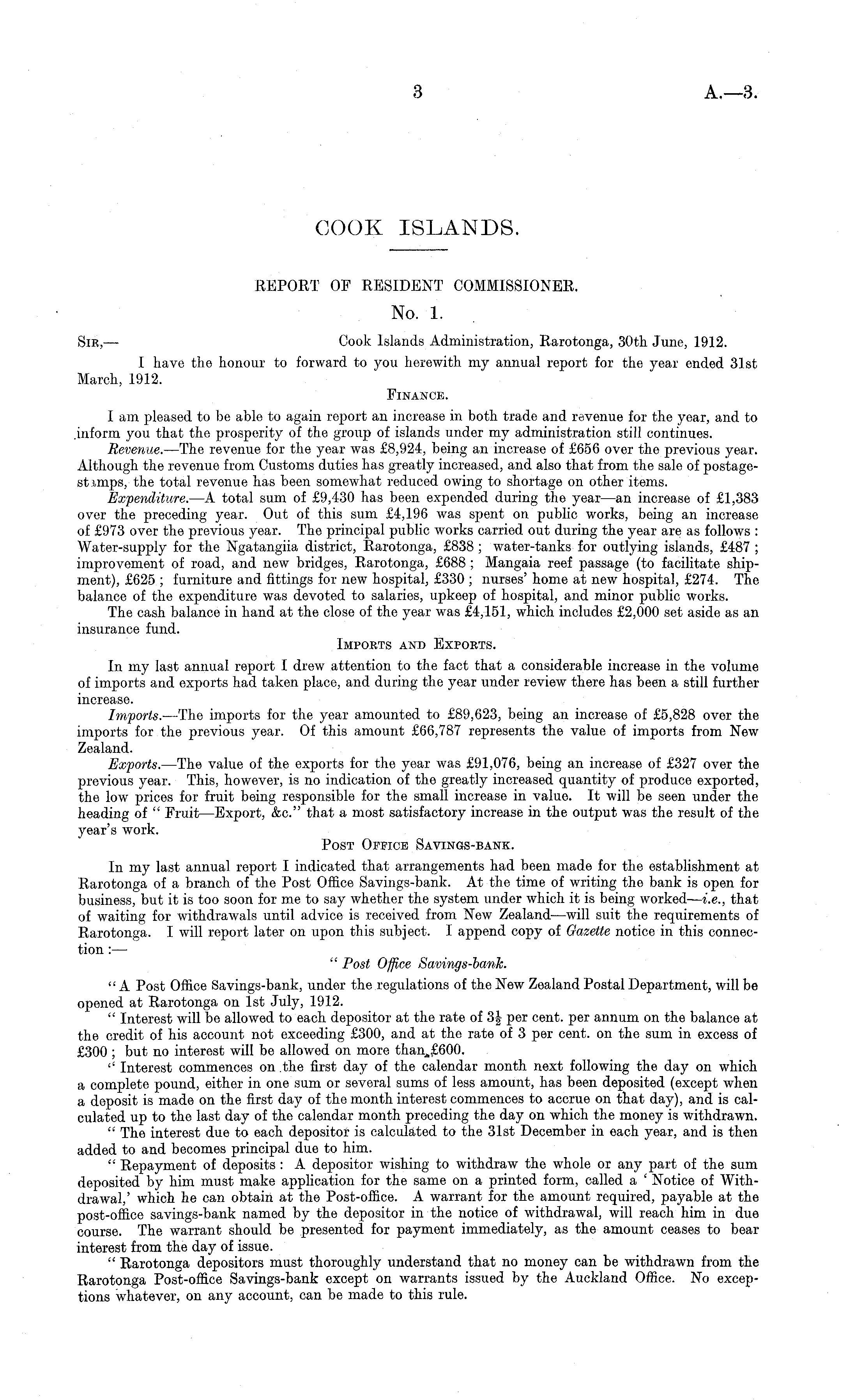 REPORT OF RESIDENT COMMISSIONER. No. 1. Sir, — Cook Islands Administration, Rarotonga, 30th June, 1912. I have the honour to forward to you herewith my annual report for the year ended 31st March, 1912. FINANCK. I am pleased to be able to again report an increase in both trade and revenue for the year, and to inform you that the prosperity of the group of islands under my administration still continues. Revenue. —The revenue for the year was £8,924, being an increase of £656 over the previous year. Although the revenue from Customs duties has greatly increased, and also that from the sale of postagestimps, the total revenue has been somewhat reduced owing to shortage on other items. Expenditure. —A total sum of £9,430 has been expended during the year—an increase of £1,383 over the preceding year. Out of this sum £4,196 was spent on public works, being an increase of £973 over the previous year. The principal public works carried out during the year are as follows : Water-supply for the Ngatangiia district, Rarotonga, £838 ; water-tanks for outlying islands, £487 ; improvement of road, and new bridges, Rarotonga, £688 ; Mangaia reef passage (to facilitate shipment), £625 ; furniture and fittings for new hospital, £330 ; nurses' home at new hospital, £274. The balance of the expenditure was devoted to salaries, upkeep of hospital, and minor public works. The cash balance in hand at the close of the year was £4,151, which includes £2,000 set aside as an insurance fund. Imports and Exports. In my last annual report I drew attention to the fact that a considerable increase in the volume of imports and exports had taken place, and during the year under review there has been a still further increase. Imports. —The imports for the year amounted to £89,623, being an increase of £5,828 over the imports for the previous year. Of this amount £66,787 represents the value of imports from New Zealand. Exports. —The value of the exports for the year was £91,076, being an increase of £327 over the previous year. This, however, is no indication of the greatly increased quantity of produce exported, the low prices for fruit being responsible for the small increase in value. It will be seen under the heading of " Fruit—Export, &c." that a most satisfactory increase in the output was the result of the year's work. Post Office Savings-bank. In my last annual report I indicated that arrangements had been made for the establishment at Rarotonga of a branch of the Post Office Savings-bank. At the time of writing the bank is open for business, but it is too soon for me to say whether the system under which it is being worked— i.e., that of waiting for withdrawals until advice is received from New Zealand—will suit the requirements of Rarotonga. I will report later on upon this subject. I append copy of Gazette notice in this connection :— " Post Office Savings-bank. " A Post Office Savings-bank, under the regulations of the New Zealand Postal Department, will be opened at Rarotonga on Ist July, 1912. " Interest will be allowed to each depositor at the rate of 3| per cent, per annum on the balance at the credit of his account not exceeding £300, and at the rate of 3 per cent, on the sum in excess of £300 ; but no interest will be allowed on more than,£6oo. '' Interest commences on the first day of the calendar month next following the day on which a complete pound, either in one sum or several sums of less amount, has been deposited (except when a deposit is made on the first day of the month interest commences to accrue on that day), and is calculated up to the last day of the calendar month preceding the day on which the money is withdrawn. " The interest due to each depositor is calculated to the 31st December in each year, and is then added to and becomes principal due to him. " Repayment of deposits : A depositor wishing to withdraw the whole or any part of the sum deposited by him must make application for the same on a printed form, called a ' Notice of Withdrawal,' which he can obtain at the Post-office. A warrant for the amount required, payable at the post-office savings-bank named by the depositor in the notice of withdrawal, will reach him in due course. The warrant should be presented for payment immediately, as the amount ceases to bear interest from the day of issue. " Rarotonga depositors must thoroughly understand that no money can be withdrawn from the Rarotonga Post-office Savings-bank except on warrants issued by the Auckland Office. No exceptions whatever, on any account, can be made to this rule.