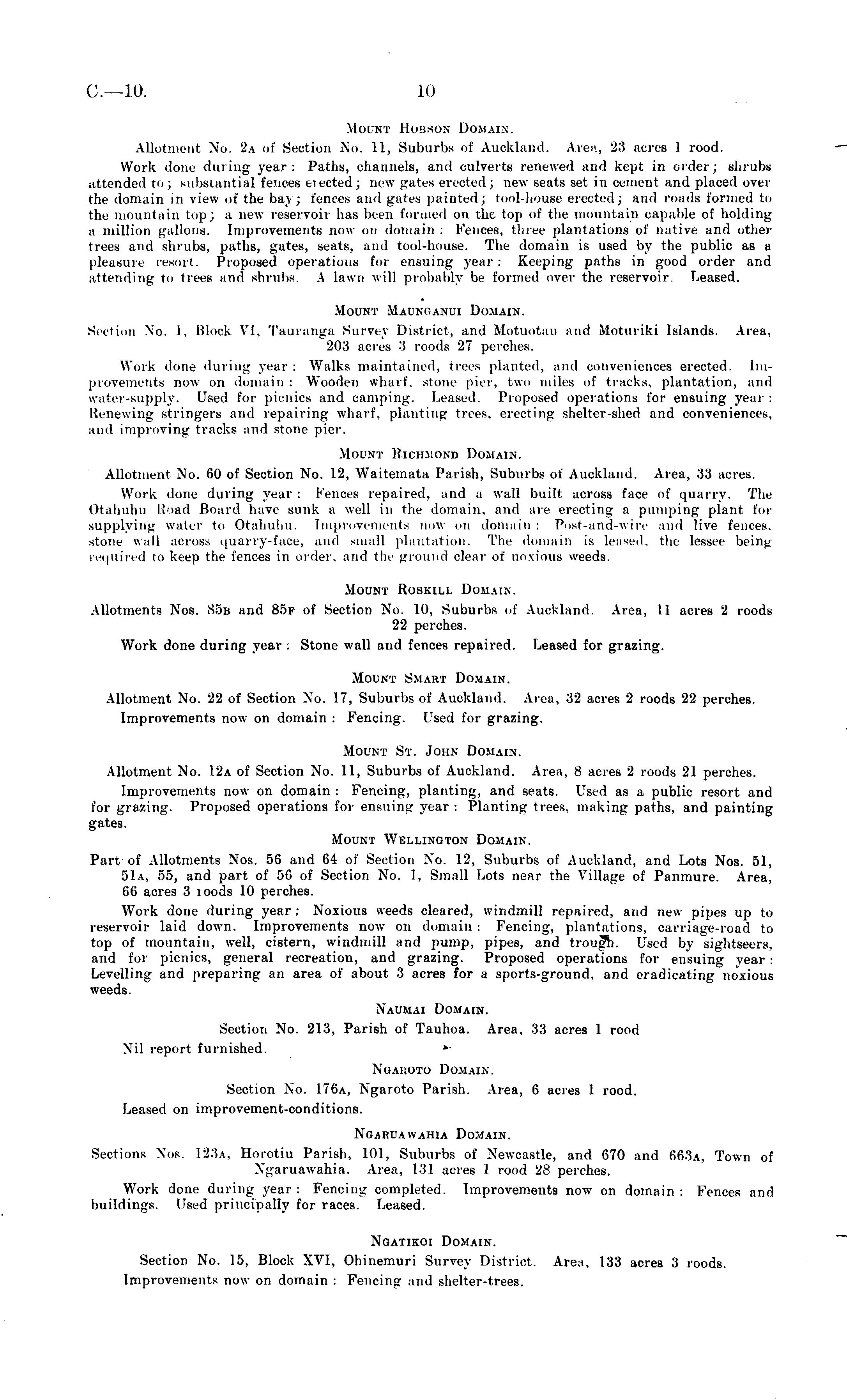 Mount Hobson Domain. Allotment No. 2a of Section No. 11. Suburbs of Auckland. Area,, 23 acres ] rood. Work done during pear: Paths, channels, and culverts renewed and kept in order; shrubs attended to; substantial fences etected; new gates erected; new seats set in cement and placed over the domain in view of the baj ; fences and gates painted; tool-house erected; and roads formed to the mountain top; a new reservoir Ims been Formed on the top of the mountain capable of holding a million gallons. Improvements now on domain : Fences, three plantations of native and other trees and shrubs, paths, gates, seals, and tool-house. The domain is used by the public as a pleasure resort. Proposed operations for ensuing year: Keeping paths in good order and attending to trees and shrubs. .\ lawn will probably be formed over the reservoir. Leased. Mount Maunganui Domain. Section No. I. Block VI, Tauranga Survey District, and Motuotau and Moturiki Islands. Area. 203 acres •"! roods 27 perches. Work done during year: Walks maintained, trees planted, and conveniences erected. Improvements now on domain : Wooden wharf, stone pier, two miles of tracks, plantation, and water-supply. Used for picnics and camping. Leased. Proposed operations for ensuing year : Renewing stringers and repairing wharf, planting trees, erecting shelter-shed and conveniences, and improving tracks and stone pier. Mount Richmond Domain. Allotment No. 60 of Section No. 12, Waitemata Parish, Suburbs of Auckland. Area, 33 acres. Work done duiing year : Fences repaired, and a wall built across face of quarry. The Otahuhu Road Hoard have sunk a well in the domain, and are erecting a pumping plant for supplying water to Otahuhu. Improvements now on domain : Post-and-wire and live fences, stone wall across quarry-face, and small plantation. The domain is leased, the lessee being required to keep the fences in order, and the ground clear of noxious weeds. Mount Roskill Domain. .Allotments Xos. S.">n and Bof of Section No. LO, Suburbs of Auckland. Area, 11 acres 2 roods 22 perches. Work done during year . Stone wall and fences repaired. Leased for grazing. Mount Smart Domain. Allotment No. 22 of Section No. 17, Suburbs of Auckland. Area, 32 acres 2 roods 22 perches. Improvements now on domain : Fencing. Used for grazing. Mount St. John Domain. Allotment No. 12a of Section No. 11, Suburbs of Auckland. Area, 8 acres 2 roods 21 perches. Improvements now on domain : Fencing, planting, and seats. Used as a public resort and for grazing. Proposed operations for ensuing year : Planting trees, making paths, and painting gates. Mount Wellington Domain. Part of Allotments Nos. 56 and 64 of Section No. 12, Suburbs of Auckland, and Lots Nos. 51, 51a, 55, and part of 5G of Section No. 1, Small Lots near the Village of Panmure. Area, 66 acres 3 roods 10 perches. Work done during year : Noxious weeds cleared, windmill repaired, and new pipes up to reservoir laid down. Improvements now on domain: Fencing, plantations, carriage-road to top of mountain, well, cistern, windmill and pump, pipes, and trough. Used by sightseers, and for picnics, general recreation, and grazing. Proposed operations for ensuing year: Levelling and preparing an area of about 3 acres for a sports-ground, and eradicating noxious weeds. Naumai Domain. Section No. 213, Parish of Tauhoa. Area, 33 acres 1 rood Nil report furnished. NoarOTO Domain. Section No. 176 a, Ngaroto Parish. Area, 6 acres 1 rood. Leased on improvement-conditions. Ngaruawahia Domain. Sections Xos. L23a, Horotiu Parish, 101, Suburbs of Newcastle, and 670 and 663 a, Town of Ngaruawahia. Area, 131 acres 1 rood 28 perches. Work done during year : Fencing completed. Improvements now on domain : Fences and buildings. Used principally for races. Leased. Ngatikoi Domain. Seel ion No. 15, Block XVI, Ohinemuri Survey District. Area. 133 acres 3 roods. Improvements now on domain : Fencing and shelter-trees.
