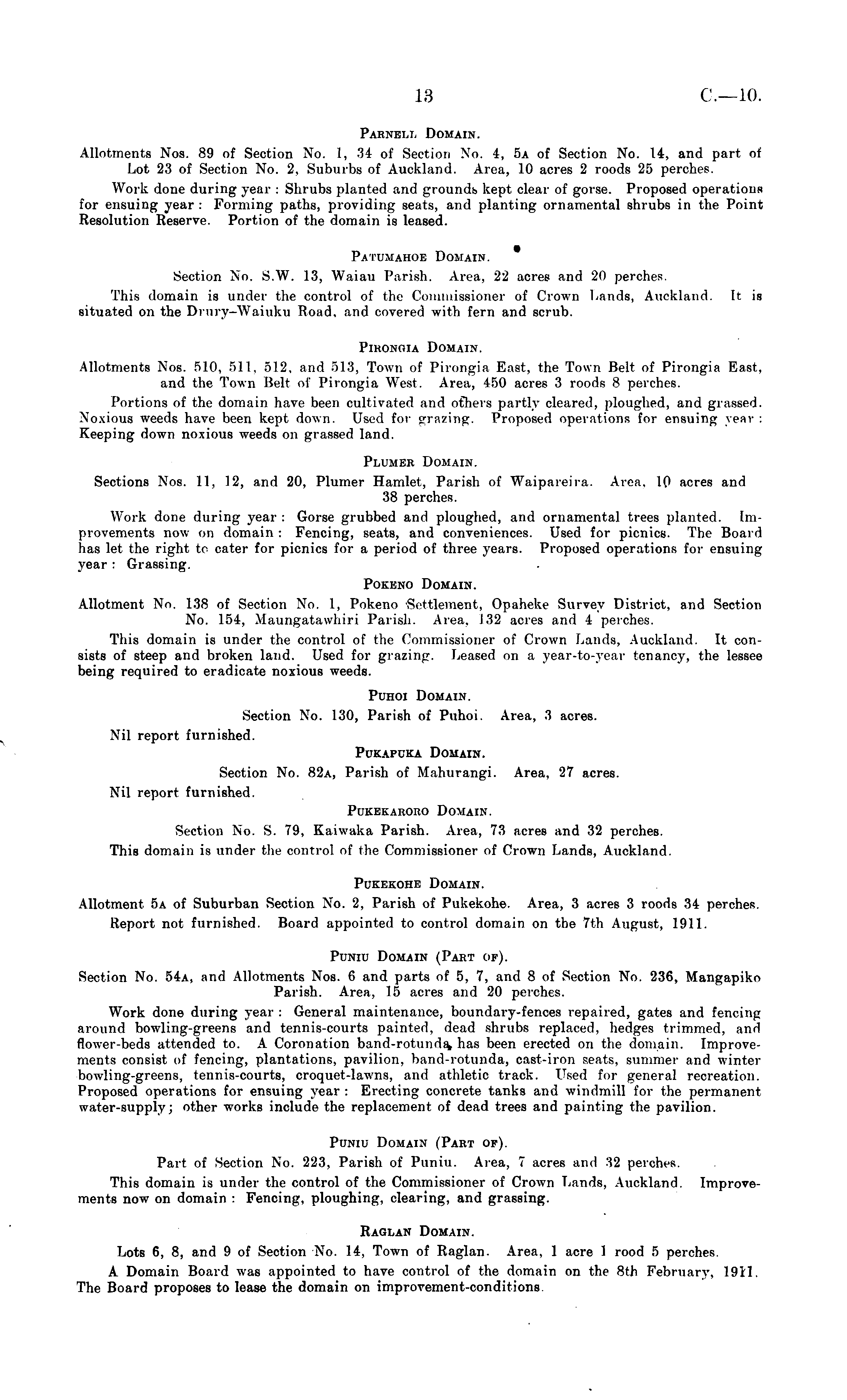 Parneij, Domain. Allotments Nos. 89 of Section No. 1, 34 of Section No. 4, 5a of Section No. 14, and part of Lot 23 of Section No. 2, Suburbs of Auckland. Area, 10 acres 2 roods 25 perches. Work done during year : Shrubs planted and grounds kept clear of gorse. Proposed operations for ensuing year : Forming paths, providing seats, and planting ornamental shrubs in the Point Resolution Reserve. Portion of the domain is leased. Patumahoe Domain. Section No. S.W. 13, Waiau Parish. Area, 22 acres and 20 perches. This domain is under the control of the Commissioner of Crown Lands, Auckland. It is situated on the Drury-Waiuku Road, and covered with fern and scrub. PiKONOiA Domain. Allotments Nos. 510, 511, 512, and 513, Town of Pirongia East, the Town Belt of Pirongia East, and the Town Belt of Pirongia West. Area, 450 acres 3 roods 8 perches. Portions of the domain have been cultivated and others partly cleared, ploughed, and grassed. Noxious weeds have been kept down. Used for grazing. Proposed operations for ensuing veer : Keeping down noxious weeds on grassed land. Plumer Domain. Sections Nos. 11, 12, and 20, Pluiner Hamlet, Parish of Waipareira. Area. 10 acres and 38 perches. Work done during year : Gorse grubbed and ploughed, and ornamental trees planted. Improvements now on domain : Fencing, seats, and conveniences. Used for picnics. The Board has let the right to cater for picnics for a period of three years. Proposed operations for ensuing year : Grassing. Pokeno Domain. Allotment No. 138 of Section No. 1, Pokeno Settlement, Opaheke Survey District, and Section No. 154, Maungatawhiri Parish. Area, 132 acres and 4 perches. This domain is under the control of the Commissioner of Crown Lands, Auckland. It consists of steep and broken land. Used for grazing. Leased on a year-to-year tenancy, the lessee being required to eradicate noxious weeds. Puhoi Domain. Section No. 130, Parish of Puhoi. Area, 3 acres. Nil report furnished. Pukapuka Domain. Section No. 82a, Parish of Mahurangi. Area, 27 acres. Nil report furnished. PUKEKAROHO DOMAIN. Section No. S. 79, Kaiwaka Parish. Area, 73 acres and 32 perches. This domain is under the control of the Commissioner of Crown Lands, Auckland. Pukekohe Domain. Allotment 5a of Suburban Section No. 2, Parish of Pukekohe. Area, 3 acres 3 roods 34 perches. Report not furnished. Board appointed to control domain on the 7th August, 1911. Puniu Domain (Part of). Section No. 54a, and Allotments Nos. 6 and parts of 5, 7, and 8 of Section No. 236, Mangapiko Parish. Area, 15 acres and 20 perdu Work done during year : General maintenance, boundary-fences repaired, gates and fencing around bowling-greens and tennis-coui'ts painted, dead shrubs replaced, hedges trimmed, and flower-beds attended to. A Coronation band-rotunda, has been erected on the domain. Improvements consist of fencing, plantations, pavilion, band-rotunda, cast-iron seats, summer and winter bowling-greens, tennis-courts, croquet-lawns, and athletic track. Used for general recreation. Proposed operations for ensuing year : Erecting concrete tanks and windmill for the permanent water-supply; other works include the replacement of dead trees and painting the pavilion. Puniu Domain (Part of). Part of Section No. 223, Parish of Puniu. Area, 7 acres and 32 perches. This domain is under the control of the Commissioner of Crown Lands, Auckland. Improvements now on domain : Fencing, ploughing, clearing, and grassing. Raglan Domain. Lots 6, 8, and 9of Section No. 14, Town of Raglan. Area, 1 acre I rood 5 perches. A Domain Board was appointed to have control of the domain on the Bth February, 1911. The Board proposes to lease the domain on improvement-conditions.