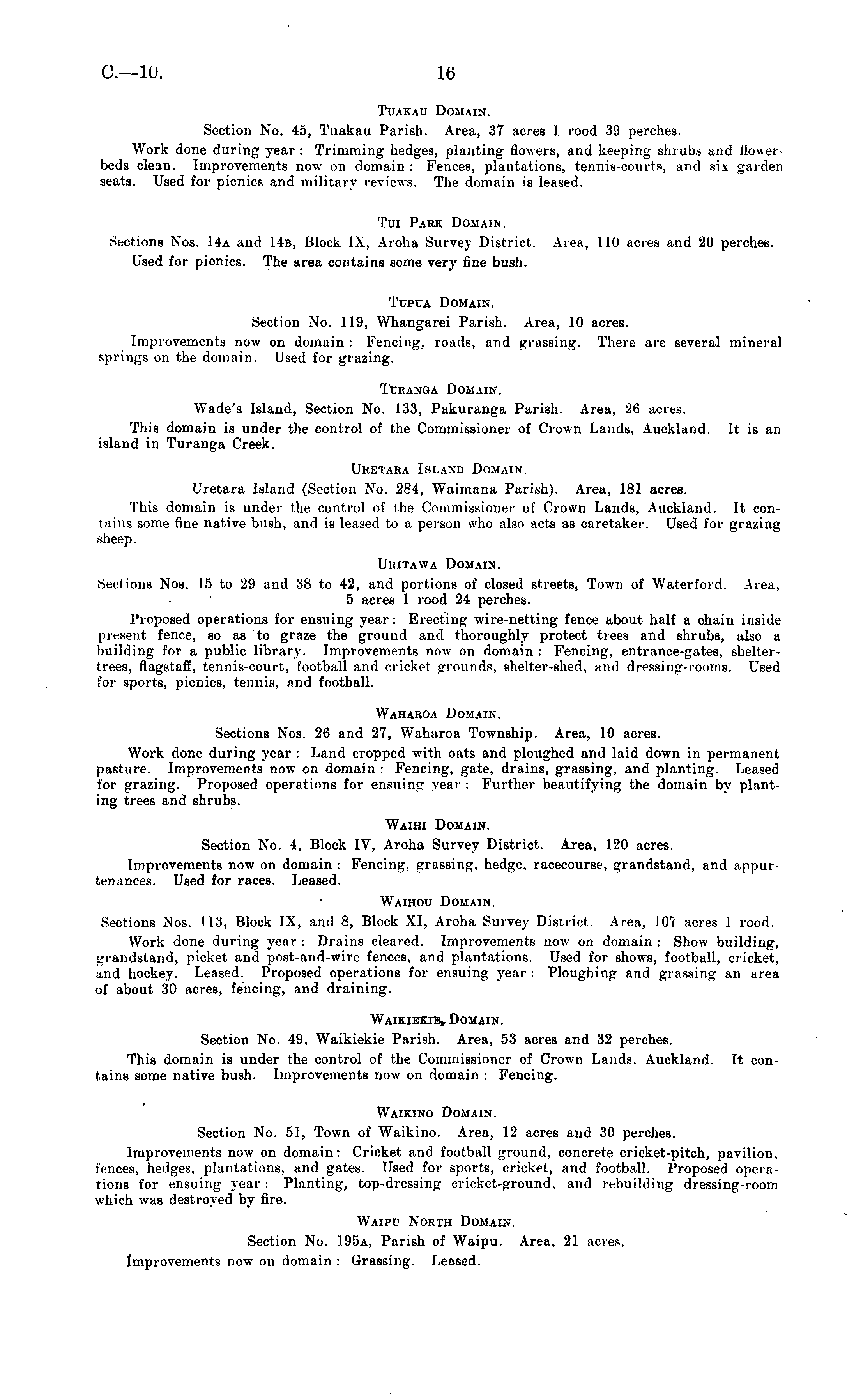 Tuakau Domain. Section No. 45, Tuakau Parish. Area, 37 acres 1. rood 39 perches. Work done during year : Trimming hedges, planting flowers, and keeping shrubs and flowerbeds clean. Improvements now on domain: Fences, plantations, tennis-courts, and si\ garden seats. Used for picnics and military reviews. The domain is leased. Tui Park Domain. Sections Nos. 14a and 14b, Block IX, Aroha Survey District. Area, 110 acres and 20 perches. Used for picnics. The area contains some very fine bush. Tupua Domain. Section No. 119, Whangarei Parish. Area, 10 acres. Improvements now on domain : Fencing, roads, and grassing. There are several mineral springs on the domain. Used for grazing. Turanga Domain. Wade's Island, Section No. 133, Pakuranga Parish. Area, 26 acres. This domain is under the control of the Commissioner of Crown Lands, Auckland. It is an island in Turanga Creek. Uketara Island Domain. Uretara Island (Section No. 284, Waimana Parish). Area, 181 acres. This domain is under the control of the Commissioner of Crown Lands, Auckland. It contains some fine native bush, and is leased to a person who al.su acts as caretaker. Used for grazing sheep. Uμ taw a Domain. Siciions Nos. 15 to 29 and 38 to 42, and portions of closed streets, Town of Waterford. Area, 5 acres 1 rood 24 perches. Proposed operations for ensuing year: Erecting wire-netting fence about half a chain inside l>i.sent fence, so as to graze the ground and thoroughly protect trees and shrubs, also a building for a public library. Improvements now on domain : Fencing, entrance-gates, sheltertrees, flagstaff, tennis-court, football and cricket grounds, shelter-shed, and dressing-rooms. Used for sports, picnics, tennis, and football. Waharoa Domain. Sections Nos. 26 and 27, Waharoa Township. Area, 10 acres. Work done during year : Land cropped with oats and ploughed and laid down in permanent pasture. Improvements now on domain : Fencing, gate, drains, grassing, and planting. Leased for grazing. Proposed operations for ensuing year : Further beautifying the domain by planting trees and shrubs. Waihi Domain. Section No. 4, Block IV, Aroha Survey District. Area, 120 acres. Improvements now on domain : Fencing, grassing, hedge, racecourse, arrandstand, and appurtenances. Used for races. Leased. Waihou Domain. Sections Nos. 113, Block IX, and 8, Block XI, Aroha Survey District. Area, 107 acres 1 rood. Work done during year : Drains cleared. Improvements now on domain : Show building, grandstand, picket and post-and-wire fences, and plantations. Used for shows, football, cricket, and hockey. Leased. Proposed operations for ensuing year : Ploughing and grassing an area of about 30 acres, fencing, and draining. Waikiekie. Domain. Section No. 49, Waikiekie Parish. Area, 53 acres and 32 perches. This domain is under the control of the Commissioner of Crown Lands. Auckland. It contains some native bush. Improvements now on domain : Fencing. Waikino Domain. Section No. 51, Town of Waikino. Area, 12 acres and 30 perches. Improvements now on domain: Cricket and football ground, concrete cricket-pitch, pavilion, fences, hedges, plantations, and gates. Used for sports, cricket, and football. Proposed operations for ensuing year : Planting, top-dressing cricket-ground, and rebuilding dressing-room which was destroyed by fire. Waipu North Domain. Section No. 195 a, Parish of Waipu. Area, 21 acres. Improvements now on domain : Grassing. Leased.