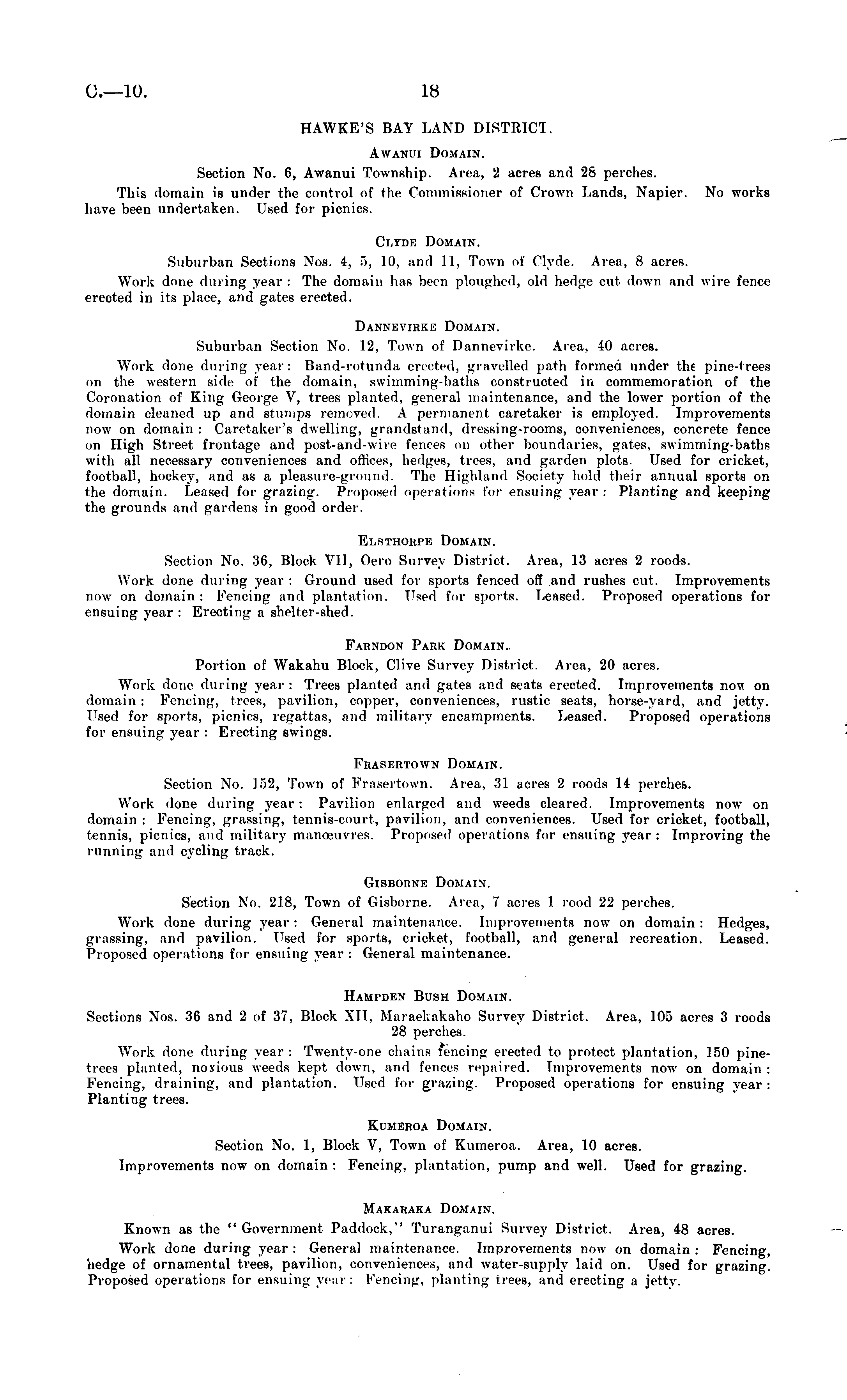 HAWKE'S BAY LAND DISTRICT. Awanui Domain. Section No. 6, Awanui Township. Area, 2 acres and 28 perches. This domain is under the control of the Commissioner of Crown Lands, Napier. No works have been undertaken. Used for picnics. Clyde Domain. Suburban Sections Nos. 4, 5, 10, and 11. Town of Clyde. Area, 8 acres. Work done during year : The domain has been ploughed, old hedge cut down and wire fence erected in its place, and gates erected. Dannevikke Domain. Suburban Section No. 12, Town of Dannevirke. Area, 40 acres. Work done during year: Band-rotunda erected, gravelled path formed under the pine-trees on the western side of the domain, swimming-baths constructed in commemoration of the Coronation of King George V, trees planted, general maintenance, and the lower portion of the domain cleaned up and stumps removed. A permanent caretaker is employed. Improvements now on domain : Caretaker's dwelling, grandstand, dressing-rooms, conveniences, concrete fence on Higli Street frontage and post-and-wire fences on other boundaries, gates, swimming-baths with all necessary conveniences and offices, hedges, trees, and garden plots. Used for cricket, football, hookey, ami as a pleasure-ground. The Highland Society hold their annual sports on the domain. Leased for grazing. Proposed operations Cor ensuing year : Planting and keeping the grounds and gardens in good order. Elsthorpk Domain. Section No. -"iG, Block VII, Oero Survey District. Area, 13 acres 2 roods. Work done during year : Ground used for sports fenced off and rushes cut. Improvements now on domain: Fencing ami plantation. Used for sports. Leased. Proposed operations for ensuing year : Erecting a shelter-shed. Fahndon Park Domain.. Portion of Wakahu Block, Clive Survey District. Area, 20 acres. Work done during year : Trees planted and gates and seats erected. Improvements now on domain : Fencing, trees, pavilion, oopper, conveniences, rustic seats, horse-yard, and jetty. Used for sports, picnics, regattas, and military encampments. Leased. Proposed operations for ensuing year : Erecting swings. Frasertown Domain. Section No. 152, Town of Frasertown. Area, 31 acres 2 roods 14 perches. Work done during year : Pavilion enlarged and weeds cleared. Improvements now on domain : Fencing, grassing, tennis-court, pavilion, and conveniences. Used for cricket, football, tennis, picnics, and military manoeuvres. Proposed operations for ensuing year : Improving the running and cycling track. Gisborne Domain. Section No. 218, Town of Gisborne. Area, 7 acres 1 rood 22 perches. Work done during year : General maintenance. Improvements now on domain : Hedges, grassing, and pavilion. Used for sports, cricket, football, and general recreation. Leased. Proposed operations for ensuing year : General maintenance. Hampden Bush Domain. Sections Nos. 36 and 2of 37, Block XII. Maraekakaho Survey District. Area, 105 acres 3 roods 28 perches. Work done during year : Twenty-one chains fencing erected to protect plantation, 150 pinetrees planted, noxious weeds kept down, and fences repaired, Improvements now on domain : Fencing, draining, and plantation. Used for grazing. Proposed operations for ensuing year : Planting trees. Kumeroa Domain. Section No. 1, Block V, Town of Kumeroa. Area, 10 acres. Improvements now on domain : Fencing, plantation, pump and well. Used for grazing. Makaraka Domain. Known as the " Government Paddock," Turanganui Survey District. Area, 48 acres. Work done during year : General maintenance. Improvements now on domain : Fencing, hedge of ornamental trees, pavilion, conveniences, and water-supply laid on. Used for grazing. Proposed operations for ensuing year: Fencing, planting trees, and erecting a jetty.