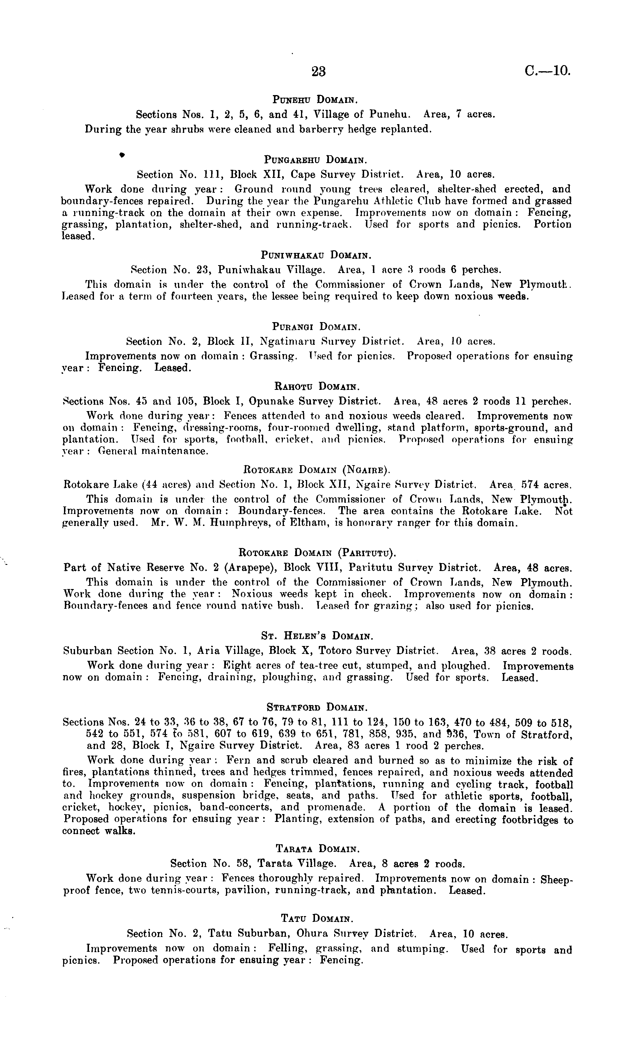 Punehu Domain. Sections Nos. 1, 2, 5, 6, and 41, Village of Punehu. Area, 7 acres. During the year shrubs were cleaned and barberry hedge replanted. PUNGAREHU DOMAIN. Section No. 111, Block XII, Cape Survey District. Area, 10 acres. Work done during year : Ground round young trees cleared, shelter-shed erected, and boundary-fences repaired. During the year the Pungarehu Athletic Club have formed and grassed a running-track on the domain at their own expense. Improvements now on domain : Fencing, grassing, plantation, shelter-shed, and running-track. Used for sports and picnics. Portion leased. Puniwhakau Domain. Section No. 23, Puniwhakau Village. Area, 1 acre 3 roods 6 perches. This domain is under the control of the Commissioner of Crown Lands, New Plymouth. Leased for a term of fourteen years, the lessee being required to keep down noxious weeds. Puranoi Domain. Section No. 2, Block 11, Ngatimaru Survey District. Area, 10 acres. Improvements now on domain : Grassing. I'sed for picnics. Proposed operations for ensuing year : Fencing. Leased. Rahotu Domain. Sections Nos. 4") and 105, Block I, Opunake Survey District. Area, 48 acres 2 roods 11 perches. Work done during year: Fences attended to and noxious weeds cleared. Improvements now on domain : Fencing, dressing-rooms, four-roomed dwelling, stand platform, sports-ground, and plantation. Used for sports, football, cricket, and picnics. Proposed operations for ensuing year : General maintenance. Rotokarb Domain (Ngaire). Rotokare Lake ('44. acres) and Section No. 1, Block XII, Ngaire Survey District. Area 574 acres. This domain is undei the control of the Commissioner of Crown Lands, New Plymouth. Improvements now on domain : Boundary-fences. The area contains the Rotokare Lake. Not generally used. Mr. W. M. Humphreys, of Eltham, is honorary ranger for this domain. Rotokare Domain (Paritutu). Part of Native Reserve No. 2 (Arapepe), Block VIII, Paritutu Survey District. Area, 48 acres. This domain is under the control of the Commissioner of Crown Lands, New Plymouth. Work done during the year : Noxious weeds kept in check. Improvements now on domain : Boundary-fences and fence round native bush. Leased for grazing; also used for picnics. St. Helen's Domain. Suburban Section No. 1, Aria Village, Block X, Totoro Survey District. Area, 38 acres 2 roods. Work done during year : Right acres of tea-tree cut, stumped, and ploughed. Improvements now on domain : Fencing, draining, ploughing, and grassing. Used for sports. Leased. Stratford Domain. Sections Nos. 24 to 33, 36 to 38, 67 to 76, 79 to 81, 111 to 124, 150 to 163, 470 to 484, 509 to 518, 542 to 551, 574 to 581, 607 to 619, 639 to 661, 781, 858, 935, and D 36, Town of Stratford, and 28, Block I, Ngaire Survey District. Area, 83 acres 1 rood 2 perches. Work done during year : Fern and scrub cleared and burned so as to minimize the risk of fires, plantations thinned, trees and hedges trimmed, fences repaired, and noxious weeds attended to. Improvements now on domain : Fencing, plantations, running and cycling track, football and hockey grounds, suspension bridge, seats, and paths. Used for athletic sports, football, cricket, hockey, picnics, band-concerts, and promenade. A portion of the domain is leased. Proposed operations for ensuing year : Planting, extension of paths, and erecting footbridges to connect walks. Tarata Domain. Section No. 58, Tarata Village. Area, 8 acres 2 roods. Work done during year : Fences thoroughly repaired Improvements now on domain : Sheepproof fence, two tennis-courts, pavilion, running-track, and plantation. Leased. Tatu Domain. Section No. 2, Tatu Suburban, Ohura Survey District. Area, 10 acres. Improvements now on domain : Felling, grassing, and stumping. Used for sports and picnics. Proposed operations for ensuing year : Fencing.