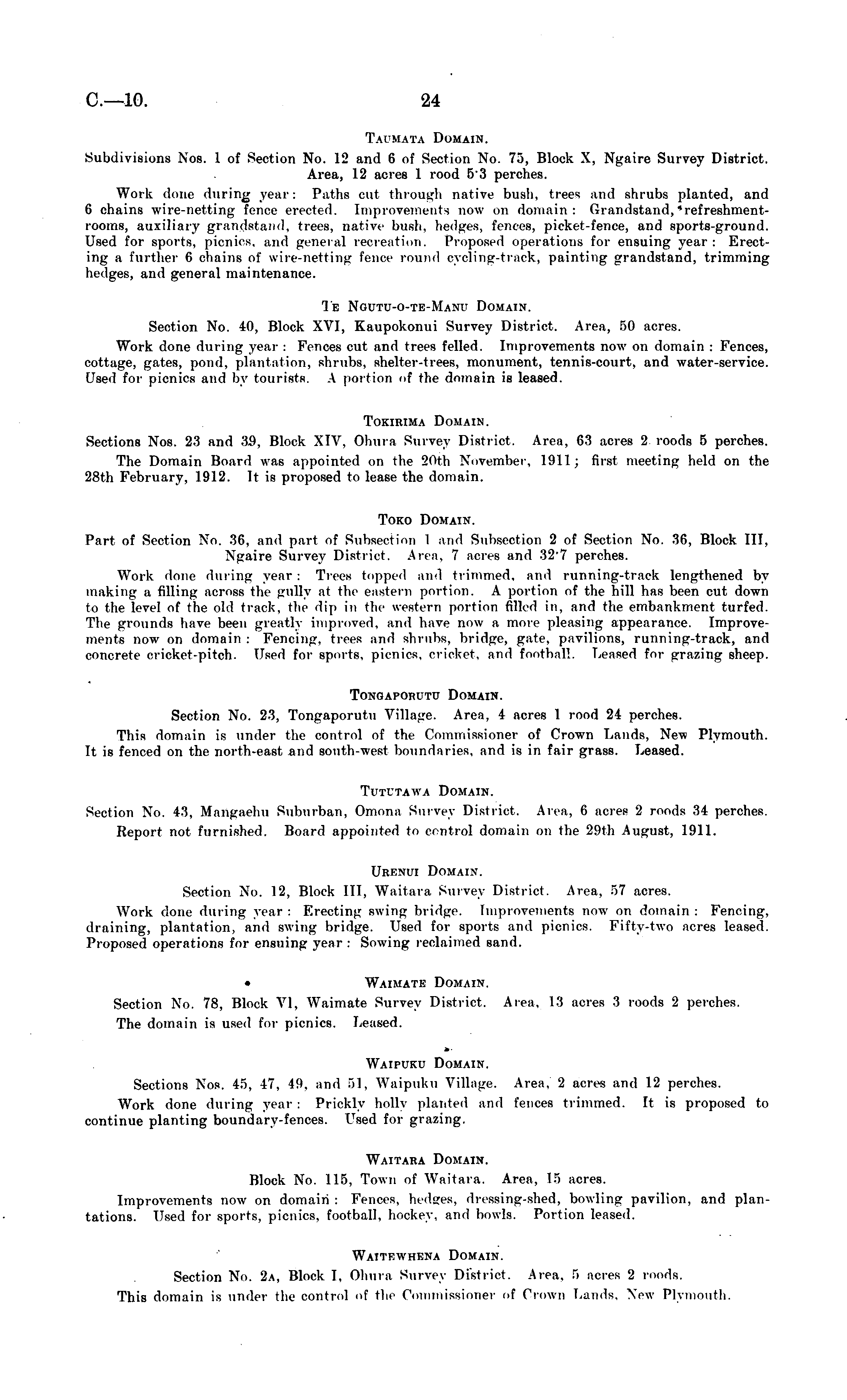 Taumata Domain. Subdivisions Nos. 1 of Section No. 12 and 6 of Section No. 73, Block X, Ngaire Survey District. Area, 12 acres 1 rood 5"3 perches. Work done during year: Paths cut through native bush, trees and shrubs planted, and 6 chains wire-netting fence erected. Improvements now on domain: Grandstand,' refreshmentrooms, auxiliary grandstand, trees, native bush, hedges, fences, picket-fence, and sports-ground. Used for sports, picnics, and general recreation. Proposed operations for ensuing year : Erecting a further 6 chains (if wire-netting fence round cycling-track, painting grandstand, trimming hedges, and general maintenance. Tβ Noutu-o-te-Manu Domain. Section No. 40, Block XVI, Kaupokonui Survey District. Area, 50 acres. Work done during year : Fences cut and trees felled. Improvements now on domain : Fences, cottage, gates, pond, plantation, shrubs, shelter-trees, monument, tennis-court, and water-service. Used for picnics and by tourists. A portion of the domain is leased. Tokirima Domain. Sections Nos. 23 and -'10, Block XIV, Oliura Survey District. Area, 63 acres 2 roods 5 perches. The Domain Hoard was appointed on tlie 20th November, 1911; first meeting held on the 28th February, 1912. It is proposed to lease the domain. Toko Domain. Part of Section No. 36, and part of Subsection 1 and Subsection 2 of Section No. 36, Block 111, Ngaire Survey District. Area. 7 acres and 327 perches. Work done during year: Trees topped and trimmed, and running-track lengthened by making a filling across the gully at the eastern portion. A portion of the hill has been cut down in the level of the old track, the dip in the western portion filled in, and the embankment turfed. The grounds have been greatly improved, and have now a more pleasing appearance. Improvements now on domain : Fencing, trees and shrubs, bridge, gate, pavilions, running-track, and concrete crickot-pitch. Used for sports, picnics, cricket, and football. Leased for grazing sheep. Tongaporutu Domain. Section No. 23, Tongaporutu Village. Area, 4 acres 1 rood 24 perches. This domain is under the control of the Commissioner of Crown Lands, New Plymouth. It is fenced on the north-east and south-west boundaries, and is in fair grass. Leased. Tututawa Domain. Section No. 43, Mangaehu Suburban, Omona Survey District. Ana, 6 acres 2 roods 34 perches. Report not furnished. Board appointed to control domain on the 29th August, 1911. Urenui Domain. Section Xo. 12, Block 111, Waitara Survey District. Area, 57 acres. Work done during year : Erecting swing bridge. Improvements now on domain : Fencing, draining, plantation, and swing bridge. Used for sports and picnics. Fifty-two acres leased. Proposed operations for ensuing year : Sowing reclaimed sand. • Waimate Domain. Section No. 78, Block VI, Waimate Survey District. Area, 13 acres ■'! roods 2 perches. The domain is used for picnics. Leased. Waipuku Domain. Sections Xos. 45, 47, 49, and 51, Waipuku Village. Area, '2 acres and 12 perches. Work done during year : Prickly holly planted ami fences trimmed. It is proposed to continue planting boundary-fences. Used for grazing. Waitara Domain. Block No. 115, Town of Waitara. Area, 15 acres. Improvements now on domain : Fences, hedges, dressing-shed, bowling pavilion, and plantations. Used for sports, picnics, football, hockey, and bowls. Portion leased. Waitewiiena Domain. Section No. 2a, Block I, Ohura Survey District. Area. 5 acres 2 roods. This domain is under the control of the Commissioner of Crown Lands, \e\v Plymouth.