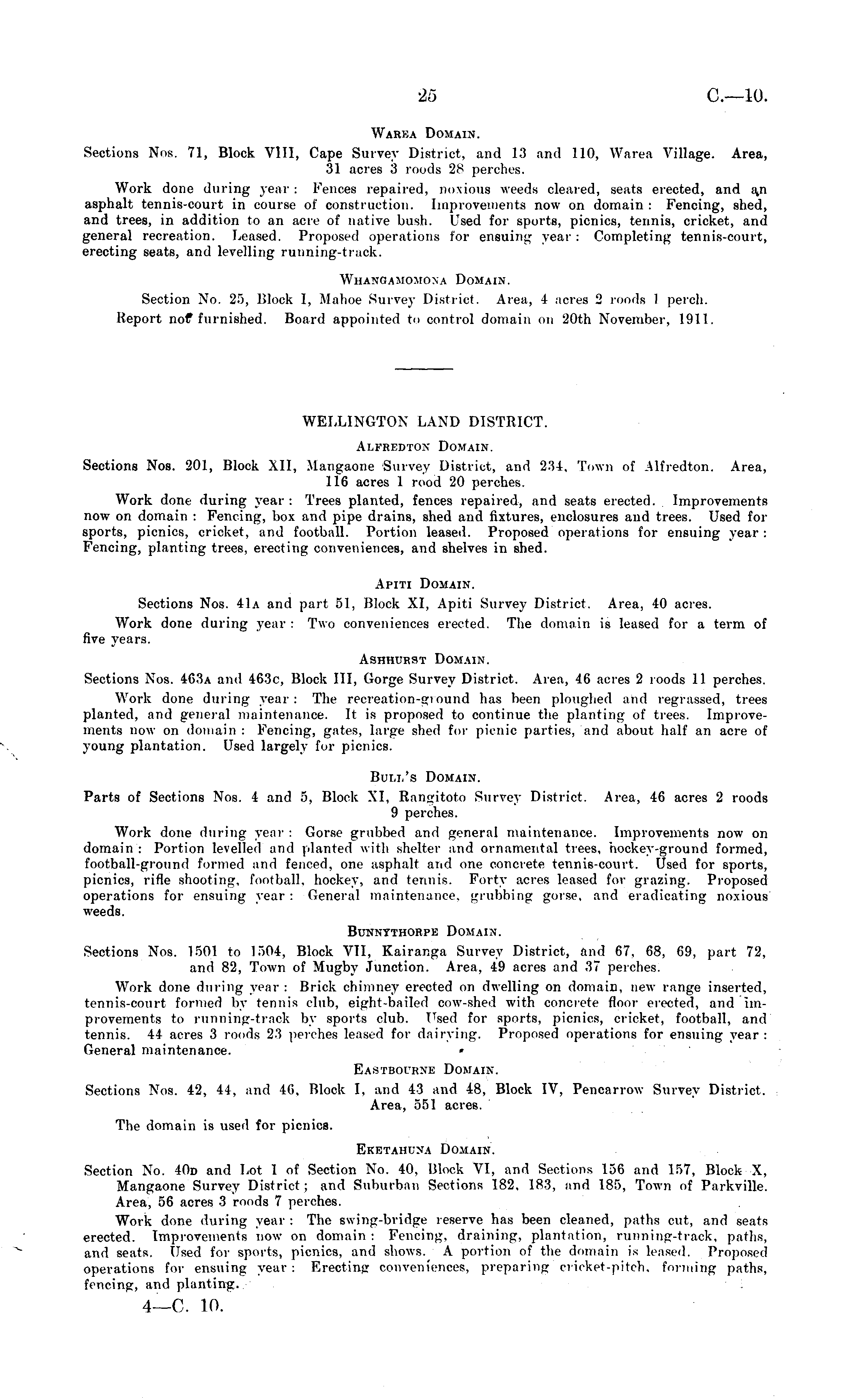 Warka Domain. Sections Nos. 71, Block VIII, Cape Survey District, and 13 and 110, Warea Village. Area, 31 acres •'> roods 28 perches. Work done during year : Fences repaired, iio\i<>us weeds cleared, seats erected, and a,n asphalt tennis-court in course of construction. Improvements now on domain: Fencing, shed, and trees, in addition to an acre of native bush. Used for sports, picnics, tennis, cricket, and general recreation. Leased. Proposed operations for ensuing year: Completing tennis-court, erecting seats, and levelling running-track. Whanoamomona Domain. Section No. 25, Block I, Mahoe Survey District. Area, 4 acres 2 roods I perch. Report nof furnished. Board appointed to control domain on 20th November, 1911. WELLINGTON LAND DISTRICT. Alfredton Domain. Sections Nos. 201, Block XII, Mangaone Survey District, and 234, Town of Alfredton. Area, 116 acres 1 rood 20 perches. Work done during year : Trees planted, fences repaired, and seats erected. Improvements now on domain : Fencing, box and pipe drains, shed and fixtures, enclosures and trees. Used for sports, picnics, cricket, and football. Portion leased. Proposed operations for ensuing year: Fencing, planting trees, erecting conveniences, and shelves in shed. Apiti Domain. Sections Nos. 41a and part 51, Block XI, Apiti Survey District. Area, 40 acres. Work done during year : Two conveniences erected. The domain is leased for a term of five years. Ashhurst Domain. Sections Nos. 463 a and 463 c, Block 111, Gorge Survey District. Area, 46 acres 2 roods 11 perches. Work done during year: The recreation-ground has been ploughed and regrassed, trees planted, and general maintenance. It is proposed to continue the planting of trees. Improvements now on domain : Fencing, gates, large shed for picnic parties, and about half an acre of young plantation. Used largely fur picnics. Bull's Domain. Parts of Sections Nos. 4 and 5, Block XI, Rangitoto Survey District. Area, 46 acres 2 roods 9 perches. Work done during year : Gorse grubbed and general maintenance. Improvements now on domain : Portion levelled and planted with shelter and ornamental trees, hockey-ground formed, football-ground formed and fenced, one asphalt and one concrete tennis-court. Used for sports, picnics, rifle shooting, football, hockey, and tennis. Forty acres leased for grazing. Proposed operations for ensuing year : General maintenance, grubbing gorse, and eradicating noxious weeds. BUNNTTHORPE DOMAIN. Sections Nos. 1501 to 1504, Block VII, Eairanga Survey District, and 67, 68, 69, part 72, and 82, Town of Mugby Junction. Area, 49 acres and •'!? perches! Work done during year : Brick chimney erected on dwelling on domain, new range inserted, tennis-court formed by tennis club, eight-bailed cow-shed with concrete floor erected, and improvements to running-track by sports club. Used for sports, picnics, cricket, football, and tennis. 44 acres 3 roods 23 perches leased for dairying. Proposed operations for ensuing year: General maintenance. Eastbourne Domain. Sections Nos. 42, 44, and 16, Block I, and 43 and 48, Block IV, Pencnrrow Survey District. Area, 551 acres. The domain is used for picnics. Eketahuna Domain. Section No. 40d and Lot 1 of Section No. 40, Block VI, and Sections 156 and 157, Block X, \Fangaone Survey District; and Suburban Sections 182, 183, and 185, Town of Parkville. Area, 56 acres 3 roods 7 perches. Work done during year : The swing-bridge reserve has been cleaned, paths out, and seats erected. Improvements now on domain : Fencing, draining, plantation, running-track, paths, and seats. Used for sports, picnics, and shows. A portion of the domain is leased. Proposed operations for ensuing year: Erecting conveniences, preparing cricket-pitch, forming paths, fencing, and planting.
