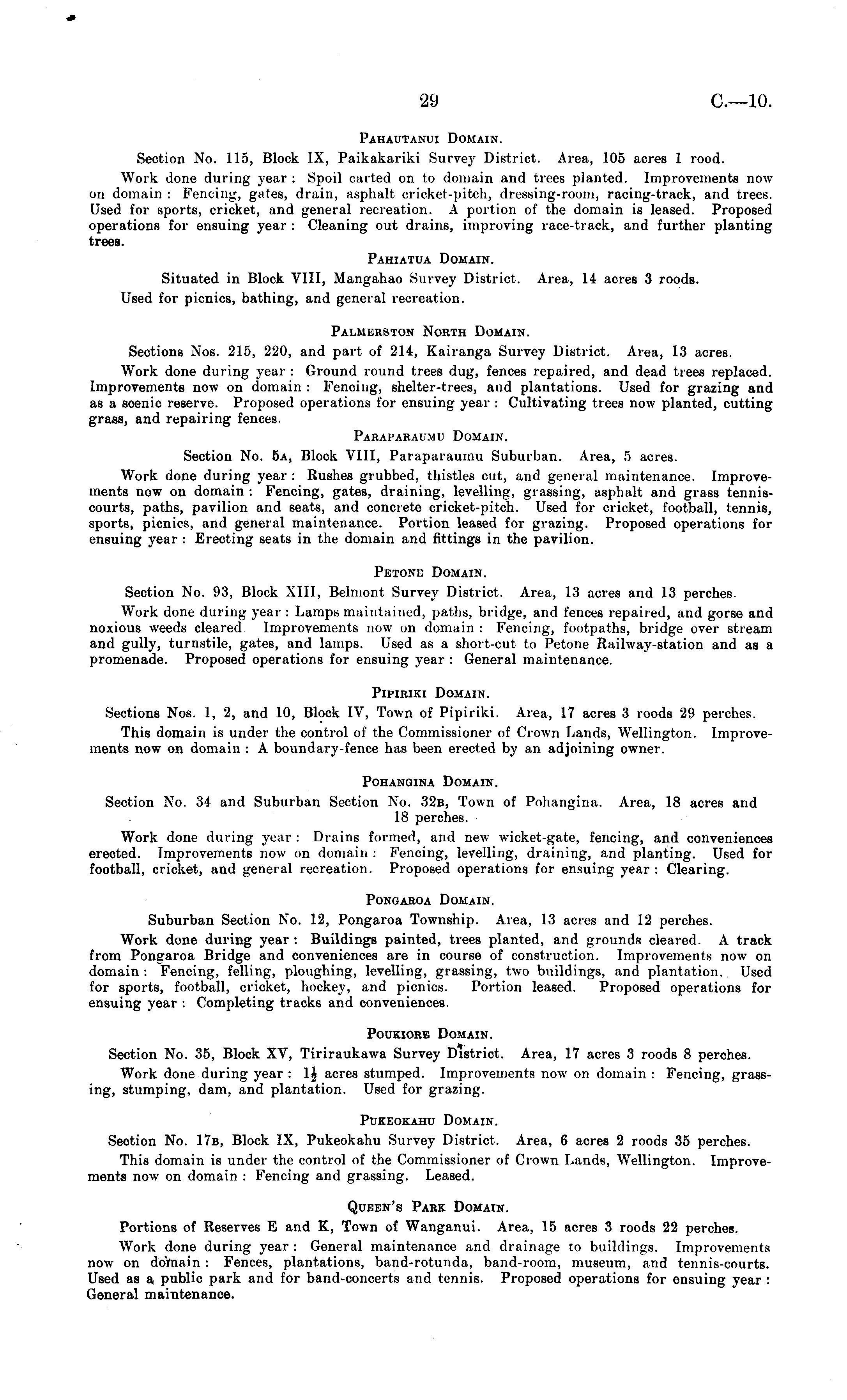 Pahautanui Domain. Section No. 115, Block IX, Paikakariki Survey District. Area, 105 acres 1 rood. Work done during year : Spoil carted on to domain and trees planted. Improvements now on domain : Fencing, gates, drain, asphalt cricket-pitch, dressing-room, racing-track, and trees. Used for sports, cricket, and general recreation. A portion of the domain is leased. Proposed operations for ensuing year : Cleaning out drains, improving race-track, and further planting trees. Pahiatua Domain. Situated in Block VIII, Mangahao Survey District. Area, 14 acres 3 roods. Used for picnics, bathing, and general recreation. Paluerston North Domain. Sections Nos. 215, 220, and part of 214, Kairanga Survey District. Area, 13 acres. Work done during year : Ground round trees dug, fences repaired, and dead trees replaced. Improvements now on domain : Fencing, shelter-trees, and plantations. Used for grazing and as a scenic reserve. Proposed operations for ensuing year : Cultivating trees now planted, cutting grass, and repairing fences. Paraparaumu Domain. Section No. sa, Block VIII, Paraparaumu Suburban. Area, 5 acres. Work done during year : Rushes grubbed, thistles cut, and general maintenance. Improvements now on domain : Fencing, gates, draining, levelling, grassing, asphalt and grass tenniscourts, paths, pavilion and seats, and concrete cricket-pitch. Used for cricket, football, tennis, sports, picnics, and general maintenance. Portion leased for grazing. Proposed operations for ensuing year : Erecting seats in the domain and fittings in the pavilion. Petone Domain. Section No. 93, Block XIII, Belmont Survey District. Area, 13 acres and 13 perches. Work done during year : Lamps maintained, paths, bridge, and fences repaired, and gorse and noxious weeds cleared Improvements now on domain : Fencing, footpaths, bridge over stream and gully, turnstile, gates, and lamps. Used as a short-cut to Petone Railway-station and as a promenade. Proposed operations for ensuing year : General maintenance. Pipiriki Domain. Sections Nos. 1, 2, and 10, Block IV, Town of Pipiriki. Area, 17 acres 3 roods 29 perches. This domain is under the control of the Commissioner of Crown Lands, Wellington. Improvements now on domain : A boundary-fence has been erected by an adjoining owner. Pohangina Domain. Section No. 34 and Suburban Section No. 32b, Town of Pohangina. Area, 18 acres and 18 perches. Work done during year ; Drains formed, and new wicket-gate, fencing, and conveniences erected. Improvements now on domain : Fencing, levelling, draining, and planting. Used for football, cricket, and general recreation. Proposed operations for ensuing year : Clearing. Pongaroa Domain. Suburban Section No. 12, Pongaroa Township. Area, 13 acres and 12 perches. Work done during year : Buildings painted, trees planted, and grounds cleared. A track from Pongaroa Bridge and conveniences are in course of construction. Improvements now on domain: Fencing, felling, ploughing, levelling, grassing, two buildings, and plantation. Used for sports, football, cricket, hockey, and picnics. Portion leased. Proposed operations for ensuing year : Completing tracks and conveniences. Poukiore Domain. Section No. 35, Block XV, Tiriraukawa Survey District. Area, 17 acres 3 roods 8 perches. Work done during year : lj acres stumped. Improvements now on domain : Fencing, grassing, stumping, dam, and plantation. Used for grazing. Pukeokahu Domain. Section No. 17b, Block IX, Pukeokahu Survey District. Area, 6 acres 2 roods 35 perches. This domain is under the control of the Commissioner of Crown Lands, Wellington. Improvements now on domain : Fencing and grassing. Leased. Queen's Park Domain. Portions of Reserves E and X, Town of Wanganui. Area, 15 acres 3 roods 22 perches. Work done during year : General maintenance and drainage to buildings. Improvements now on domain : Fences, plantations, band-rotunda, band-room, museum, and tennis-courts. Used as a public park and for band-concerts and tennis. Proposed operations for ensuing year : General maintenance.