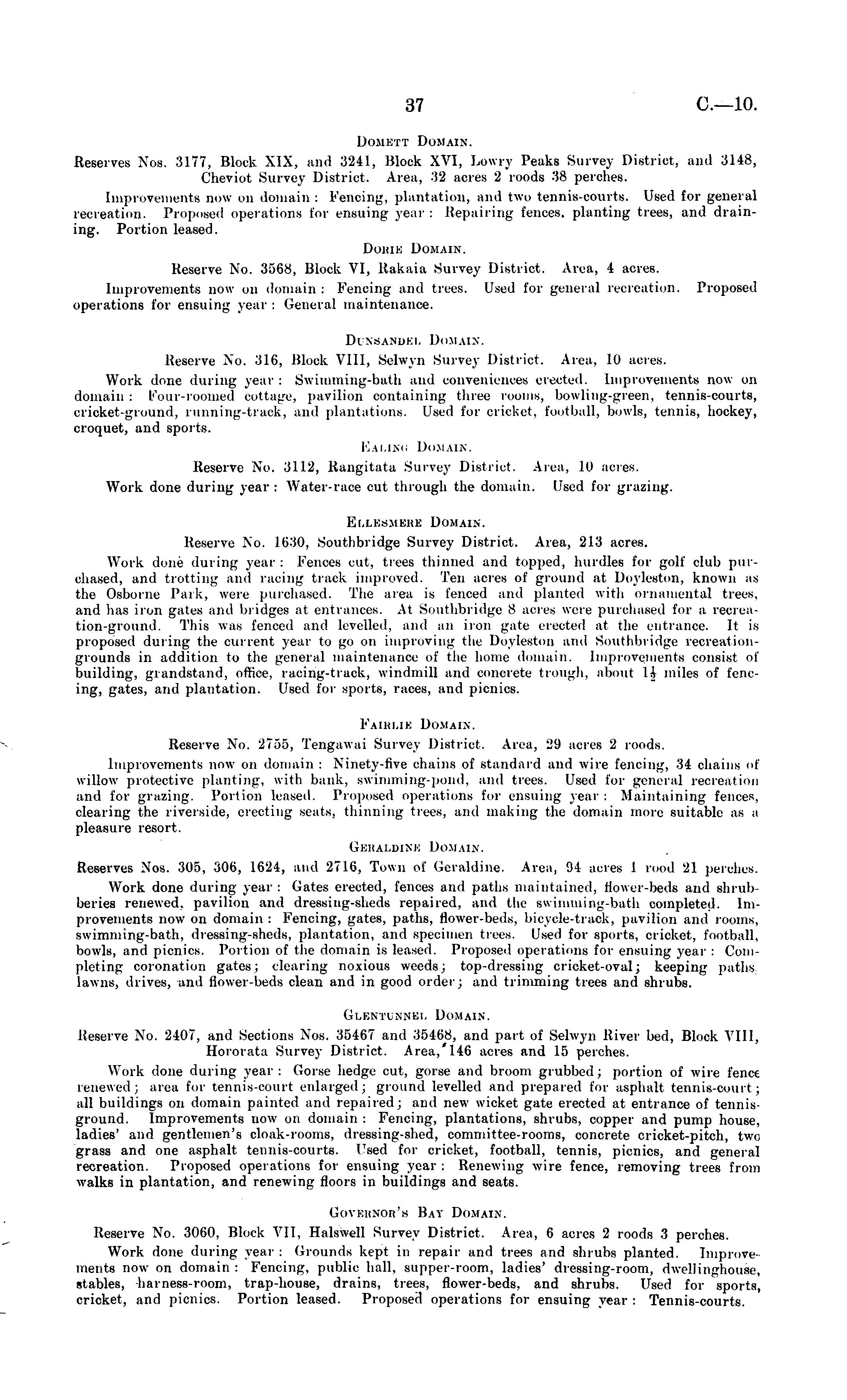 Domett Domain. Reserves Noe. '1177, Block XIX. and 3241, Block XVI, Lowry Peaks Survey District, and 3148, Cheviot Survey District. Area, 32 acres 2 roods '58 perches. Improvements now on domain : Fencing, plantation, and two tennis-courts. Used for general recreation. Proposed operations for ensuing year: Repairing fences, planting trees, and draining. Portion leased. Doric Domain. Reserve No. 3568, Block VI, Rakaia Survey District. Area, 4 acres. Improvements now on domain: Fencing and trees. Used for general recreation. Proposed operations for ensuing year : General maintenance. DuNSANDEL DOMAIN. Reserve No. 316, Hlock VIII, Selwyn Survey District. Area. 10 acres. Work done during year : Swimming-bath and conveniences erected. Improvements now on domain : Four-roomed cottage, pavilion containing three rooms, bowling-green, tennis-courts, cricket-ground, running-track, and plantations. Used for cricket, football, bowls, tennis, hockey, croquet, and sports. Baling Domain. Reserve No. 3112, Rangitata Survey District. Area, in acres. Work done during year : Water-race cut through the domain. Used for grazing. Bllesmebe Domain, Reserve No. 1630, Soutbbridge Survey District. Area, 213 acres. Work done during year : Fences cut, trees thinned and tupped, hurdles for golf club purchased, and trotting and racing track improved. Ten acres of ground at Doyleston, known as the Osborne Park, were purchased. The area is fenced and planted with ornamental trees, and has iron gates and bridges at entrances. At Southbridge 8 acres were purchased for a recrea-tion-ground. This was fenced and levelled, and an iron gate erected at the entrance. It is propose.l during the current year to go on improving the Doyleston ami Southbridge recreationgrounds in addition to the general maintenance of the home domain. Improvements consist of building, grandstand, office, racing-track, windmill and concrete trough, about lj miles of fencing, gates, and plantation. Used for sports, races, and picnics. Faihlie Domain. Reserve No. 2755, Tengawai Survey District. Area, 2!) acres 2 roods. Improvements now on domain : Ninety-five chains of standard and wire fencing, 34 chains of willow protective planting, with bank, swimming-pond, and trees. Used for general recreation and for grazing. Portion leased. Proposed operations for ensuing year : Maintaining fences, clearing the riverside, erecting seats, thinning trees, and making the domain more suitable as a pleasure resort. Geraldine Domain. Reserves Nos. 305, 30(5, 1024, and 2716. Town of Geraldine. Area, !) 1 acres I rood 21 perches. Work done during year : Gates erected, fences ami paths maintained, Hower-beds and shrub beries renewed, pavilion ami dressing-sheds repaired, and the swimming-bath completed. Improvements now on domain: Fencing, gates, paths, flower-beds, bicycle-track, pavilion and rooms, swimming-bath, dressing-sheds, plantation, and specimen trees. Used for sports, cricket, football, bowls, and picnics. Portion of the domain is leased. Proposed operations for ensuing year : Completing coronation gates; clearing noxious weeds; top-dressing cricket-oval; keeping paths lawns, drives, and flower-beds clean and in good order; and trimming trees and shrubs. Glenti nnel Domain, Reserve No. 2407, and Sections Nos. 35467 and 35468, and part of Selwyn River bed, Block VIII, Hororata Survey District. Area,'l46 acres and 15 perches. Work done during year: Oorse hedge cut, gorse and broom grubbed] portion of wire fence renewed; area lor tennis-court enlarged; ground levelled and prepared for asphalt tennis-court; all buildings on domain painted and repaired ; and new wicket gate erected at entrance of tennisground. Improvements now on domain : Fencing, plantations, shrubs, copper and pump house, ladies' and gentlemen's cloak-rooms, dressing-shed, committee-rooms, concrete cricket-pitch, two grass and one asphalt tennis-courts. Used for cricket, football, tennis, picnics, and general recreation. Proposed operations for ensuing year : Renewing wire fence, removing trees from walks in plantation, and renewing floors in buildings and seats. Governor's Hay Domain. Reserve No. 3060, Block VII, Halswell Survey District. Area, 6 acres 2 roods 3 perches. Work done during year : Grounds kept in repair and trees and shrubs planted. Improvements now on domain : Fencing, public hall, supper-room, ladies' dressing-room, dwell inghouse, stables, harness-room, trap-house, drains, trees, flower-beds, and shrubs. Used for sports, cricket, and picnics. Portion leased. Proposed operations for ensuing year : Tennis-courts.
