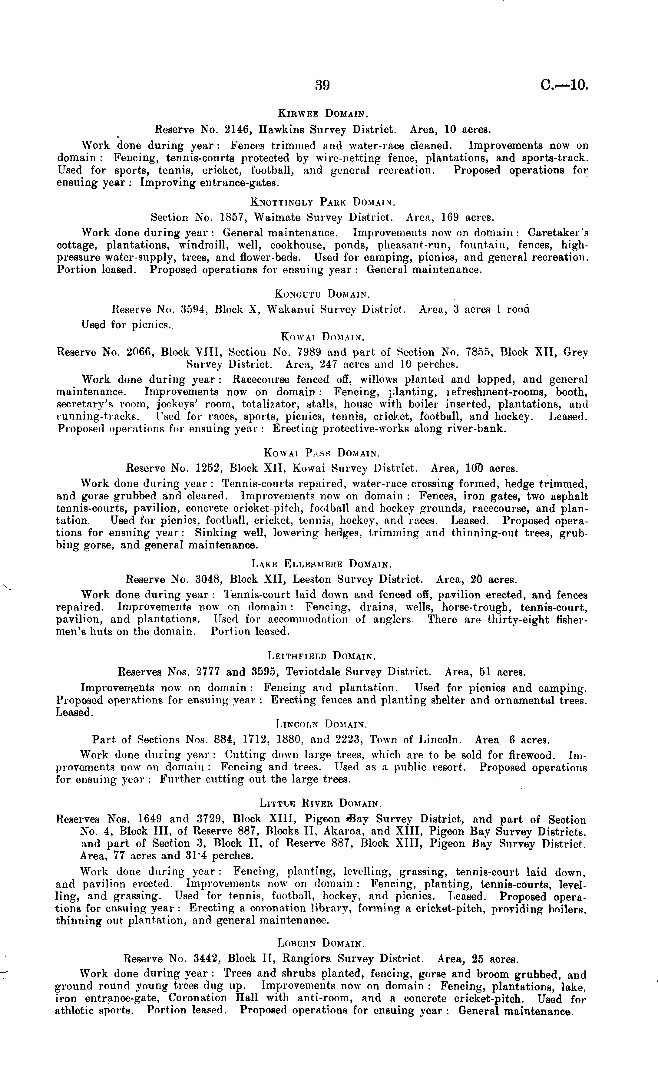 Kirwee Domain. Reserve No. 2146, Hawkins Survey District. Area, 10 acres. Work done during year : Fences trimmed end water-race cleaned. Improvements now on domain : Fencing, tennis-courts protected by wire-netting fence, plantations, and sports-track. Used for sports, tennis, cricket, football, and general recreation. Proposed operations for ensuing year : Improving entrance-gates. Knottingly Park Domain. Section No. 1857, Waimate Survey District. Area, 169 acres. Work done during year : General maintenance. Improvements now on domain : Caretaker's* cottage, plantations, windmill, well, cookhouse, ponds, pheasant-run, fountain, fences, highpressure water-supply, trees, and flower-beds. Used for camping, picnics, and general recreation. Portion leased. Proposed operations for ensuing year : General maintenance. KONGUTU DOMAIN. Reserve No. ."5594, Block X, Wakanui Survey District. Area, 3 acres 1 rood Used for picnics. Kowai Domain. Reserve No. 2066, Block VIII, Section No. 7989 and part of Section No. 7855, Block XII, Grey Survey District. Area, 247 acres and 10 perches. Work done during year : Racecourse fenced off, willows planted and lopped, and general maintenance. Improvements now on domain : Fencing, planting, lefreshment-rooms, booth, secretary's room, jockeys' room, totalizator, stalls, house with boiler inserted, plantations, and running-tracks. Used for races, sports, picnics, tennis, cricket, football, and hockey. Leased. Proposed operations lor ensuing year : Erecting protective-works along river-bank. Kowai Pass Domain. Reserve No. 1252, Block XII, Kowai Survey District. Area, 100 acres. Work done during year : Tennis-courts repaired, water-race crossing formed, hedge trimmed, and gorse grubbed and cleared. Improvements now on domain : Fences, iron gates, two asphalt tennis-courts, pavilion, concrete cricket-pitch, football and hockey grounds, racecourse, and plantation. Used for picnics, football, cricket, tennis, hockey, and races. Leased. Proposed operations for ensuing year: Sinking well, lowering hedges, trimming and thinning-out trees, grubbing gorse, and general maintenance. Lake Ellesmere Domain. Reserve No. 3048, Block XII, Leeston Survey District. Area, 20 acres. Work done during year : Tennis-court laid down and fenced off, pavilion erected, and fences repaired. Improvements now on domain : Fencing, drains, wells, horse-trough, tennis-court, pavilion, and plantations. Used for accommodation of anglers. There are thirty-eight fishermen's huts on the domain. Portion leased. Leithfield Domain. Reserves Nos. 2777 and 3595, Teviotdale Survey District. Area, 51 acres. Improvements now on domain : Fencing and plantation. Used for picnics and camping. Proposed operations for ensuing year : Erecting fences and planting shelter and ornamental trees. Leased. Lincoln Domain. Part of Sections Nos. 884, 1712, 1880, and 2223, Town of Lincoln. Area. 6 acres. Work done during year : Cutting down large trees, which are to be sold for firewood. Improvements now on domain : Fencing and trees. Used as a public resort. Proposed operations for ensuing year : Further cutting out the large trees. Little River Domain. Reserves Nos. 1649 and 3729, Block XIII, Pigeon -Bay Survey District, and part of Section No. 4, Block 111, of Reserve 887, Blocks 11, Akaroa, and XIII, Pigeon Bay Survey Districts, and part of Section 3, Block 11, of Reserve 887, Block XIII, Pigeon Bay Survey District Area, 77 acres and 81*4 perches. Work done during year : Fencing, planting, levelling, grassing, tennis-court laid down, and pavilion erected. Improvements now on domain : Fencing, planting, tennis-courts, levelling, and grassing. Used for tennis, football, hockey, and picnics. Leased. Proposed operations for ensuing year : Erecting a coronation library, forming a cricket-pitch, providing boilers, thinning out plantation, and general maintenance. Lobcrn Domain. Reserve No. 3442, Block 11, Rangiora Survey District. Area, 25 acres. Work done during year : Trees and shrubs planted, fencing, gorse and broom grubbed, and ground round young trees dug up. Improvements now on domain : Fencing, plantations, lake, iron entrance-gate, Coronation Hall with anti-room, and a concrete cricket-pitch. Used for athletic sports. Portion leased. Proposed operations for ensuing year: General maintenance.