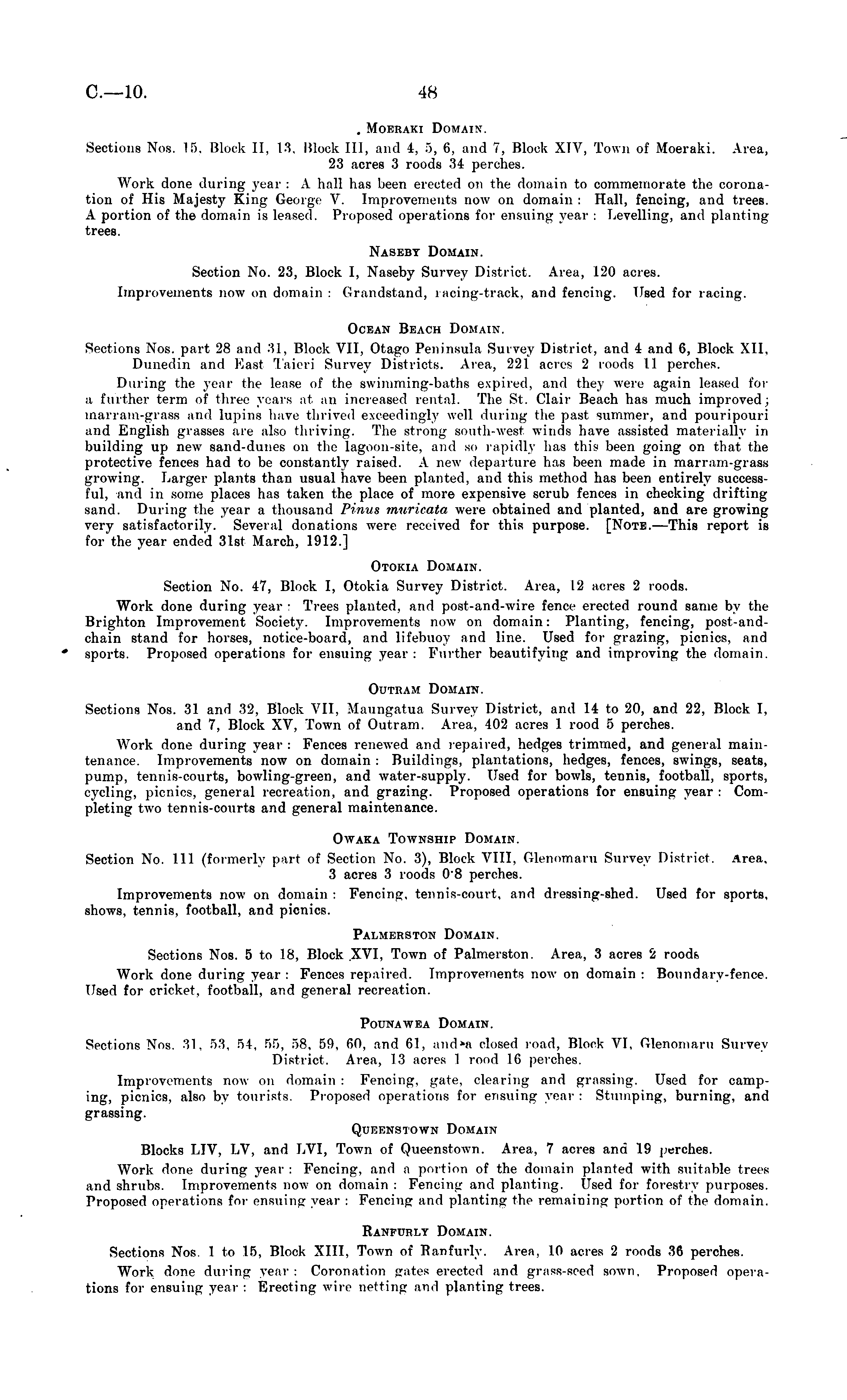 . Moeraki Domain. Sections Nos. 15, Block 11, 13, Block 111, and 4, 5, 6, and 7, Block XIV, Town of Moeraki. Area, 23 acres 3 roods 34 perches. Work done during- year : A hall lias been erected on the domain to commemorate the coronation of His Majesty King George V. Improvements now on domain : Hall, fencing, and trees. A portion of the domain is leased. Proposed operations for ensuing year : Levelling, and planting trees. Nasebt Domain. Section No. 23, Block I, Naseby Survey District. Area, 120 acres. Improvements now on domain : Grandstand, racing-track, and fencing. Used for racing. Ocean Beach Domain. Sections Nos. part 28 and 31, Block VII, Otago Peninsula Survey District, and 4 and 6, Block XII, Dunedin and Mast Taieri Survey Districts. Area, 221 acres 2 roods 11 perches, During the year the lease of the swimming-baths expired, and they were again leased for a further term of three years at an increased rental. The St. Clair Beach has much improved; marram-grass and lupins have thrived exceedingly well during the past summer, and pouripouri and English glasses are also thriving. The strong south-west winds have assisted materially in building up new sand-dunes on the lagoon-site, and so rapidly has this been going on that the protective fences had to be constantly raised. A new departure has been made in marram-grass growing. Larger plants than usual have been planted, and this method has been entirely successful, and in some places has taken the place of more expensive scrub fences in checking drifting sand. During the year a thousand Pinus muricata were obtained and planted, and are growing very satisfactorily. Several donations were received for this purpose. [Note. —This report is for the year ended 31st March, 1912.] Otokia Domain. Section No. 47, Block I, Otokia Survey District. Area, 12 acres 2 roods. Work done during year : Trees planted, and post-and-wire fence erected round same by the Brighton Improvement Society. Improvements now on domain: Planting, fencing, post-and-chain stand for horses, notice-board, and lifebuoy and line. Used for grazing, picnics, and sports. Proposed operations for ensuing year : Further beautifying and improving the domain. Outkam Domain. Sections Nos. 31 and 32, Block VII, Maungatua Survey District, and 14 to 20, and 22, Block I, and 7, Block XV, Town of Outram. Area, 402 acres 1 rood 5 perches. Work done during year : Fences renewed and repaired, hedges trimmed, and general maintenance. Improvements now on domain : Buildings, plantations, hedges, fences, swings, seats, pump, tennis-courts, bowling-green, and water-supply. Used for bowls, tennis, football, sports, cycling, picnics, general recreation, and grazing. Proposed operations for ensuing year : Completing two tennis-courts and general maintenance. Owaka Township Domain. Section No. 11l (formerly part of Section No. 3), Block VIII, Glenomaru Survey District. Area, 3 acres 3 roods oB perches. Improvements now on domain : Fencing, tennis-court, and dressing-shed. Used for sports, shows, tennis, football, and picnics. Pai.merston Domain. Sections Nos. sto 18, Block XVI, Town of Palmerston. Area, 3 acres 2 roods Work done during year : Fences repaired. Improvements now on domain : Boundary-fence. Used for cricket, football, and general recreation. Pounawea Domain. Sections Nos. 31, 53, 54, 55, 58, 59, 60, rmd 61, anchw closed mad, Block VI, Glenomaru Survey District. Area, 13 acres 1 rood 16 perches. Improvements now on domain : Fencing, gate, clearing and grassing. Used for camping, picnics, also by tourists. Proposed operations for ensuing year: Stumping, burning, and grassing. QuEENSTOWN DOMAIN Blocks IJV, LV, and LVI, Town of Queenstown. Area, 7 acres and 19 perches. Work done during year : Fencing, and a portion of the domain planted with suitable trees and shrubs. Improvements now on domain : Fencing and planting. Used for forestry purposes. Proposed operations for ensuing year : Fencing and planting the remaining portion of the domain, Ranfurly Domain. Sections Nos. 1 to 15, Block XIII, Town of Ranfurly. Area, 10 acres 2 roods 36 perches. Work done during year: Coronation gates erected .-md grass-seed sown. Proposed operations for ensuing year : Erecting wire netting and planting trees.