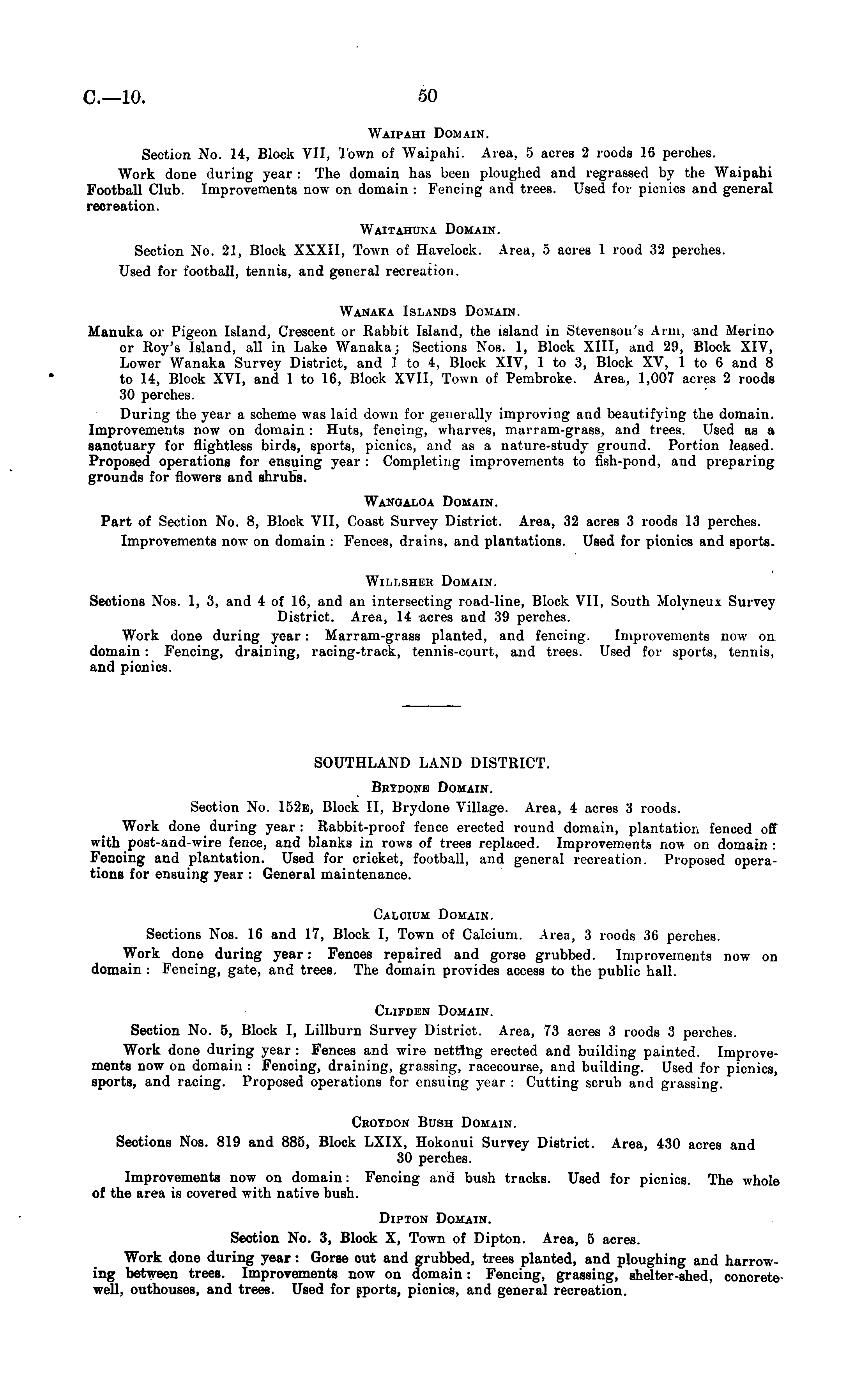 Waipahi Domain. Section No. 14, Block VII, Town of Waipahi. Area, 5 acres 2 roods 16 perches. Work done during year : The domain has been ploughed and regrassed by the Waipahi Football Club. Improvements now on domain : Fencing and trees. Used for picnics and general recreation. Waitahuna Domain. Section No. 21, Block XXXII, Town of Havelock. Area, 5 acres 1 rood 32 perches. Used for football, tennis, and general recreation. Wanaka Islands Domain. Manuka or Pigeon Island, Crescent or Rabbit Island, the island in Stevenson's Arm, and Merino or Roy's Island, all in Lake Wanaka; Sections Nos. 1, Block XIII, and 29, Block XIV, Lower Wanaka Survey District, and 1 to 4, Block XIV, 1 to 3, Block XV, 1 to 6 and 8 to 14, Block XVI, and 1 to 16, Block XVII, Town of Pembroke. Area, 1,007 acres 2 roods 30 perches. During the year a scheme was laid down for generally improving and beautifying the domain. Improvements now on domain : Huts, fencing, wharves, marram-grass, and trees. Used as a sanctuary for flightless birds, sports, picnics, and as a nature-study ground. Portion leased. Proposed operations for ensuing year : Completing improvements to fish-pond, and preparing grounds for flowers and shrubs. Wangaloa Domain. Part of Section No. 8, Block VII, Coast Survey District. Area, 32 acres 3 roods 13 perches. Improvements now on domain : Fences, drains, and plantations. Used for picnics and sports. Willsher Domain. Sections Nos. 1, 3, and 4 of 16, and an intersecting road-line, Block VII, South Molyneux Survey District. Area, 14 acres and 39 perches. Work done during year : Marram-grass planted, and fencing. Improvements now on domain : Fencing, draining, racing-track, tennis-court, and trees. Used for sports, tennis, and picnics. SOUTHLAND LAND DISTRICT. Brydone Domain. Section No. 152e, Block 11, Brydone Village. Area, 4 acres 3 roods. Work done during year : Rabbit-proof fence erected round domain, plantation fenced off with post-and-wire fence, and blanks in rows of trees replaced. Improvements nov on domain : Fencing and plantation. Used for cricket, football, and general recreation. Proposed operations for ensuing year : General maintenance. Calcium Domain. Sections Nos. 16 and 17, Block I, Town of Calcium. Area, 3 roods 36 perches. Work done during year: Fences repaired and gorse grubbed. Improvements now on domain : Fencing, gate, and trees. The domain provides access to the public hall. Clifden Domain. Section No. 5, Block I, Lillburn Survey District. Area, 73 acres 3 roods 3 perches. Work done during year : Fences and wire netting erected and building painted. Improvements now on domain : Fencing, draining, grassing, racecourse, and building. Used for picnics, sports, and racing. Proposed operations for ensuing year : Cutting scrub and grassing. Crotdon Bush Domain. Sections Nos. 819 and 885, Block LXIX, Hokonui Survey District. Area, 430 acres and 30 perches. Improvements now on domain: Fencing and bush tracks. Used for picnics. The whole of the area is covered with native bush. Dipton Domain. Section No. 3, Block X, Town of Dipton. Area, 5 acres. Work done during year: Gorse cut and grubbed, trees planted, and ploughing and harrowing between trees. Improvements now on domain: Fencing, grassing, shelter-shed, concrete well, outhouses, and trees. Used for sports, picnics, and general recreation.
