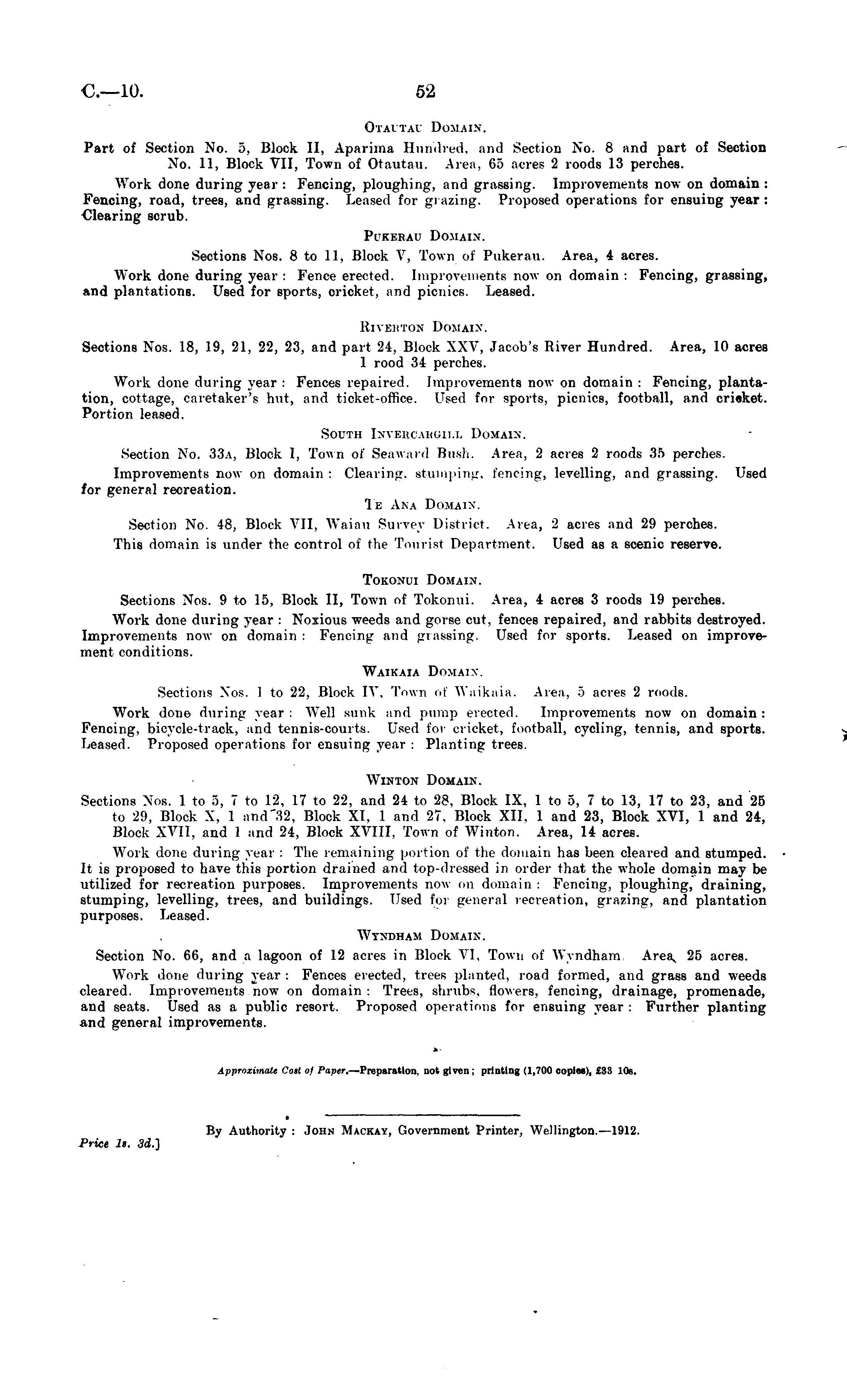 Otaiiai Domain. Part of Section No. 3. Block 11, Apariina Hundred, and Suction No. 8 and part of Section No. 11, Block VII. Town of Otautau. Area, 65 acres 2 roods 13 perches. Work done during year : Fencing, ploughing, and grassing. Improvements now on domain : Fencing, road, trees, and grassing. Leased for grazing. Proposed operations for ensuing year : Clearing scrub. PiKKiiAu Domain. Sections Nos. Bto 11, Block V, Town of Pukerau. Area, 4 acres. Work done during year : Fence erected. Improvements now on domain : Fencing, grassing, and plantations. Used for sports, cricket, and picnics. leased. RITERTOH Domain. Sections Nos. 18, 19, 21, 22, 23, and part 24, Block XXV, Jacob's River Hundred. Area, 10 acres 1 rood 34 perches. Work done during year : Fences repaired. Improvements now on domain : Fencing, plantation, cottage, caretaker's hut, and ticket-office. Used for sports, picnics, football, and cricket. Portion leased. South Invercakgill Domain. Section No. 33a, Block I, Town of Seaward Hush. Area, 2 acres 2 roods 35 perches. Improvements now on domain : Clearing, stumping, fencing, levelling, and grassing. Used for general recreation. Te Ana Domain. Section No. 48, Block VII, Waiau Survey District. Area, 2 acres and 29 perches. This domain is under the control of the Tourist Department. Used as a scenic reserve. Tokonui Domain. Sections Nos. 9to 15, Block 11, Town of Tokonui. Area, 4 acres 3 roods 19 perches. Work done during year : Noxious weeds and gorse cut, fences repaired, and rabbits destroyed. Improvements now on domain: Fencing and grassing. Used for sports. Leased on improvement conditions. Waikaia Domain. Sections Nos. Ito 22, Block IV. Town of Waikaia. Area. 5 acres 2 roods. Work done during year : Well sunk and pump erected. Improvements now on domain : Fencing, bicycle-track, and tennis-courts. Used for cricket, football, cycling, tennis, and sports. Leased. Proposed operations for ensuing year : Planting trees. Winton Domain. Sections Nos. 1 to 5, 7 to 12, 17 to 22, and 24 to 28, Block IX. 1 to 5, 7 to 13, 17 to 23, and 25 to 29, Block X, 1 and"32, Block XI, 1 and 27, Block XII, 1 and 23, Block XVI, 1 and 24, Block XVII, and 1 and 24, Block XVIII, Town of Winton. Area, 14 acres. Work done during year : The remaining portion of the domain has been cleared and stumped. It is proposed to have this portion drained and top-dressed in order that the whole domain may be utilized for recreation purposes. Improvements now on domain : Fencing, ploughing, draining, stumping, levelling, trees, and buildings. Used foi general recreation, grazing, and plantation purposes. Leased. Wyndham Domain. Section No. 66, and a lagoon of 12 acres in Block VI. Town of Wyndham Area. 25 acres. Work done during year : Fences erected, tiers planted, road formed, and grass and weeds cleared. Improvements now on domain : Trees, shrubs, flowers, fencing, drainage, promenade, and seats. Used as a public resort. Proposed operations for ensuing year : Further planting and general improvements.