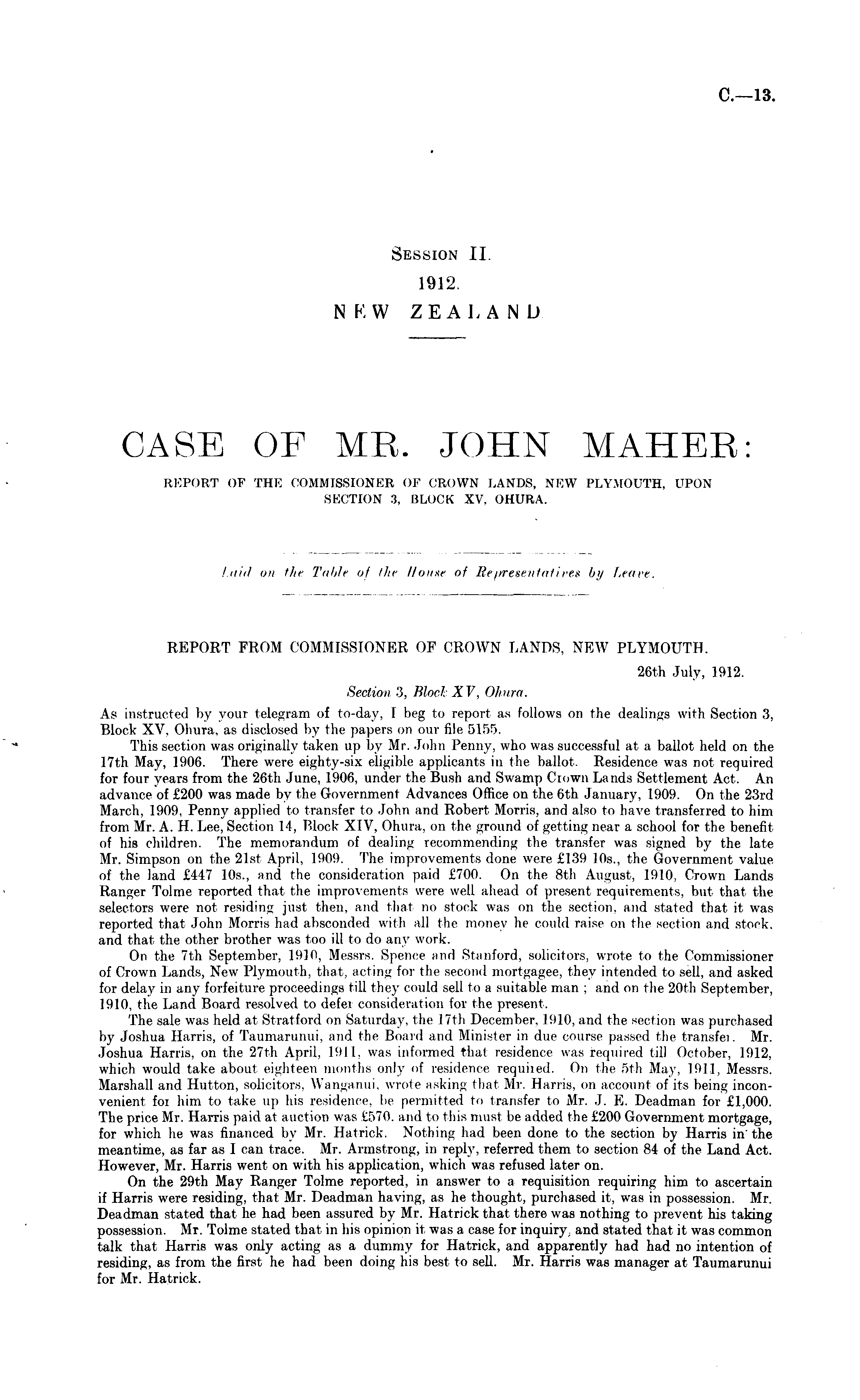 CASE OF MR. JOHN MAHER: REPORT OF THE COMMISSIONER OF CROWN LANDS, NEW PLYMOUTH, UPON SECTION 3, BLOCK XV, OHURA.