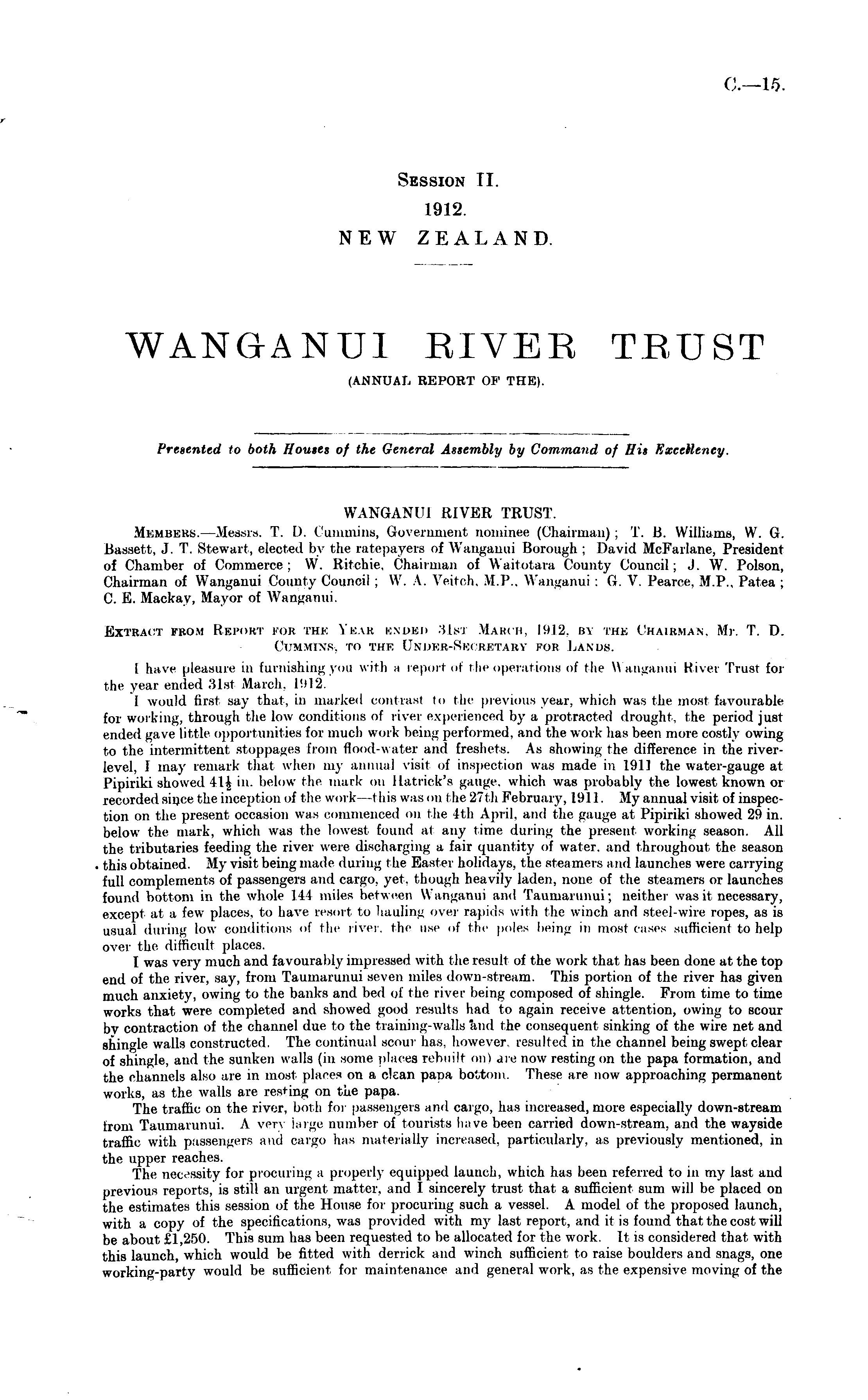 WANGANUI RIVER TRUST. Mkmbeus. —Messrs. T. I). Cummins, Government nominee (Chairman) ; T. B. Williams, W. G. Bassett, J. T. Stewart, elected by the ratepayers of Wanganui Borough ; David McFarlane, President of Chamber of Commerce; W. Ritchie. Chairman of Waitotara County Council; J. W. Poison, Chairman of Wanganui County Council ;W. A. Veitch, M.1 , .. Wanganui :G. V. Pearce, M.P., Patea ; C. E. Mackay, Mayor of Wanganui. Extract from Report cob the Ykah ended 31st March, I!)I2. by the Chairman. Mr. T. D. (immins. to the (Jnder-Secretary for Lands. 1 have pleasure in furnishing you with a report of the operations of the \\ anganui River Trust for the year ended -'Hst March, L 912. 1 would first say that, in marked contrast to the previous year, which was the most favourable for working, through the low conditions of river experienced by a protracted drought, the period just ended gave little opportunities for much work being performed, and the work lias been more costly owing to the intermittent stoppages Erom flood-water and freshets. As showing the difference in the riverlevel, I may remark that when my annual visit of inspection was made in 191] the water-gauge at Pipiriki showed 41 J in. below the mark on Hatrick's gauge, which was probably the lowest known or recorded since the inception of the work —this was on Ihe 27th February, 1911. My annual visit of inspection on the present occasion whs commenced on the Ith April, and the gauge at Pipiriki showed 29 in. below the mark, which was the lowest found at any time during the present working season. All the tributaries feeding the river were discharging a fair quantity of water, and throughout the season this obtained. My visit being made during the Easter holidays, the steamers and launches were carrying full complements of passengers and cargo, yet, though heavily laden, none of the steamers or launches found bottom in the whole 111 miles between Wanganui and Taumarunui; neither was it necessary, except at a few places, to have resort to hauling over rapids with the winch and steel-wire ropes, as is usual during low conditions of the river, the use of the poles being in most cases sufficient to help over the difficult places. I was very much and favourably impressed with the result of the work that has been done at the top end of the river, say, from Taumarunui seven miles down-stream. This portion of the river has given much anxiety, owing to the banks and bed of the river being composed of shingle. From time to time works that were completed and showed good results had to again receive attention, owing to scour by contraction of the channel due to the training-walls and the consequent sinking of the wire net and shingle walls constructed. The continual scour has, however resulted in the channel being swept clear of shingle, and the sunken walls (in some places rebuilt on) are. now resting on the papa formation, and the channels also are in most places on a clean papa bottom. These are now approaching permanent works, as the walls are resting on the papa. The traffic on the river, both for passengers and cargo, has increased, more especially down-stream from Taumarunui. A very large number of tourists have been carried down-stream, and the wayside traffic with passengers and cargo has materially increased, particularly, as previously mentioned, in the upper reaches. The necessity for procuring a properly equipped launch, which has been referred to in my last and previous reports, is still an urgent matter, and I sincerely trust that a sufficient sum will be placed on the estimates this session of the House for procuring such a vessel. A model of the proposed launch, with a copy of the specifications, was provided with my last report, and it is found that the cost will be about £1,250. This sum has been requested to be allocated for the work. It is considered that with this launch, which would be fitted with derrick and winch sufficient to raise boulders and snags, one working-party would be sufficient for maintenance and general work, as the expensive moving of the