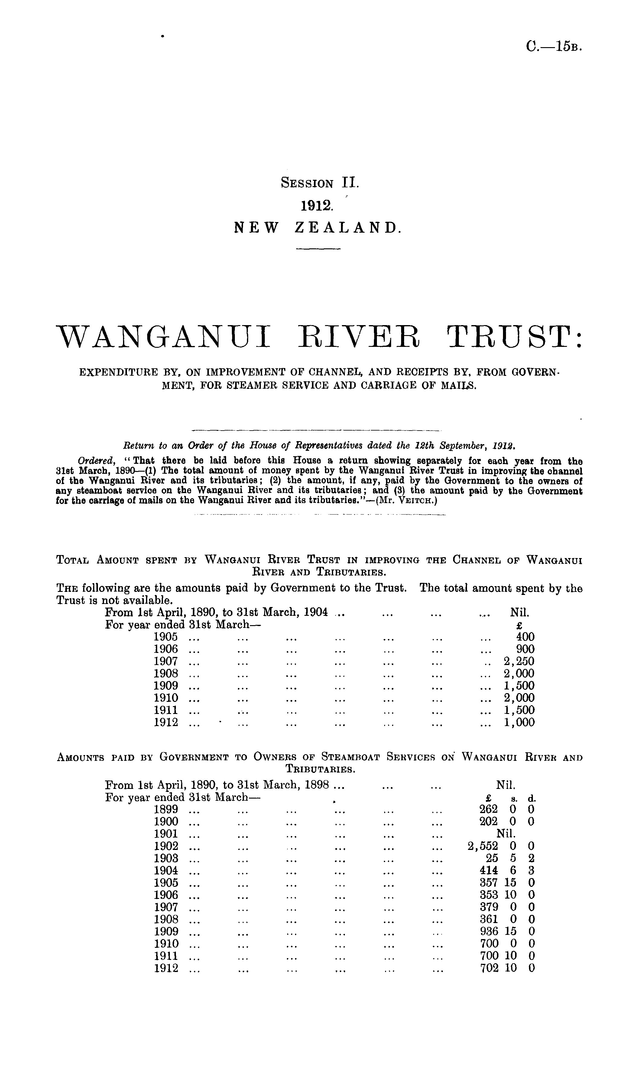 Return to an Order of the House of Representatives dated the 12th September, 1913. Ordered, " That there be laid before this House a return showing separately for eaoh year from the 31st March, 1890 —(1) The total amount of money spent by the Wanganui River Trust in improving the channel of the Wanganui River and its tributaries; (2) the amount, if any, paid by the Government to the owners of any steamboat service on the Wanganui River and its tributaries; and (3) the amount paid by the Government for the oarriage of mails on the Wanganui River and its tributaries."—(Mr. Veitch.)