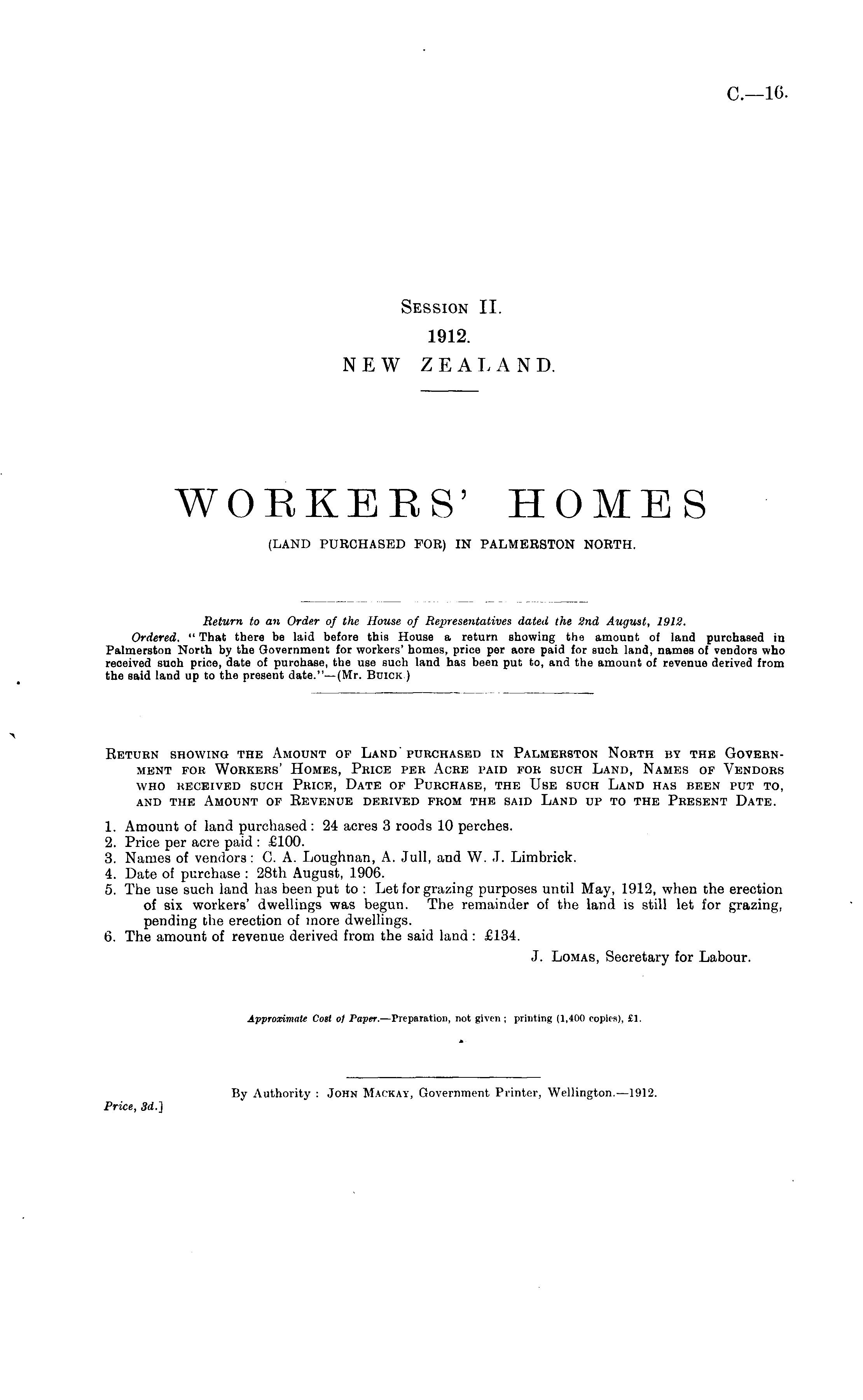 Betubn showing the Amount of Land'purchased in Palmekston North by the Government for Workers' Homes, Price per Acre paid for such Land, Names of Vendors who received such price, date of purchase, the use such land has been put to, and the Amount of Revenue derived from the said Land up to the Present Date. 1. Amount of land purchased : 24 acres 3 roods 10 perches. 2. Price per acre paid : £100. 3. Names of vendors: C. A. Loughnan, A. Jull, and W. J. Limbrick. 4. Date of purchase : 28th August, 1906. 5. The use such land has been put to : Let for grazing purposes until May, 1912, when the erection of six workers' dwellings was begun. The remainder of the land is still let for grazing, pending the erection of more dwellings. 6. The amount of revenue derived from the said land : £134. J. Lomas, Secretary for Labour.