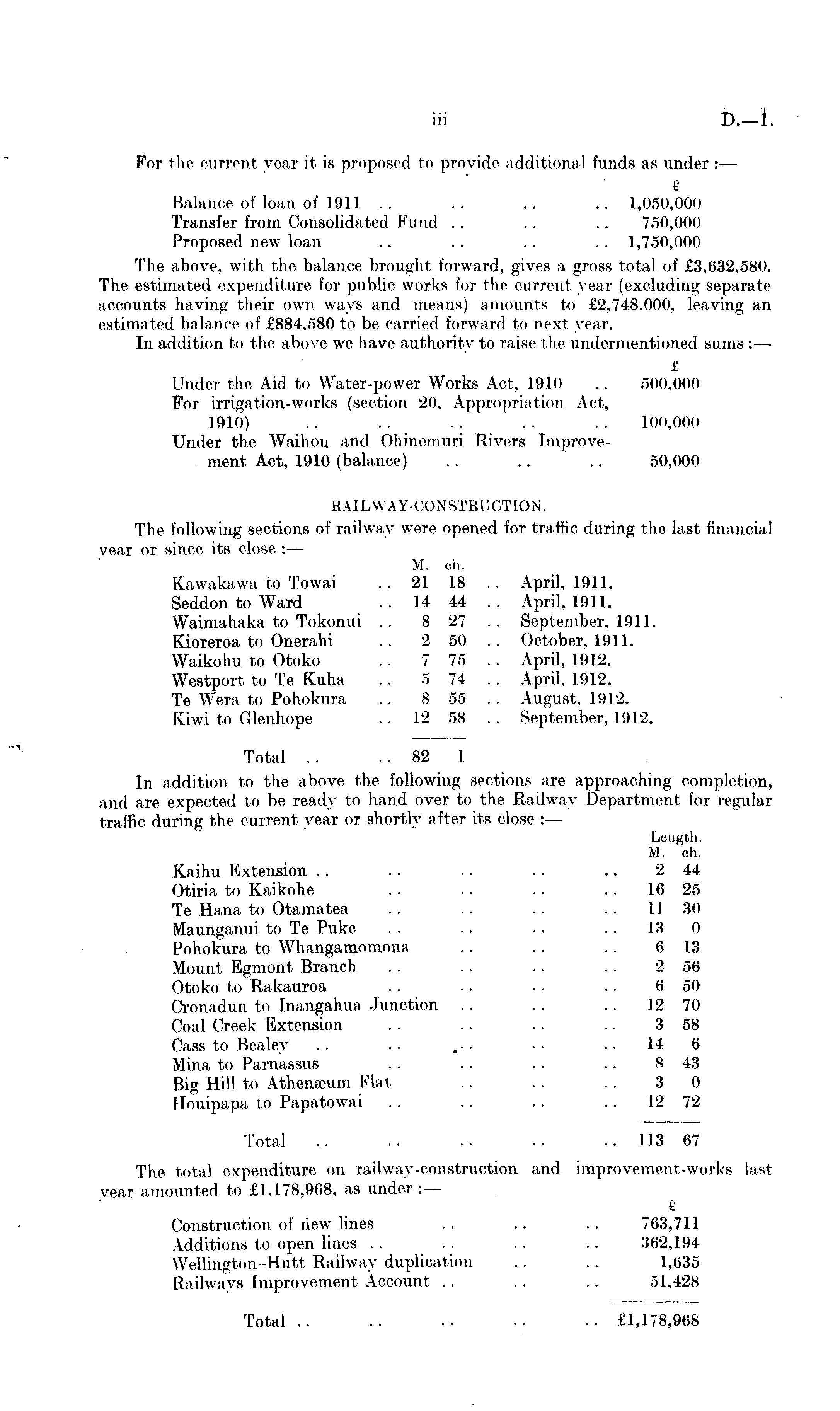 For the current year it is proposed to provide additional funds as under:— Balance of loan of 1911 .. .. .. .. 1,050,000 Transfer from Consolidated Fund .. . . .. 750,000 Proposed new loan . . . . . . . . 1,750,000 The above, with the balance brought forward, gives a gross total of £3.632.580. The estimated expenditure for public works for the. current year (excluding separate accounts having their own ways and means) amounts to £2,748.000, leaving an estimated balance of £884.580 to be carried forward to next year. In addition to the above we have authority to raise the undermentioned sums :— £ Under the Aid to Water-power Works Act, 1910 .. 500.000 For irrigation-works (section 20, Appropriation Act, 1910) .. .. .. .. .. 100,000 Under the Waihou and Ohinemuri Rivers Improvement Act, 1910 (balance) .. .. . . 50,000 RAILWAY-CONSTRUCTION. The following sections of railway were opened for traffic during the last financial year or since its close : — M. eh. Kawakawa to Towai .. 21 18 .. April, 1911. Seddon to Ward .. 14 44 .. April. 1911. Waimahaka to Tokonui .. 8 27 .. September. 1911. Kioreroa to Onerahi .. 2 50 .. October. 1911. Waikohu to Otoko . . 7 75 . . April, 1912. Westport to Te Kulia .. 5 74 . . April. 1912. Te Wera to Pohokura .. 8 55 . . August, 1912. Kiwi to Olenhope .. 12 58 .. September. 1912. Total .. .. 82 1 In addition, to the above the following sections are approaching completion, and are expected to be ready to hand over to the Railway Department for regular traffic during the current year or shortly after its close : — Length. M. eh. Kaihu Extension . . .. .. .. .. 2 44 Otiria to Kaikohe .. .. 16 25 Te Hana to Otamatea . . . . .. ..11 30 Maunganui to Te Puke .. .. .. .. 13 0 Pohokura to Whangamomona . . . . . . 6 13 Mount Egmont Branch . . . . . . 2 56 Otoko to Rakauroa . . . . . . .. 6 50 Cronadun to Inangahua Junction . . . . . . 12 70 Coal Creek Extension . . . . . . . . 3 58 Cass to Bealey .. .. ,•■ ■ - 14 6 Mina to Parnassus . . .. . . . . 8 43 Bio Hill to Athenaeum Flat .. .. .. 3d Honipa pa to Papatowai .. .. .. 12 72 Total .. .. .. .. .. 113 67 The total expenditure on railway-construction and improvement-works last year amounted to £1.178,968, as under :— £ Construction of hew lines . . . . . . 763,711 Additions to open lines .. .. .. .. 362,194 Wellington .-Hutt Railway duplication .. .. 1,035 Railways Improvement Account .. .. .. 51,428 Total .. .. .. .. .. £1,178,968