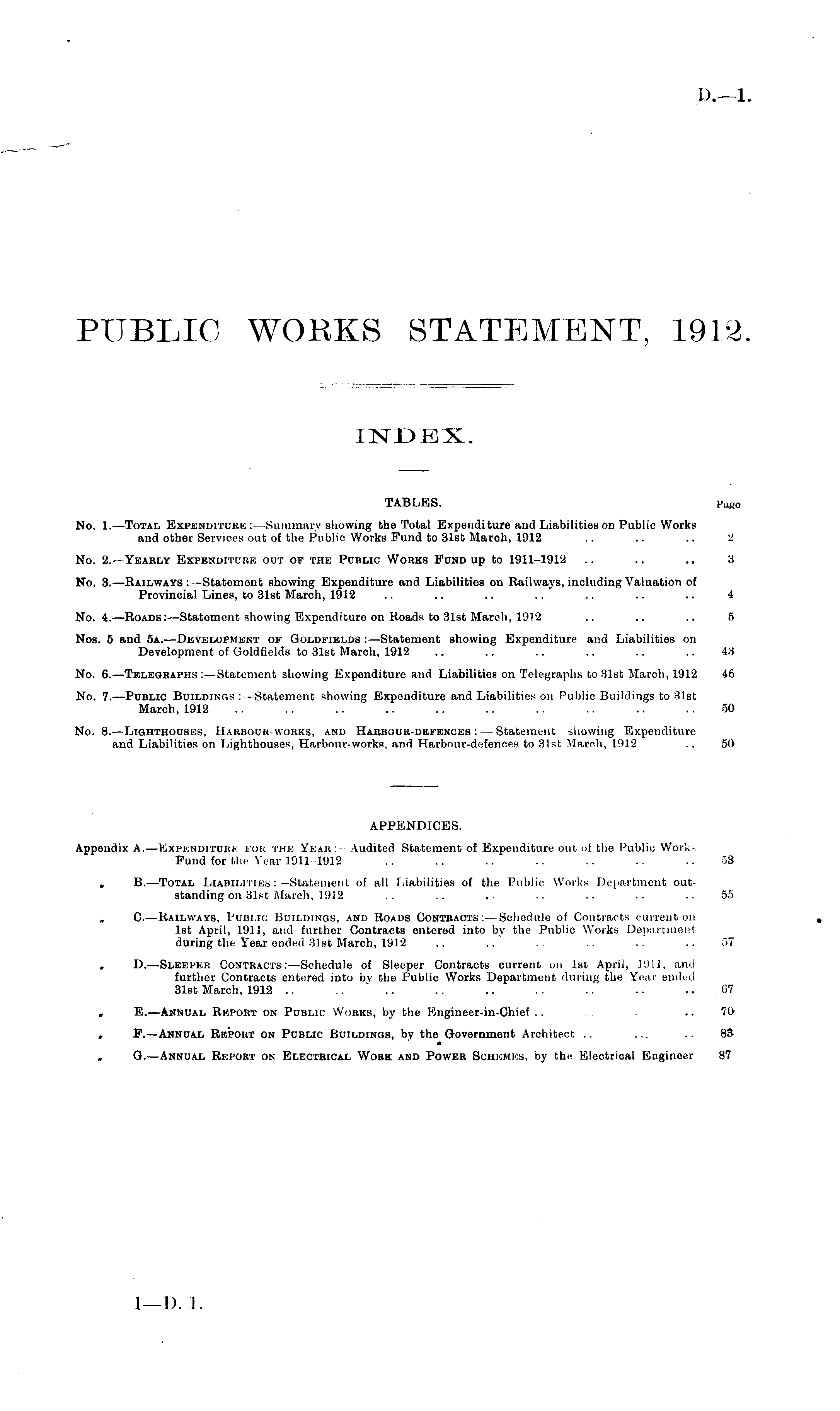 PUBLIC] WORKS STATEMENT, 1912. INDEX. TABLES. PttKe No. I.—Total Expenditure : — Summary showing the Total Expenditure and Liabilities on Public Works and other Services out of the Public Works Fund to 31st Maroh, 1912 .. .. .. 2 No. 2.—YEARLY ExPENDITUItE OUT OF THE PUBLIC WORKS FUND Up to 1911-1912 .. .. .. 3 No. 3. —Railways:—Statement Rhowing Expenditure and Liabilities on Railways, including Valuation of Provincial Lines, to 31st March, 1912 .. .. .. .. .. .. .. 4 No. 4.—Roads:—Statement showing Expenditure on Roads to 31at March, 1912 .. .. .. 5 Nos. 5 and sa.—Development op Goldfiklds :—Statement showing Expenditure and Liabilities on Development of Goldfields to 31st March, 1912 .. .. .. .. .. .. 43 No. 6. —Telegraphs:—Statement showing Expenditure and Liabilities on Telegraphs to 31st March, 1912 46 No. 7. —Public Buildtnok : -Statement showing Expenditure and Liabilities on Public Buildings to 31st March, 1912 .. .. .. .. .. .. .. .. .. .. 50 No. B.—Lighthouses, Harbour- works, and Habbouh-defences : — Statement allowing Expenditure and Liabilities on Lighthouses, Harbour-works, and Harbour-defences to 31st March, HII2 .. 50 APPENDTCES. Appendix A.— Kxpknditurk fok the Ykar: Audited Statement of Expenditure out of the Publio Works Fund for the Year 1911-1912 .. .. .. .. .. .. .. 58 , B.—Total Liabilities :—Statement of all Liabilities of the Public Works Department outstanding on 31st March. 1912 .. .. .. .. .. .. .. 55 C.—Railways, Public Buildings, and Roads Contbact.s: —Schedule of Contracts current on Ist April, 1911, and further Contracts entered into by the Public Works Department during the Year ended 31st March, 1912 .. .. .. .. .. .. 57 D.—Sleeper Contracts:—Schedule of Sleeper Contracts current on Ist April, 1911, further Contracts entered into by the Public Works Department during the Yenr ended 31st March, 1912 .. .. .. .. .. .. .. .. .. G7 , E.—Annual Rkport on Public Wobks, by the Engineer-in-Chief .. .. . .. 70 F.—Annual Report on Public Buildings, by the Government Architect .. ... .. 85 G.—Annual Rkcort on Electrical Wobk and Power Schemes, by the Electrical Engineer 87