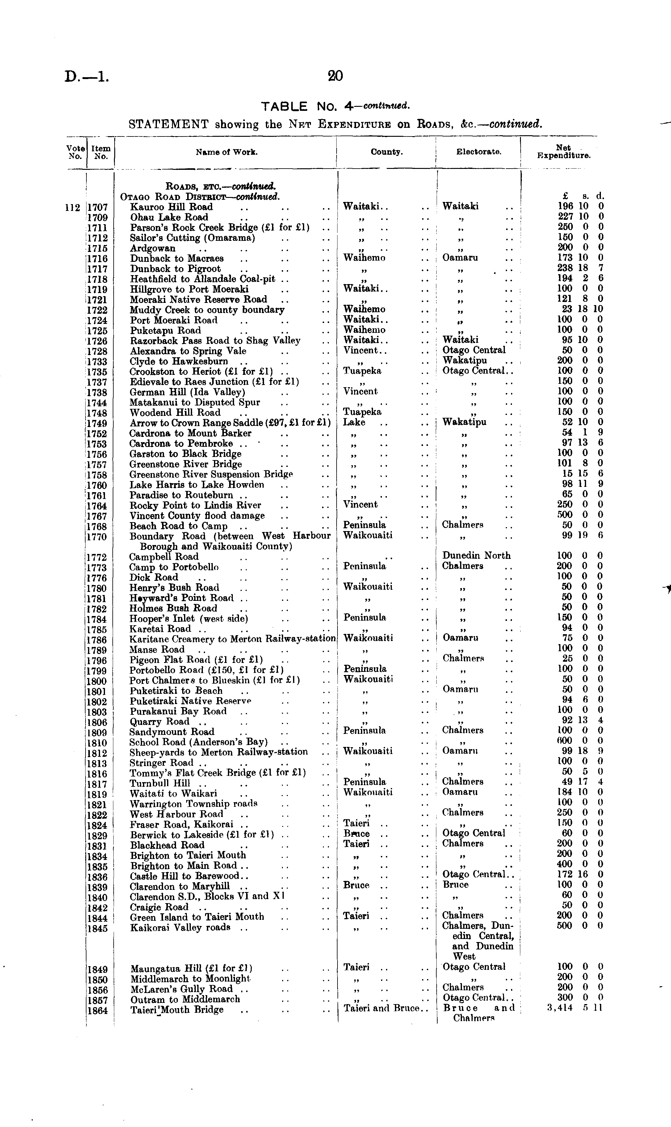 Vote No. Item No. Name of Work. County. Electorate. I Net Expenditure. 12 1707 1709 1711 1712 1715 1716 1717 1718 1719 1721 1722 1724 1725 1726 1728 1733 1735 1737 1738 1744 1748 1749 1752 1753 1756 1757 1758 1760 1761 1764 171)7 1768 1770 Roads, etc.— continued. Otaqo Road District — continued. Kauroo Hill Road Ohau Lake Road Parson's Rock Creek Bridge (£1 for £1) Sailor's Cutting (Omarama) Ardgowan .. .. .. Dunback to Macraes .. .. Dunback to Pigroot .. .. Heathfield to Allandale Coal-pit .. Hillgrove to Port Moeraki Moeraki Native Reserve Road Muddy Creek to county boundary Port Moeraki Road Puketapu Road .. .. Razorback Pass Road to Shag Valley Alexandra to Spring Vale Clyde to Hawkesburn Crookston to Heriot (£1 for £1) .. Edievale to Raes Junction (£1 for £1) German Hill (Ida Valley) Matakanui to Disputed Spur Woodend Hill Road Arrow to Crown Range Saddle (£97, £1 for £1) Cardrona to Mount Barker Cardrona to Pembroke .. • Garston to Black Bridge Greenstone River Bridge Greenstone River Suspension Bridge Lake Harris to Lake Howden Paradise to Routebum Rocky Point to Lindis River Vincent County flood damage Beach Road to Camp Boundary Road (between West Harbour Borough and Waikouaiti County) Campbell Road Camp to Portobello Dick Road Henry's Bush Road Heyward's Point Road Holmes Bush Road Hooper's Inlet (west side) Karetai Road .. Karitanc Creamery to Morton Railway-station Manse Road Pigeon Flat Road (£1 for £1) Portobello Road (£150. £1 for £1) Port Chalmers to Blueskin (£1 for £1) Puketiraki to Beach I'uketiraki Native Reserve Purakanui Bay Road .. .. Quarry Road .. .. .. Sandymount Road .. .. Sohool Road (Anderson's Bay) . . Sheep-yards to Merton Railway-station .. Stringer Road .. .. .. Tommy's Flat Creek Bridge (£1 for £1) .. Turnbiill Hill .. .. .. .. Waitati to Waikari .. .. Warrington Township roads .. West Harbour Road I iiser Road, Kaikorai .. Berwick to Lakeside (£1 for CI ) . . Blackhead Road Brighton to Taieri Mouth Brighton to Main Road Castle Hill to Barewood Clarendon to Maryhill . . . . Clarendon S.D., Blocks VI and XI Craigie Road Green Island to Taieri Mouth Kaikorai Valley roads Waitaki.. .. Waitaki ,, . ■ ... ,, M ■ ■ . . ,, Waiherao .. Oamaru »» • • >» • • Waitaki.. .. "„ >* • • »» Waihemo .. „ Waitaki.. .. „ Waihemo .. „ Waitaki.. .. Waitaki Vincent.. .. Otago Central „ .. .. Wakatipu Tuapeka .. Otago Central.. Vincent .. ' „ Tuapeka .. „ Lake .. .. Wakatipu ,, . . . . ,, ,, .. .. ,, Vincent .. i „ Peninsula .. i Chalmers Waikouaiti .. ! ,, £ a. d. 196 10 0 227 10 0 250 0 0 150 0 0 200 0 0 173 10 0 238 18 7 194 2 6 100 0 0 121 8 0 23 18 10 100 0 0 100 0 0 95 10 0 50 0 0 200 0 0 100 0 0 150 0 0 100 0 0 100 0 0 150 0 0 52 10 0 54 1 9 97 13 6 100 0 0 101 8 0 15 15 6 98 11 9 65 0 0 250 0 0 500 0 0 50 0 0 99 19 6 1772 1773 1776 1780 1781 1782 1784 1785 1786 17811 1796 1799 1800 1801 1802 1803 1806 1809 1810 1812 1813 1816 ISSI7 1819 1821 1822 1824 1829 1831 1834 1835 1836 1839 1840 1842 1844 1845 Dunedin North Peninsula .. j Chalmers Waikouaiti .. „ Peninsula .. j ,, Waikouaiti .. Oamaru „ • • .. ,, .. Chalmers Peninsula . . ,, Waikouaiti .. ,, „ .. Oamaru Peninsula .. Chalmers Waikouaiti .. Oamarn Peninsula .. Chalmers Waikouaiti .. Oamaru „ .. Chalmers Taieri .. .. „ Bruce .. .. Otago Central Taieri .. . . Chalmers „ .. „ .. „ .. .. Otago Central.. Bruce .. . . Bruce Taieri .. .. Chalmers „ .. .. Chalmers, Dunedin Central, and Dunedin West Taieri .. .. Otago Central ,, .. .. Chalmers „ .. .. Otago Central.. Taieri and Bruce.. Bruce and I Chalmers 100 0 0 200 0 0 100 0 0 50 0 0 50 0 0 50 0 0 150 0 0 94 0 0 75 0 0 100 0 0 25 0 0 100 0 0 50 0 0 50 0 0 94 6 0 100 0 0 92 13 4 100 0 0 (SOO 0 0 99 18 9 100 0 0 50 5 0 49 17 4 184 10 0 100 0 0 250 0 0 160 0 0 60 0 0 200 0 0 200 0 0 400 0 0 172 16 0 100 0 0 60 0 0 50 0 0 200 0 0 500 0 0 100 0 0 200 0 0 200 0 0 300 0 0 :i.4l4 6 11 1849 1850 1856 1857 1864 Maungatua Hill (£1 for £1) Middlemarch to Moonlight McLaren's Gully Road Outram to Middlemareh TaierTMouth Bridge