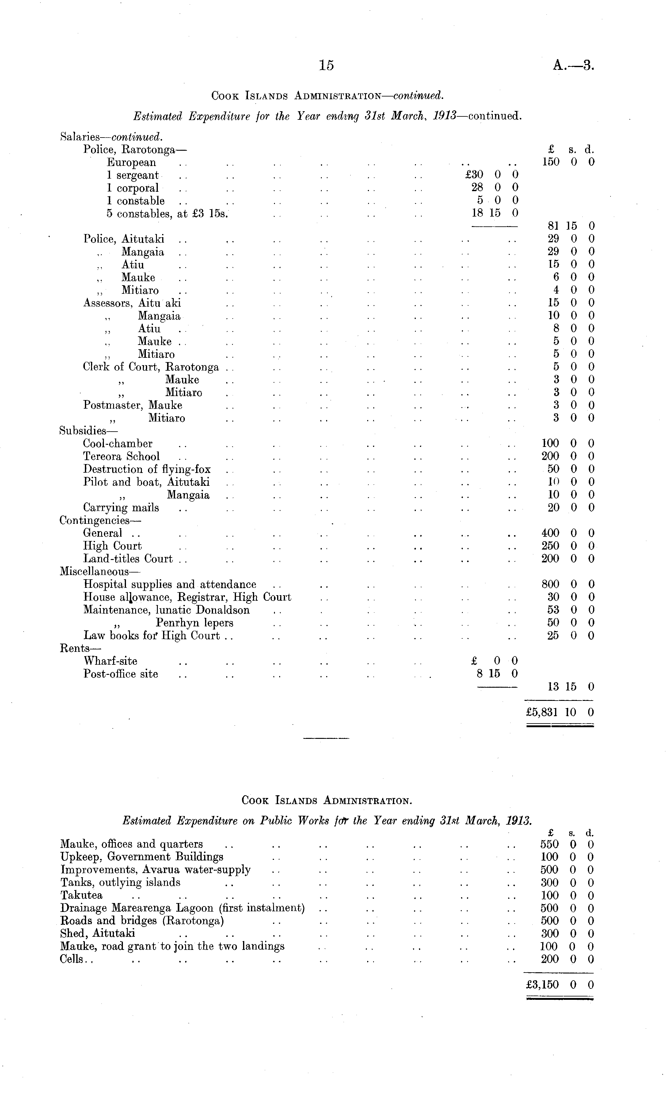 Cook Islands Administration. Estimated Expenditure on Public Works for the Year ending 31st March, 1913. £ s. d. Mauke, offices and quarters .. .. .. .. .. . . .. 550 0 0 Upkeep, Government Buildings .. .. . . .. . . . . 100 0 0 Improvements, Avarua water-supply . . . . . . . . . . . . 500 0 0 Tanks, outlying islands . . . . . . . . . . . . .. 300 0 0 Takutea . . . . .. . . .. . . . . .. . . 100 0 0 Drainage Marearenga Lagoon (first instalment) .. . . . . . . .. 500 0 0 Roads and bridges (Rarotonga) . . .. . . . . . . . . 500 0 0 Shed, Aitutaki .. .. .. .. .. .. .. .. 300 0 0 Mauke, road grant to join the two landings . . . . . . .. . . 100 0 0 Cells.. .. .. .. .. .. .. ... .. .. 200 0 0 £3,150 0 0