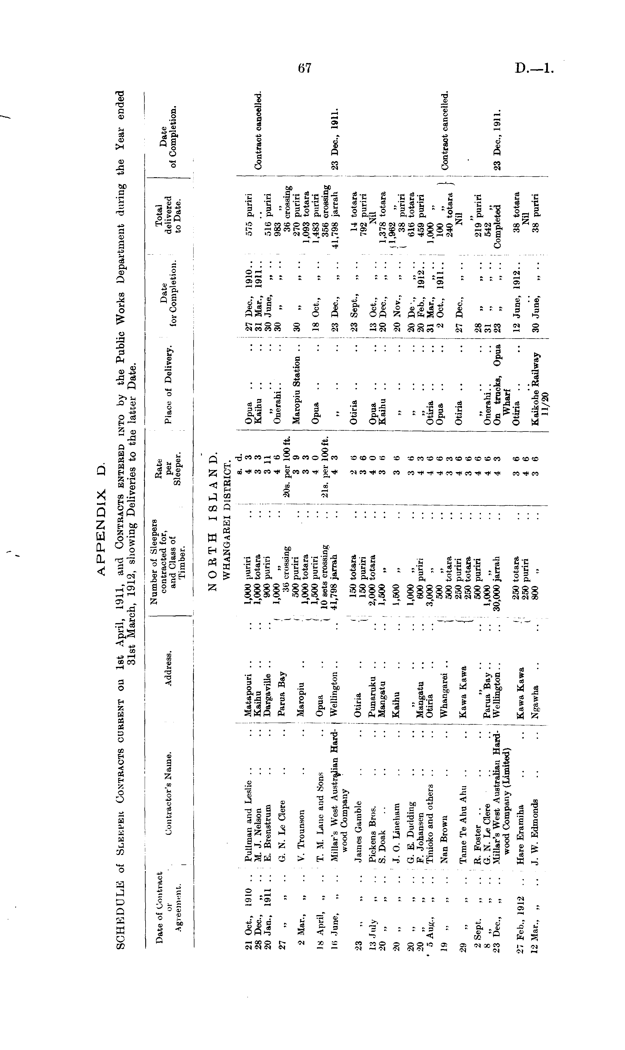 APPENDIX D. SCHEDULE of Sleeper Contracts current on 1st April, 1911, and Contracts entered into by the Public Works Department during the Year ended 31st March, 1912, showing Deliveries to the latter Date.