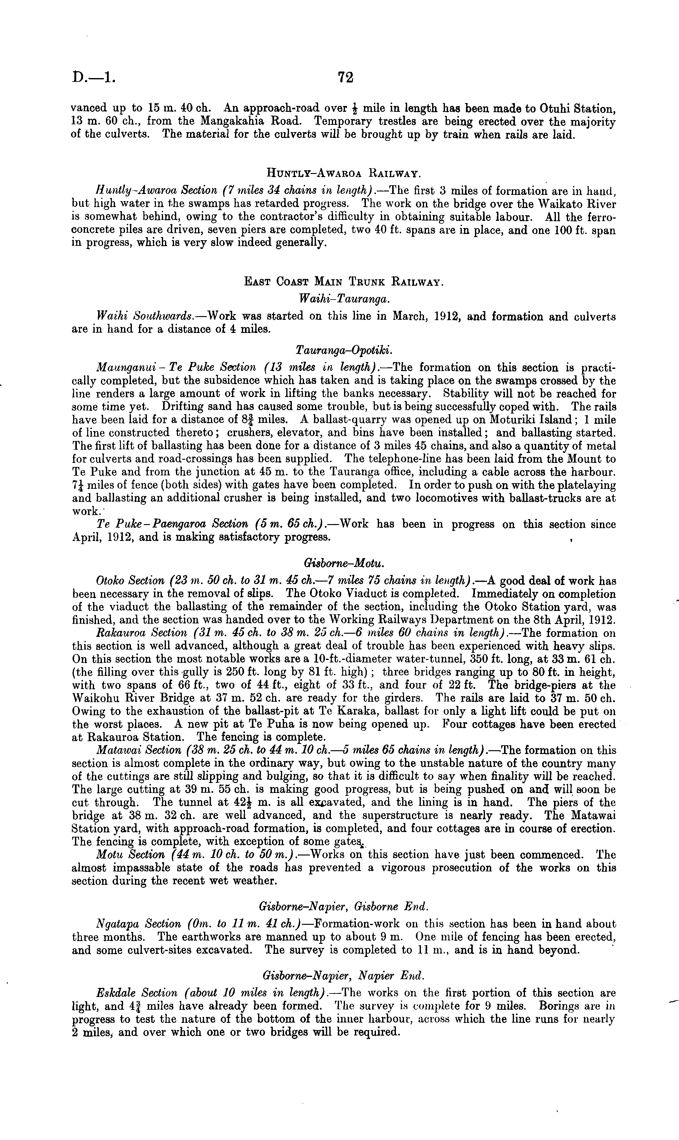 vanced up to 15 m. 40 eh. An approach-road over \ mile in length has been made to Otuhi Station, 13 m. 60 eh., from the Mangakahia Road. Temporary trestles are being erected over the majority of the culverts. The material for the culverts will be brought up by train when rails are laid. Huntly-Awaroa Railway. Huntly-Awaroa Section (7 miles 34 chains in length). —The first 3 miles of formation are in hand, but high water in the swamps has retarded progress. The work on the bridge over the Waikato River is somewhat behind, owing to the contractor's difficulty in obtaining suitable labour. All the ferroconcrete piles are driven, seven piers are completed, two 40 ft. spans are in place, and one 100 ft. span in progress, which is very slow indeed generally. East Coast Main Trunk Railway. Waihi-Tauranga. Waihi Southwards. —Work was started on this line in March, 1912, and formation and culverts are in hand for a distance of 4 miles. Taura nga-Opot iki. Maunganui - Te Puke Section (13 miles in length). —The formation on this section is practically completed, but the subsidence which has taken and is taking place on the swamps crossed by the line renders a large amount of work in lifting the banks necessary. Stability will not be reached for some time yet. Drifting sand has caused some trouble, but is being successfully coped with. The rails have been laid for a distance of 8f miles. A ballast-quarry was opened up on Moturiki Island; 1 mile of line constructed thereto; crushers, elevator, and bins have been installed; and ballasting started. The first lift of ballasting has been done for a distance of 3 miles 45 chains, and also a quantity of metal for culverts and road-crossings has been supplied. The telephone-line has been laid from the Mount to Te Puke and from the junction at 45 m. to the Tauranga office, including a cable across the harbour. 7J miles of fence (both sides) with gates have been completed. In order to push on with the platelaying and ballasting an additional crusher is being installed, and two locomotives with ballast-trucks are at work. Te Puke-Paengaroa Section (5 m. 65 eh.). —Work has been in progress on this section since April, 1912, and is making satisfactory progress. . Gisborne-Motu. Otoko Section (23 m. 50 eh. to 31 m. 45 eh.—7 miles 75 chains in length). — A good deal of work has been necessary in the removal of slips. The Otoko Viaduct is completed. Immediately on completion of the viaduct the ballasting of the remainder of the section, including the Otoko Station yard, was finished, and the section was handed over to the Working Railways Department on the Bth April, 1912. Rakauroa Section (31 ra. 45 eh. to 38 m. 25 eh. — 6 miles 60 chains in length). —The formation on this section is well advanced, although a great deal of trouble has been experienced with heavy slips. On this section the most notable works are a 10-ft.-diameter water-tunnel, 350 ft. long, at 33 m. 61 eh. (the filling over this gully is 250 ft. long by 81 ft. high) ; three bridges ranging up to 80 ft. in height, with two spans of 66 ft., two of 44 ft., eight of 33 ft., and four of 22 ft. The bridge-piers at the Waikohu River Bridge at 37 m. 52 eh. are ready for the girders. The rails are laid to 37 m. 50 eh. Owing to the exhaustion of the ballast-pit at Te Karaka, ballast for only a light lift could be put on the worst places. A new pit at Te Puna is now being opened up. Four cottages have been erected at Rakauroa Station. The fencing is complete. Matawai Section (38 m. 25 eh. to 44 ra. 10 ch. — s miles 65 chains in length). —The formation on this section is almost complete in the ordinary way, but owing to the unstable nature of the country many of the cuttings are still slipping and bulging, so that it is difficult to say when finality will be reached. The large cutting at 39 m. 55 eh. is making good progress, but is being pushed on and will soon be cut through. The tunnel at 42J m. is all excavated, and the lining is in hand. The piers of the bridge at 38 m. 32 eh. are well advanced, and the superstructure is nearly ready. The Matawai Station yard, with approach-road formation, is completed, and four cottages are in course of erection. The fencing is complete, with exception of some gates. Motu Section (44 m. 10 eh. to 50 m.). —Works on this section have just been commenced. The almost impassable state of the roads has prevented a vigorous prosecution of the works on this section during the recent wet weather. Gisborne-Napier, Gisborne End. Ngatapa Section (om. to 11 m. 41 eh.) —Formation-work on this section has been in hand about three months. The earthworks are manned up to about 9m. One mile of fencing has been erected, and some culvert-sites excavated. The survey is completed to 11 m., and is in hand beyond. Gisborne-Napier, Napier End. Eskdale Section (about 10 miles in length). —The works on the first portion of this section are light, and 4| miles have already been formed. The survey is complete for 9 miles. Borings are in progress to test the nature of the bottom of the inner harbour, across which the line runs for nearly 2 miles, and over which one or two bridges will be required.