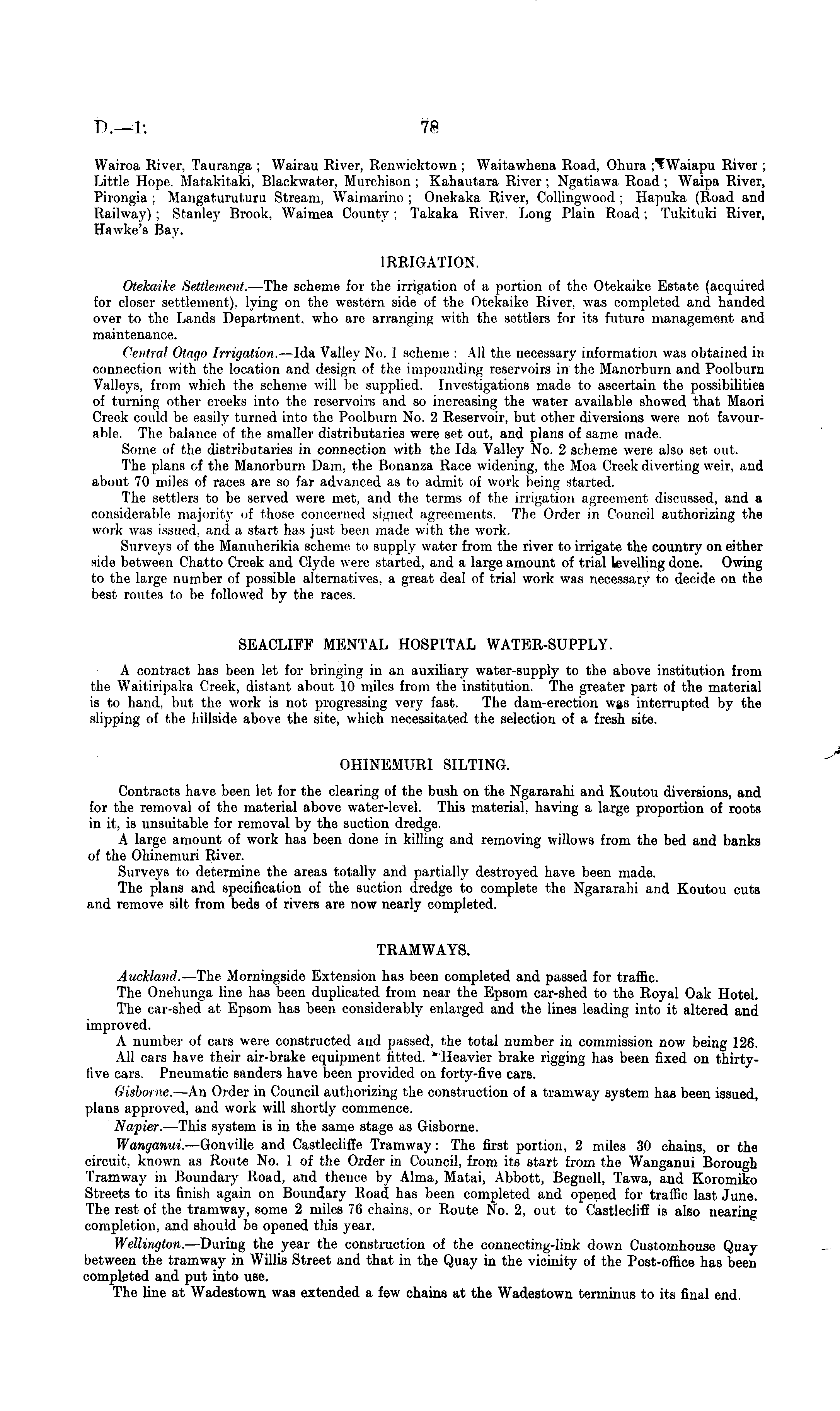 Wairoa River. Tauranga ; Wairau River, Renwicktown ; Waitawhena Road, Ohura ;TWaiapu River ; Little Hope. Matakitaki, Blackwater. Murchison; Kahautara River; Ngatiawa Road; Waipa River, Pirongia: Mangaturuturu Stream, Waimarino; Onekaka River, Collingwood; Hapuka (Road and Railway) ; Stanley Brook, Waimea County; Takaka River. Long Plain Road; Tukituki River, Hawke's Bay. IRRIGATION. Otekaike Settlement. —The scheme for the irrigation of a portion of the Otekaike Estate (acquired for closer settlement), lying on the western side of the Otekaike River, was completed and handed over to the Lands Department, who arc arranging with the settlers for its future management and maintenance. Central Otago Irrigation. —lda Valley No. 1 scheme : All the necessary information was obtained in connection with the location and design of the impounding reservoirs in the Manorburn and Poolburn Valleys, from which the scheme will be supplied. Investigations made to ascertain the possibilities of turning other creeks into the reservoirs and so increasing the water available showed that Maori Creek could bo easily turned into the Poolburn No. 2 Reservoir, but other diversions were not favourable. The balance of the smaller distributaries were sit out. and plans of same made. Some of the distributaries in connection with the Ida Valley No. 2 scheme were also set out. The plans of the Manorburn Dam. the Bonanza Race widening, the Moa Creek diverting weir, and about 70 miles of races are so far advanced as to admit of work being started. The settlers to be served were met, and the terms of the irrigation agreement discussed, and a considerable majority of those concerned signed agreements. The Order in Council authorizing the work was issued, and a start has just been made with the work. Surveys of the Manuherikia scheme to supply water from the river to irrigate the country on either side between Chatto Creek and Clyde were started, and a large amount of trial levelling done. Owing to the large number of possible alternatives, a great deal of trial work was necessary to decide on the best routes to be followed by the races. SEACLIFF MENTAL HOSPITAL WATER-SUPPLY. A contract has been let for bringing in an auxiliary water-supply to the above institution from the W'aitiripaka Creek, distant about 10 miles from the institution. The greater part of the material is to hand, but the work is not progressing very fast. The dam-erection was interrupted by the slipping of the hillside above the site, which necessitated the selection of a fresh site. OHINEMURI SILTING. Contracts have been let for the clearing of the bush on the Ngararahi and Koutou diversions, and for the removal of the material above water-level. This material, having a large proportion of roots in it, is unsuitable for removal by the suction dredge. A large amount of work has been done in killing and removing willows from the bed and banks of the Ohinemuri River. Surveys to determine the areas totally and partially destroyed have been made. The plans and specification of the suction dredge to complete the Ngararahi and Koutou cuts and remove silt from beds of rivers are now nearly completed. TRAMWAYS. Auckland. —The Morningside Extension has been completed and passed for traffic. The Onehunga line has been duplicated from near the Epsom car-shed to the Royal Oak Hotel. The car-shed at Epsom has been considerably enlarged and the lines leading into it altered and improved. A number of cars were constructed and passed, the total number in commission now being 126. All cars have their air-brake equipment fitted. ' Heavier brake rigging has been fixed on thirtyfive cars. Pneumatic sanders have been provided on forty-five cars. Gisborne.—An Order in Council authorizing the construction of a tramway system has been issued, plans approved, and work will shortly commence. Napier. —This system is in the same stage as Gisborne. Wanganui. —Gonville and Castlecliffe Tramway: The first portion, 2 miles 30 chains, or the circuit, known as Route No. 1 of the Order in Council, from its start from the Wanganui Borough Tramway in Boundary Road, and thence by Alma, Matai, Abbott, Begnell, Tawa, and Koromiko Streets to its finish again on Boundary Road has been completed and opened for traffic last June. The rest of the tramway, some 2 miles 76 chains, or Route No. 2, out to Castlecliff is also nearing completion, and should be opened this year. Wellington, —During the year the construction of the connecting-link down Customhouse Quay between the tramway in Willis Street and that in the Quay in the vicinity of the Post-office has been completed and put into use. The line at Wadestown was extended a few chains at the Wadestown terminus to its final end.