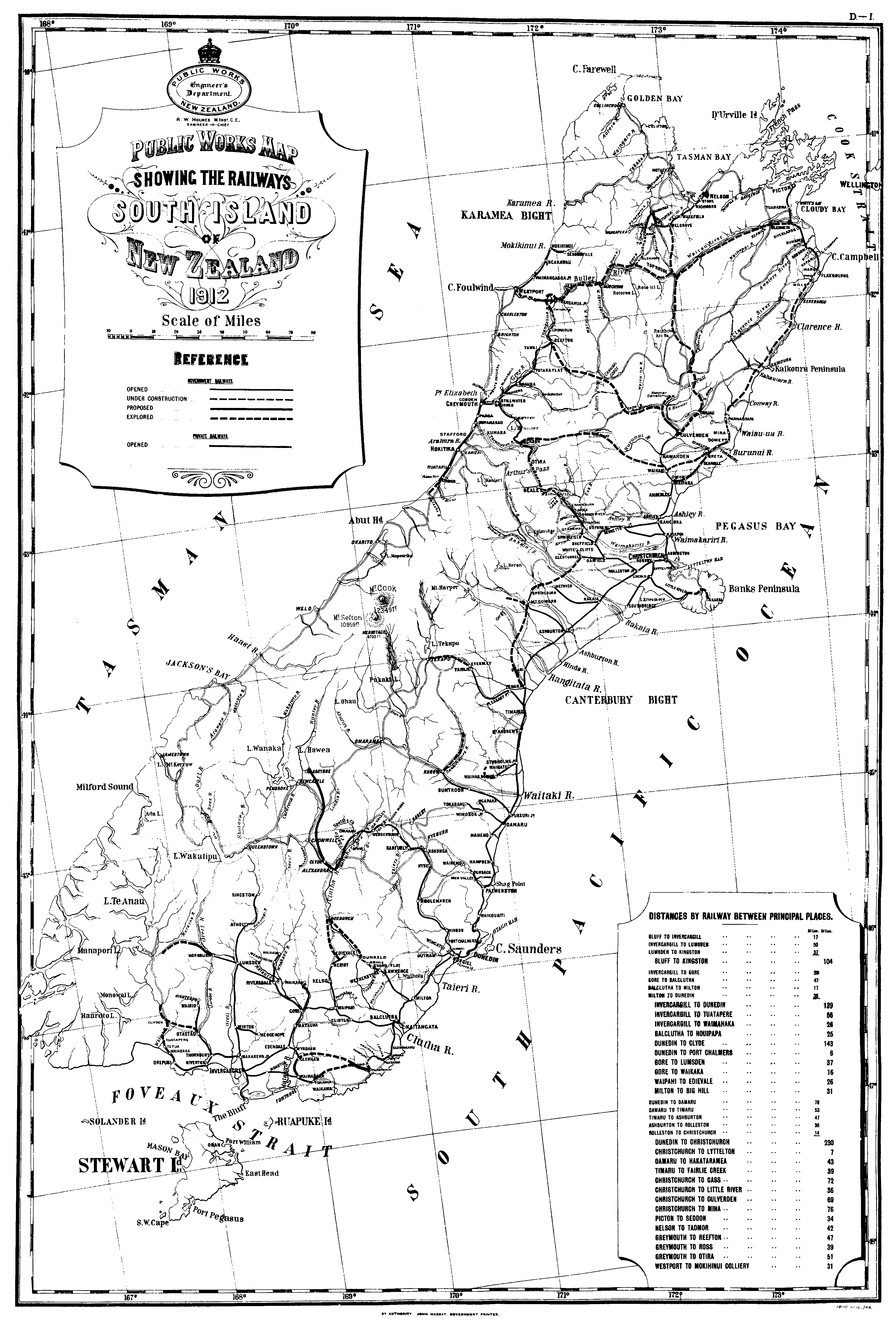 Public Works Map SHOWING THE RAILWAYS SOUTH ISLAND OF New Zealand 1912