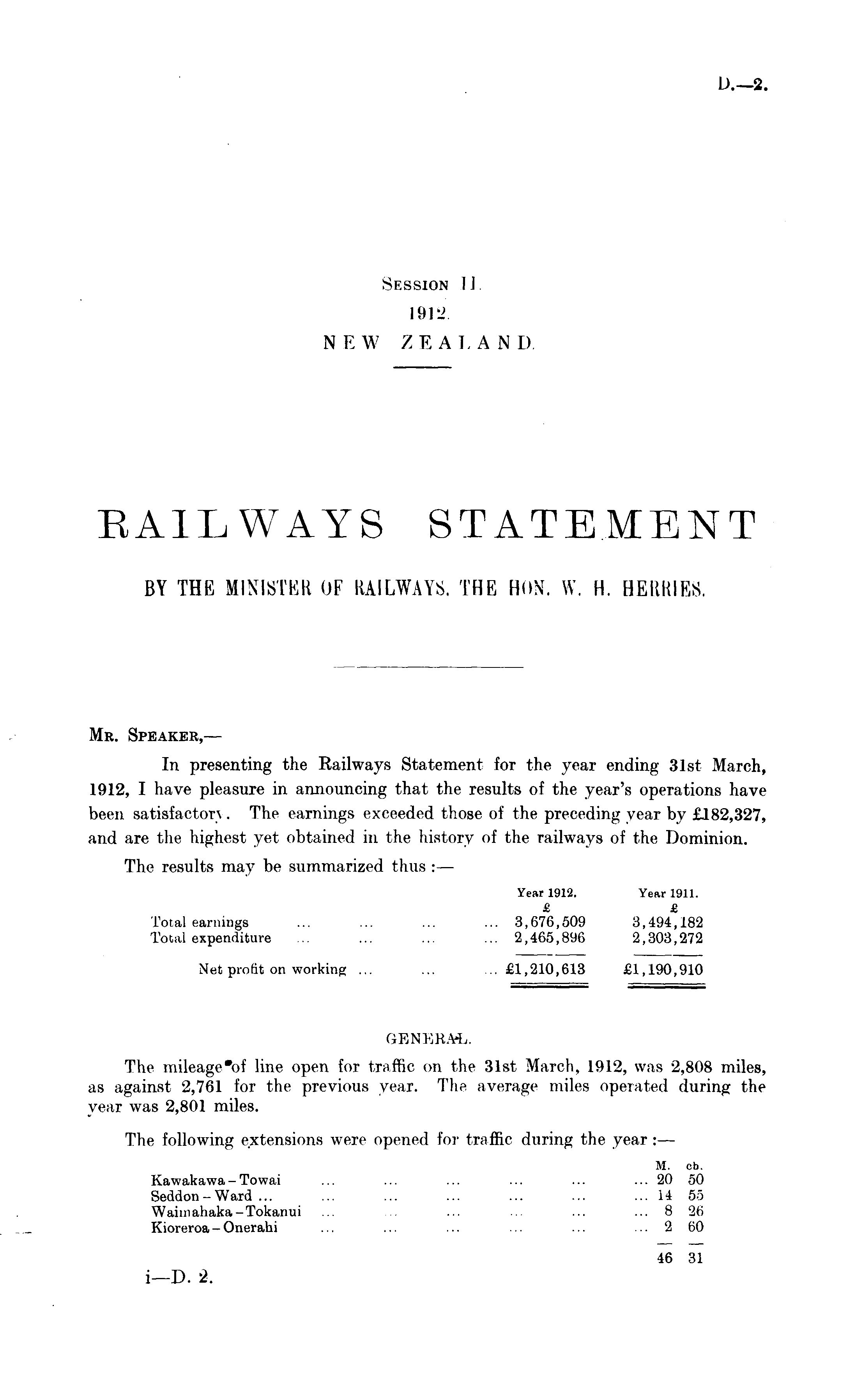 Mr. Speaker,— In presenting the Railways Statement for the year ending 31st March, 1912, I have pleasure in announcing that the results of the year's operations have been satisfactory. The earnings exceeded those of the preceding year by £182,327, and are the highest yet obtained in the history of the railways of the Dominion. The results may be summarized thus :— Year 1912. Year 1911. £ £ Total earnings ... ... ... ... 3,676,509 3,494,182 Total expenditure ... ... ... ... 2,465,896 2,303,272 Net profit on working ... ... ..£1,210,613 £1,190,910 GENKR.VL. The mileage - of line open for traffic on the 31st March, 1912, was 2,808 miles, as against 2,761 for the previous year. The average miles ope. a ted during the year was 2,801 miles. The following extensions were opened for traffic during the year :— M. cb. Kawakawa - Towai ... ... ... ... ... ... 20 50 Seddon - Ward ... ... ... ... ... ... ... 14 55 Waimahaka-Tokanui ... ... ... ... ... ... 8 26 Kioreroa - Onerahi ... ... ... ... ... ... 2 60 46 31