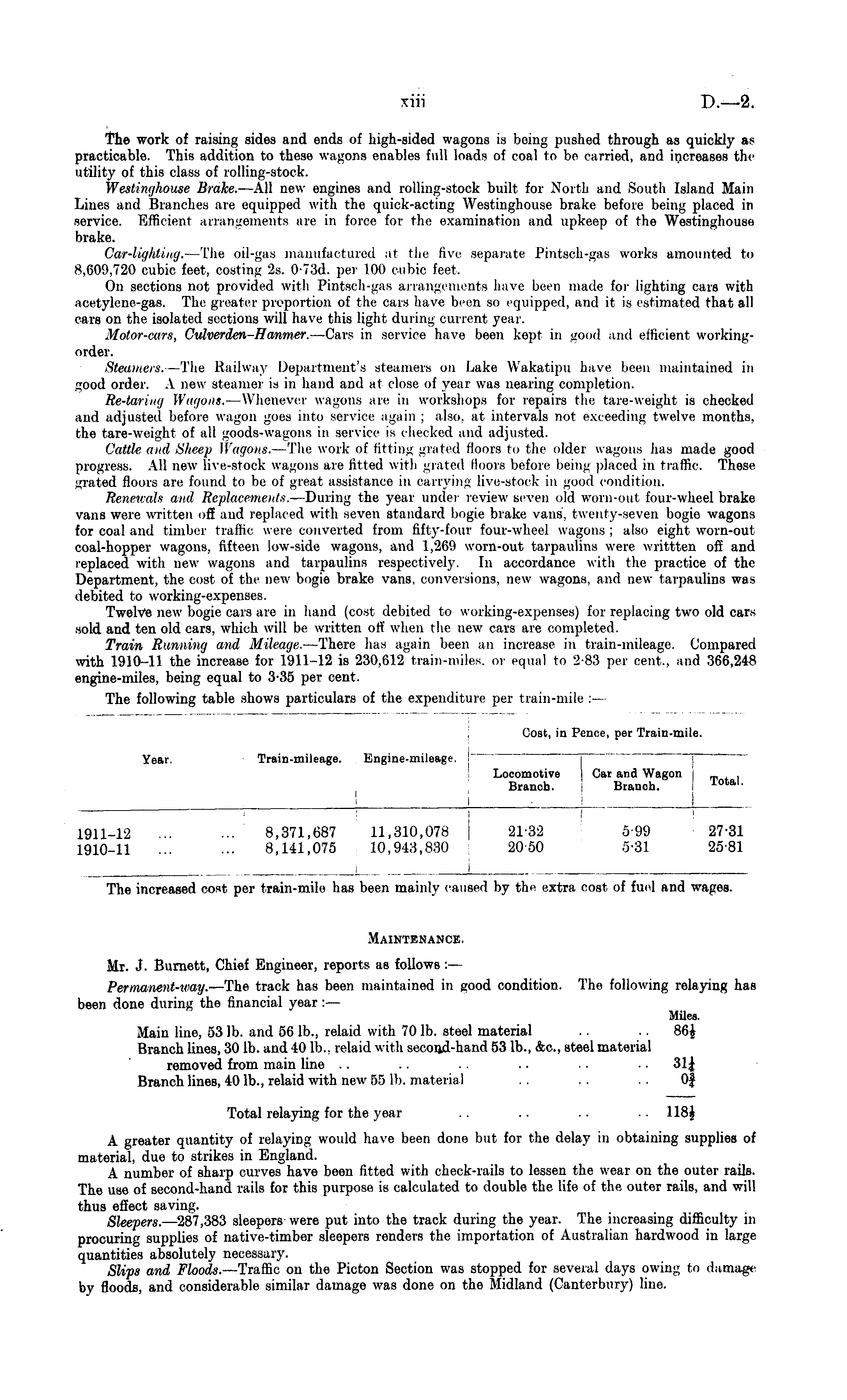 The work of raising sides and ends of high-sided wagons is being pushed through as quickly as practicable. This addition to these wagons enables full loads of coal to be carried, and increases the utility of this class of rolling-stock. Westinghouse Brake. —All new engines and rolling-stock built for North and South Island Main Lines and Branches are equipped with the quick-acting Westinghouse brake before being placed in service. Efficient arrangements are in force for the examination and upkeep of the Westinghouse brake. Car-lighting. —The oil-gas manufactured at the five separate Pintsch-gas works amounted to 8,609,720 cubic feet, costing 2s. 0-73 d. per 100 cubic feet, On sections not provided with Pintsch-gas arrangements have been made for lighting cars with acetylene-gas. The greater proportion of the cars have been so equipped, and it is estimated that all curs on the isolated sections will have this light during current year. Motor-cars, Gulverden-Hanmer. —Cars in service have been kept in good and efficient workingorder. Steamers. The Railway Department's steamers on Lake Wakatipu have been maintained in good order. A new steamer is in hand and al close of year was Hearing completion. Re-taring Wagons. Whenever wagons are in workshops for repairs the tare-weight is checked and adjusted before wagon goes into service again ; also, at intervals not exceeding twelve months, the tare-weight of all goods-wagons in service is checked and adjusted. Cattle anil Sheep Wagons.- The work of fitting grated floors to the older wagons has made good progress. All new live-stock wagons arc lifted with grated floors before being placed in traffic. These grated floors are found to be of great assistance iii carrying live-stock in good condition. Renewals and Replacements. —During the year under review seven old worn-out four-wheel brake vans were written off and replaced with seven standard bogie brake vans, twenty-seven bogie wagons for coal and timber traffic were converted from fifty-lour four-wheel wagons ; also eight worn-out coal-hopper wagons, fifteen low-side wagons, and 1,269 worn-out tarpaulins were writtten off and replaced with new wagons and tarpaulins respectively. In accordance with the practice of the Department, the cost of the new bogie brake vans, conversions, new wagons, and new tarpaulins was debited to working-expenses. Twelve new bogie cars are in hand (cost debited to working-expenses) for replacing two old cars sold and ten old cars, which will be written off when the new cars are completed. Train Running and Mileage. —There has again been an increase in train-mileage. Compared with 1910-11 the increase for 1911-12 is 230,612 train-miles, or equal to 2-83 per cent,, and 366,248 engine-miles, being equal to 3-35 per cent. The following table shows particulars of the expenditure per train-mile : —