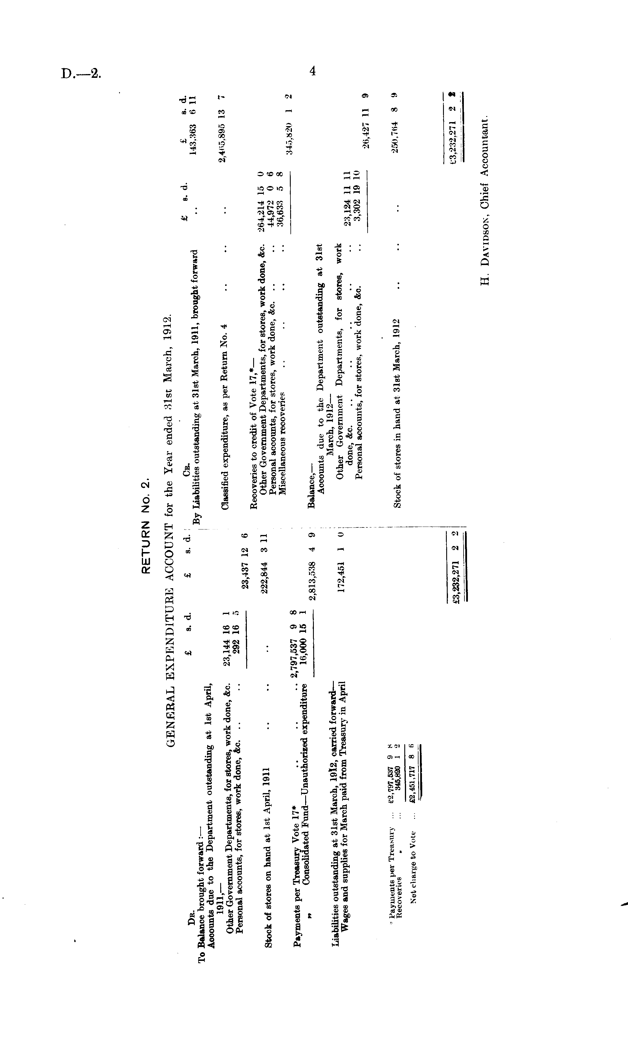 RETURN No. 2. GENERAL EXPENDITURE ACCOUNT for the Year ended 31st March, 1912. $ (\ £ s d ' Cr £ s. d. £ s. d. To Balancfbrought forward:- ' B y Liabilities 'outstanding at 31st March, 1911, brought forward .. 143.363 6 11 Accounts due to the Department outstanding at Ist April, Other 9 Gov7rnment Departments, for stores, work done, &c. 23,144 16 1 Classified expenditure, as per Return No. 4 2,4H5.895 13 Personal accounts, for stores, work done, &c. .. .. 292 16 o _~_,„. 23,437 12 o Recoveries to credit of Vote 17,*— a. ... „ , , tt+ ,„ + A„ r ii iqii 222,844 311 Other Government Departments, for stores, work done, &c. 264,21415 0 Stock of stores on hand at Ist April, 1911 . Personal accounts, for stores, work done, &c 44,972 0 6 Miscellaneous recoveries .. .. .. • • 36,633 5 8 ,-v. a -n- mt a a 345,820 1 2 Payments per Treasury Vote 17* .. •• ..2,i9i,537 9 8 Consolidated Fund—Unauthorized expenditure 16,000 15 1 " 2,813,538 4 9 Balance,— Accounts due to the Department outstanding at 31st "l^^dl^t^r^ I^?^ "2,451 1 0 Bepartments, for stores, work v v Personal accounts, for stores, work done, &c. .. 3,302 19 10 26,427 11 9 Reveries 1 ' 61 ' Ti r MU ' ." Si i £ Stock of stores in hand at 31st March, 1912 250,764 8 9 Net charge to Vote ... £2,451,717 8 6 £3,232,271 2 2 63,232,271 2 I H. Davidson, Chief Accountant.