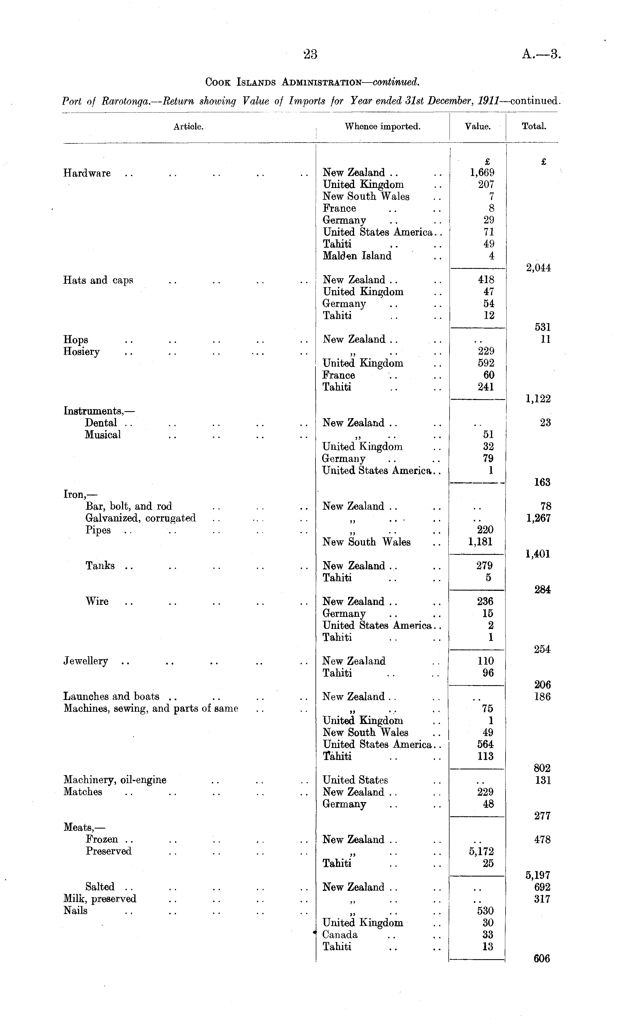 Article. Whence imported. Value. Total. Hardware New Zealand United Kingdom New South Wales France Germany United States America.. Tahiti Maiden Island £ 1,669 207 7 8 29 71 49 4 £ Hats and caps 2,044 New Zealand United Kingdom Germany Tahiti 418 47 54 12 Hops Hosiery New Zealand .. 531 11 )> • • • * United Kingdom France Tahiti 229 592 60 241 Instruments, — Dental Musical 1,122 New Zealand .. 23 ,, United Kingdom Germany United States America.. 51 32 79 1 163 Iron, — Bar, bolt, and rod Galvanized, corrugated Pipes New Zealand .. 78 1,267 ,, ... New South Wales 220 1,181 Tanks .. New Zealand Tahiti 1,401 279 5 Wire New Zealand Germany United States America.. Tahiti 236 15 2 1 284 Jewellery 254 New Zealand Tahiti 110 96 Launches and boats Machines, sewing, and parts of same New Zealand .. 75 1 49 564 113 206 186 United Kingdom New South Wales United States America.. Tahiti 802 131 Machinery, oil-engine Matches United States New Zealand Germany 229 48 MeatsFrozen Preserved 277 New Zealand 5,172 25 478 Tahiti" 5,197 692 317 Salted .. Milk, preserved Nails New Zealand .. ,, United Kingdom Canada Tahiti 530 30 33 13 606