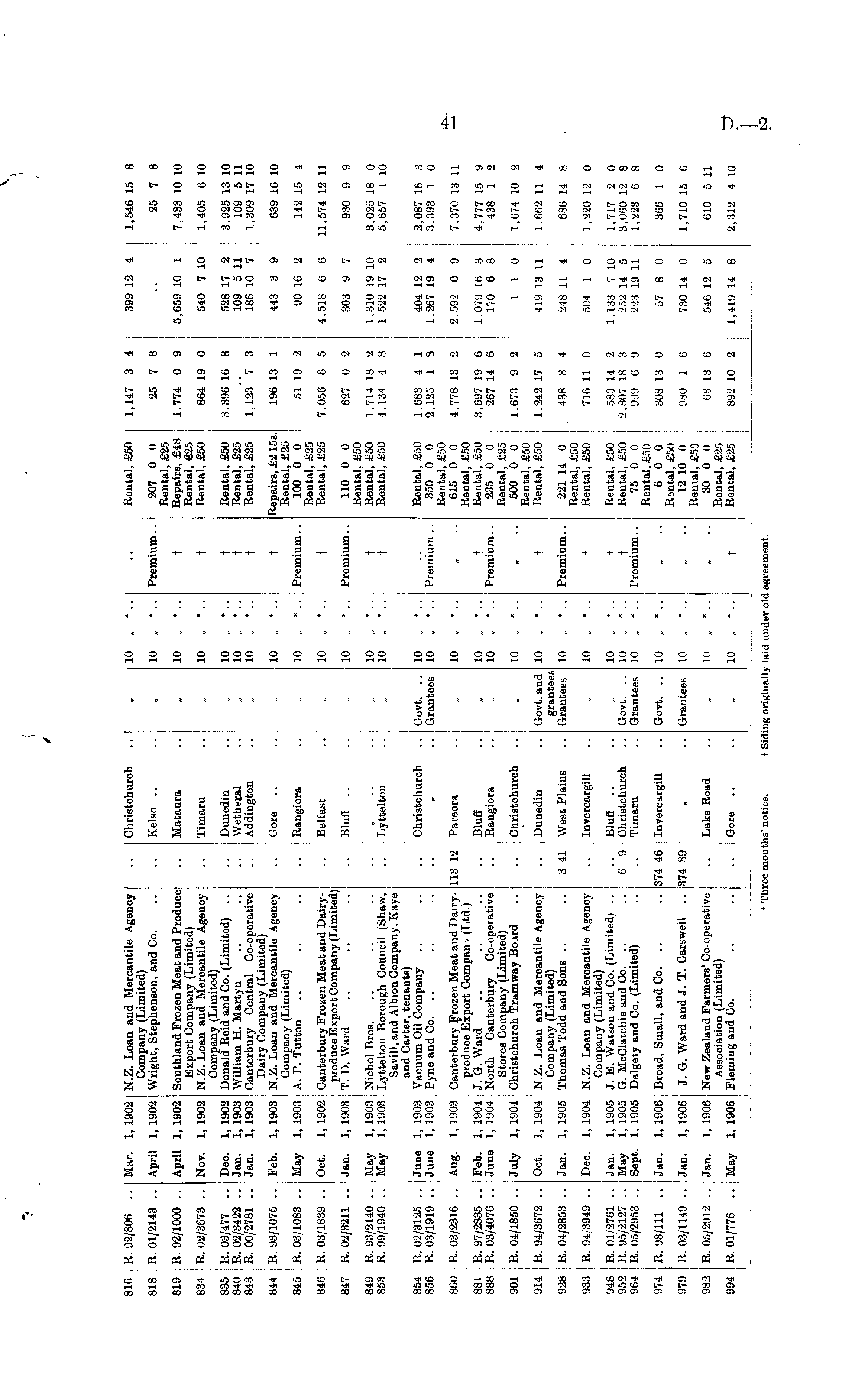 81C K. 92/806 .. Mar. 1, 1902 N.Z. Loan and Mercantile Agency | Company (Limited) Wright, Stephenson, and Co. .. i •• Christchurch I 10 „ ' .. 10 * Rental, £50 I 1,147 3 4 399 12 4 1,546 15 8 818 R. 01/2143 .. April 1, 1902 Kelso .. 10 „ ' .. 10 * Premium.. 207 0 0 25 7 8 Rental, £25 Repairs, £48 1.774 0 9 Rental, £25 Rental, £50 864 19 0 25 7 8 819 J R. 92/1000 .. April 1, 1902 Southland Frozen Meat and Produce Export Company (Limited) N.Z. Loan and Mercantile Agency Company (Limited) Donald Reid and Co. (Limited) .. William H. Martyn Canterbury Central Co-operative Dairy Company (Limited) N.Z. Loan and Mercantile Agency Company (Limited) A. P. Tutton Mataura I 10 „ * .. 10 t 5,659 10 1 7.433 10 10 83 -1 R. 02/3673 .. Nov. 1, 1902 .. Timaru 10 „ ' .. 10 t 540 7 10 1,405 6 10 835 B. 03/477 .. 840 R. 02/3422 .. 848 R. 00/2781 .. Dec. 1, 1902 Jan. 1, 1903 Jan. 1, 1903 Dunedin Wetheral Addington 10 „ * .. 10 „ • .. 10 „ * .. 10 10 10 * t t t Rental, £50 3.396 16 8 Rental, £25 Rental, £25 1,123 7 3 528 17 2 109 5 11 186 10 7 3,926 13 10 109 5 11 1,309 17 10 844 R. 93/1075 .. Feb. 1, 1903 " Gore 10 ., * .. 10 t Repairs, £2 15s. 196 13 1 Rental, £25 100 0 0 51 19 2 Rental, £25 Rental, 625 7.050 6 5 443 3 9 639 16 10 S45 K. 03/1083 .. May 1, 1903 Rangiora 10 „ * .. 10 Premium.. 90 16 2 142 15 4 84G j R. 03/1839 .. Oct. 1, 1902 Canterbury Frozen Meat and Dairyproduce Export Company (Limited) T. D. Ward .. .. Belfast 10 „ * .. 10 * t 4.518 6 6 11,574 12 11 847 R. 02/3211 .. Jan. 1, 1903 .. Bluff .. .. 10 Premium.. 110 0 0 627 0 2 Rental, £50 Rental, £50 1,714 18 2 Rental, £'50 4.134 4 8 303 9 7 930 9 9 84!) R. 93/2140 .. 853 R. 99/1940 .. May 1, 1903 May 1, 1903 Niohol Bros. Lyttekon Borough Council (Shaw, Savill.and Albion Company, K;iye and Carter, tenants) Vacuum Oil Company Pyne and Co. i •• Lyttelton ! 10 .. ' .. .. I „ 10 . • .. 10 10 * t t 1,310 19 10 1.522 17 2 3.025 18 0 5.057 1 10 854 B. 0-2/3125 .. 856 J R. 03/1919 .. June 1, 1903 June 1, 1903 Christchurch .. Govt. .. 10 . • .. .. Grantees 10 „ 10 10 * Premium .. Rental, £50 1,683 4 1 350 0 0 2.125 1 3 Rental, £50 615 0 0 4,778 13 2 Rental, £50 Rental, £50 3,697 19 6 235 0 0 267 14 6 Rental, £25 500 0 0 1.673 9 2 Rental, £50 Rental, £50 1.242 17 5 221 14 0 438 3 4 Rental, £50 Rental, £50 716 11 0 404 12 2 1.267 19 4 2,087 16 3 3.393 1 0 I 860 R. 03/2316 .. Aug. 1, 1903 Canterbury Frozen Meat and Dairyproduce Export Companv (Ltd.) J. G Ward North Canterbury Co-operative Stores Company (Limited) Christchurch Tramway Bo *rd 113 12 Pareora 10 „ * .. 10 2.592 0 9 7,370 13 11 881 R. 97/2835 .. 888 B. 03/4076 .. Feb. 1, 1904 June 1, 1904 BluS Rangiora 10 „ ' .. 10 „ ' .. 10 10 * t Premium.. 1.079 16 3 170 6 8 4.777 15 9 438 1 2 901 B. 04/1850 .. July 1, 1904 Christchurch 10 . * .. 10 1 1 0 1.674 10 2 914 K. 94/3672 .. Oct. 1, 1904 N.Z. Loan and Mercantile Agency Company (Limited) Thomas Todd and Sons 3 41 Dunedin West Plaius .. Govt. and 10 „ * .. grantees .. Grantees 10 „ * .. 10 * t Premium.. 419 13 11 1.662 11 4 928 j R. 04/2853 .. Jan. 1, 1905 10 * 248 11 4 686 14 8 933 j R. 94/3949 .. 948 R. 01/2761 .. 952 R. 95/2127 .. 964 R. 05/2953 .. Dec. 1, 1904 Jan. 1, 1905 May 1, 1905 Sept. 1, 1905 N.Z. Loan and Mercantile Agency Company (Limited) J. E. Watson and Co. (Limited) .. G. MeClatchie and Co. Dalgety and Co. (Limited) i 6"g Invercargill BluS .. Christchurch Timaru 10 „ * .. 10 „ * .. .. Govt. .. 10 „ *.. .. Grantees 10 „ * .. 10 10 10 10 * t t t Premium.. Rental, £50 583 14 2 Rental, £50 2,807 18 3 75 0 0 999 6 9 Rental, £50 6 0 0 308 13 0 Rsntal, £50 12 10 0 980 1 6 Renial, £50 30 0 0 63 13 6 Rental, £25 Rental, £25 892 10 2 504 1 0 1.133 7 10 252 14 5 223 19 11 1,220 12 0 1,717 2 0 3,060 12 8 1,223 6 8 974 j R. 98/111 .. Jan. 1, 1906 Broad, Small, and Co. 374 46 Invercargill .. Govt. .. 10 „ • .. 10 * 57 8 0 366 1 0 979 R. 03/1149 .. Jan. 1, 1906 J. G. Ward and J. T. Carswell .. 374 39 .. Grantees 10 „ * .. 10 * 730 14 0 1,710 15 6 982 R. 05/2912 .. Jan. 1, 1906 New Zealand Farmers' Co-operative Association (Limited) Fleming and Co. .. .. Lake Road Gore 10 „ ' .. 10 „ * .. 10 540 12 5 610 5 11 994 R. 01/776 .. May 1, 1906 10 * t 1,419 14 8 2,312 4 10 l_ _J •Thi ree moutl hs' notice. t Siding originally laid under oil agreement.