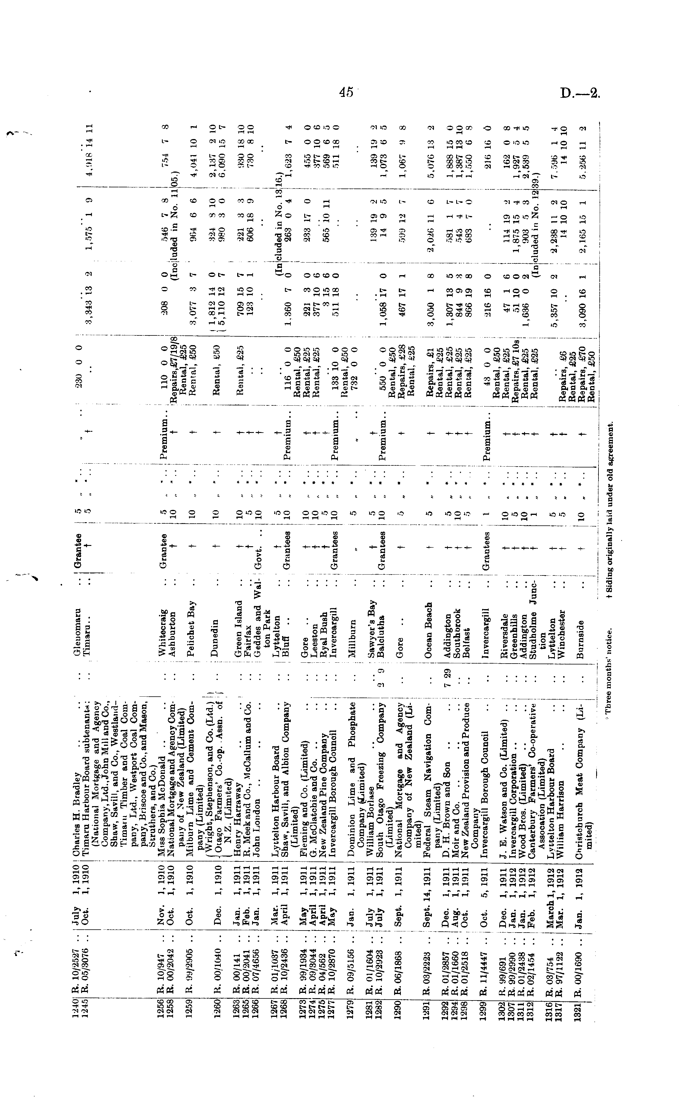 1240 1245 1256 1258 1259 1260 1263 1265 1266 1267 1268 1273 1274 1275 1277 R. 10/947 .. Nov. 1,1910 R. 00/2042 .. Oct. 1, 1910 R. 9y/2905 .. Oct. 1, 1910 R. 00/1040 .. Dec. 1, 1910 R. 00/141 .. Jan. 1,1911 R. 00/2041 .. Feb. 1, 1911 R. 07/4656 .. j Jan. 1, 1911 R. 01/1037 .. i Mar. 1, 1911 R. 10/2436 .. April 1, 1911 R. 99/1934 .. May 1,1911 R. 09/3044 .. April 1, 1911 R. 04/562 .. April 1, 1911 R. 10/2870 .. I May 1, 1911 R. 10/12527 . . R. 05/3076 .. July Oct. 1, 1910 1, 1910 Charles H. Bradley .. .. .. Gleuomaru .. | Grantee 5 „ '.. „ .. : 230 0 0! Timaru Harbour Board subtenants: .. Timaru.. .. t 5 „ ".. f .. 3,343 13 2 1,575 1 9 4,!)18 14 11 (National Mortgage and Agency Company, Ltd., John Mill and Co., Shaw, Savili, and Co., WestlamlTimaru Timber and Coal Company, Ltd., Westport Coal Company, Briscoe and Co., and Mason, Struthers, and Co.) Miss Sophia McDonald .. .. .. VVhitecraig .. Grantee 5 . *.. Premium.. 110 0 0 208 0 0 546 7 8 754 7 8 National Mortgage and Agency Com- .. Ashburton .. t 10 „ * .. t Repairs,£7/19/8 (Inc luded in No ll!05 ) pany of New Zealand (Limited) Rental £25 Milburn Lime and Cement Com- .. ; Pelichet Bay .. f 10 „ • .. f Rental, £50 3,077 3 7 964 6 6 4 041 10 1 pany (Limited) /Wright Stepuenson, and Co. (Ltd.) i ; Dunedin + in t Ram , ,., n I 1,812 14 0 324 S 10 2,137 2 10 Oiago Farmers' Co.-op. . Assn. of , " i Uat > e<i ' a ■■ 10 ... Rental, 450 i g n0 12 7 < )fi0 3 () 609015 7 I N.Z. (Limited) Henry Harraway .. .. | .. Green Island .. f 10 „ • .. f Rental, £25 709 15 7 221 3 3 930 18 10 R. Meek and Co., McCallum and Co. .. Fairfax .. f 5 „ *.. f .. 123 10 1 606 18 9 730 8 10 John London .. .. .. .. Geddes and Wai- Govt. .. 10 „ • .. ton Park Lyttelton Harbour Board .. .. Lyttelton .. f 5 ,. * .. t .. (In eluded in No. 1316.) Shaw, Savili, and Albion Company .. Bluff .. .. Grantees 10 „ ".. Premium..! 116 0 0 1.360 7 0 263 0 4 1,623 7 4 (Limited) Rental, £50 Fleming and Co. (Limited) .. .. Gore .. .. f 10 „ • .. t Rental, £25 221 3 0 233 17 0 455 0 0 G. MoClatchie and Co. .. .. .. Leeston .. f 10 ,. * .. t Rental, £25 377 10 6 .. 377 10 6 New Zealand Pine Company .. .. Ryal Bush .. f 5 „ * .. .. 3 15 6 565 10 11 569 6 5 Invercargill Borough Council .. .. Invercargill ..Grantees 10 „ *.. Premium.. 133 10 0 511 18 0 .. 51118 0 Rental, £50 Dominion Lime and Phosphate .. ; Millburn .. „ 5 , • .. „ .. 732 0 0 Company (iLimited) William Boriase .. .. .. Sawyer's Bay .. f | 5 „ *.. f .. .. 139 19 2 139 19 2 South Otago Freezing Company 2 9 Balclutha ' .. Grantees 10 „ *.. Premium.. 550 0 0 1,058 17 0 14 9 5 I 073 6 5 (Limited) Rental, £50 National Mortgage and Agency .. Gore .. .. f 5 . '.. + Repairs, £28 467 17 1 599 12 7 1 067 9 S Company of New Zealand (Li- Rental. £25 mited) Federal Steam Navigation Com- .. Ocean Beach .. f 5 „ '.. f Repairs, £1 3,050 1 8 2,026 11 6 5,076 13 2 pany (Limited) Rental, £25 D. H. Brown and Son .. .. 7 29 Addington .. f 5 „ ♦.. f Rental, £25 1,307 13 5 581 1 7 1888 15 0 MoirandCo. .. .. .. .. Southbrook .. f 10 . • . t Rental, £25 844 9 3 543 4 7 1,387 13 10 New Zealand Provision and Produce [ .. Belfast .. f 5 » *.. f Rental, £25 866 19 8 683 7 0 1,550 6 8 Company Invercargill Borough Council .. .. Invercargill .. Grantees 1 „ *.. Premium.. 43 0 0 216 16 0 .. 2 US 16 6 Rental, £50 J. E. Watson and Co. (Limited) .. .. Riversdale .. f 10 . ' . . f Rental, £25 47 1 6 114 19 2 162 0 8 Invercargill Corporation .. .. .. Greenhills .. f 5 . *.. t Repairs, £710s 5110 0 1,875 15 4 1,927 5 4 Wood Bros. (Limited) .. .. .. Addington .. f 10 . • .. f Rental, £25 1,636 0 2 903 5 3 2.539 5 5 Canterbury Farmers' Co-operative .. Studholme June- f 1 „ *.. Rental, £25 (In eluded in No. 12 39.) Assocation (Limited) tion Lyttelton Harbour Board .. .. Lvttelton .. f 5 „ '.. t .. 5,357 10 2 2,238 11 2 7,596 1 4 William Harrison .. .. .. Winchester .. f 5 » '.. t ! Repairs, £6 .. 14 10 10 14 10 10 i Rental, £25 Ciristchurch Meat Company (Li- .. Btirnside .. t 10 „ V. f Repairs, £70 3,090 16 1 ' 2,165 15 1 5,256 11 2 mited) Rental, £50 4,918 14 11 1279 R. 09/5156 .. Jan. 1. 1911 1281 1282 R. 01/1604 .. July 1, 1911 R. 10/2923 .. July 1, 1911 1290 R. 06/1868 .. , Sept. 1, 1911 1291 R. 03/2223 .. : Sept. 14, 1911 R. 01/2857 .. Deo. 1, 1911 R. 01/1660 .. Aug. 1, 1911 R. 01/2518 .. Oct. 1, 1911 1292 1294 1298 1299 R. 11/4447 .. j Oct. 5, 1911 1302 1307 1311 1312 R. 99/691 .. Dec. 1, 1911 R. 99/2990 .. ! Jan. 1, 1912 R. 01/2438 .. ! Jan. 1, 1912 R. 02/1454 .. j Feb. 1, 1912 R. 03/754 .. March 1,1912 R. 97/1122 .. Mar. 1, 1912 1316 1317 1321 R. 00/1690 .. Jan. 1, 1912 I Puree months' notice. t Siding originally laid under old agreement.